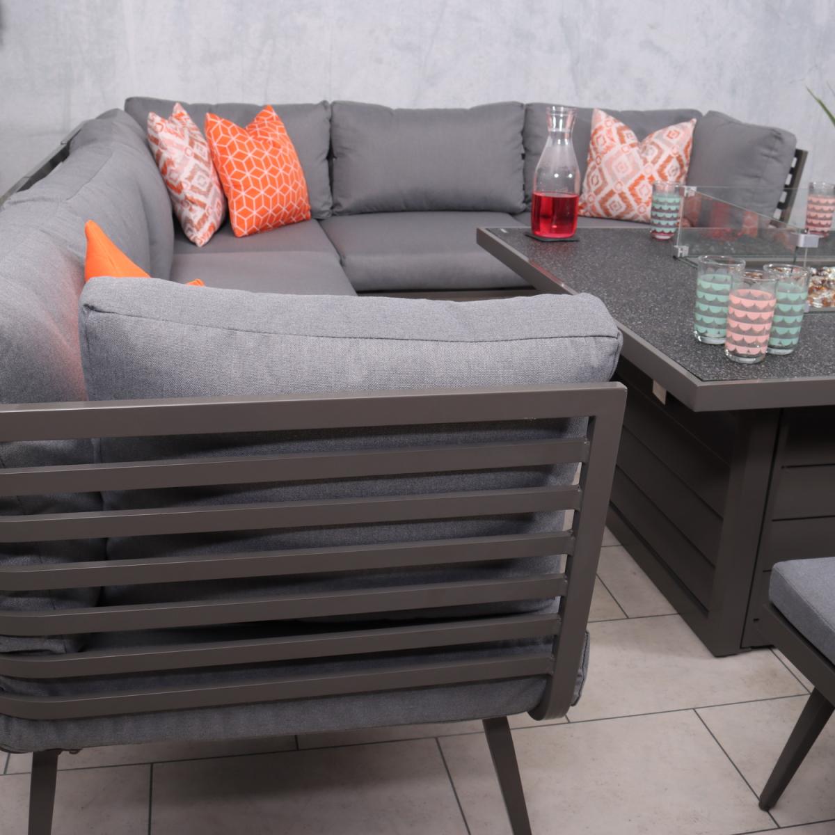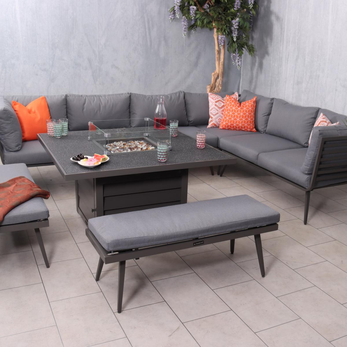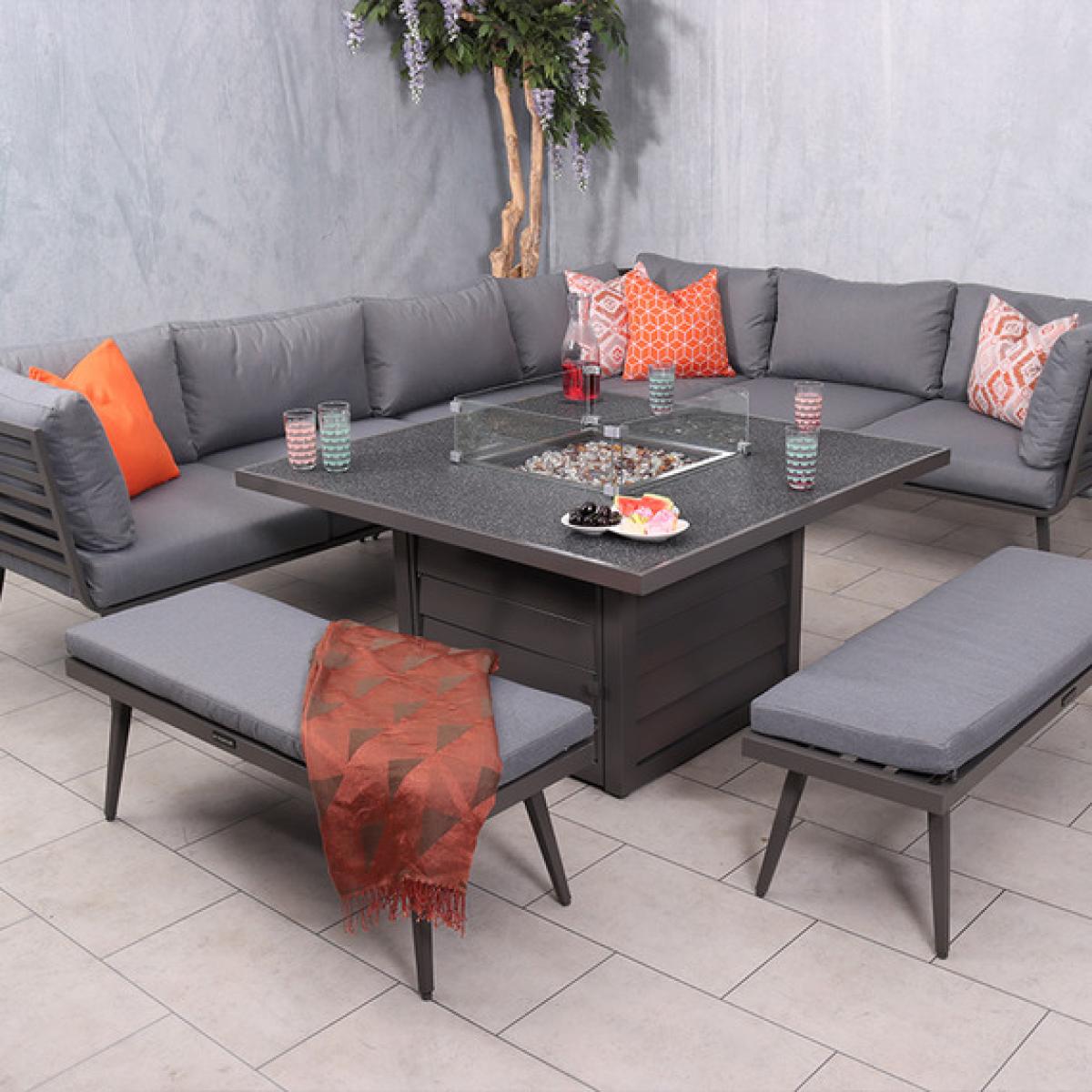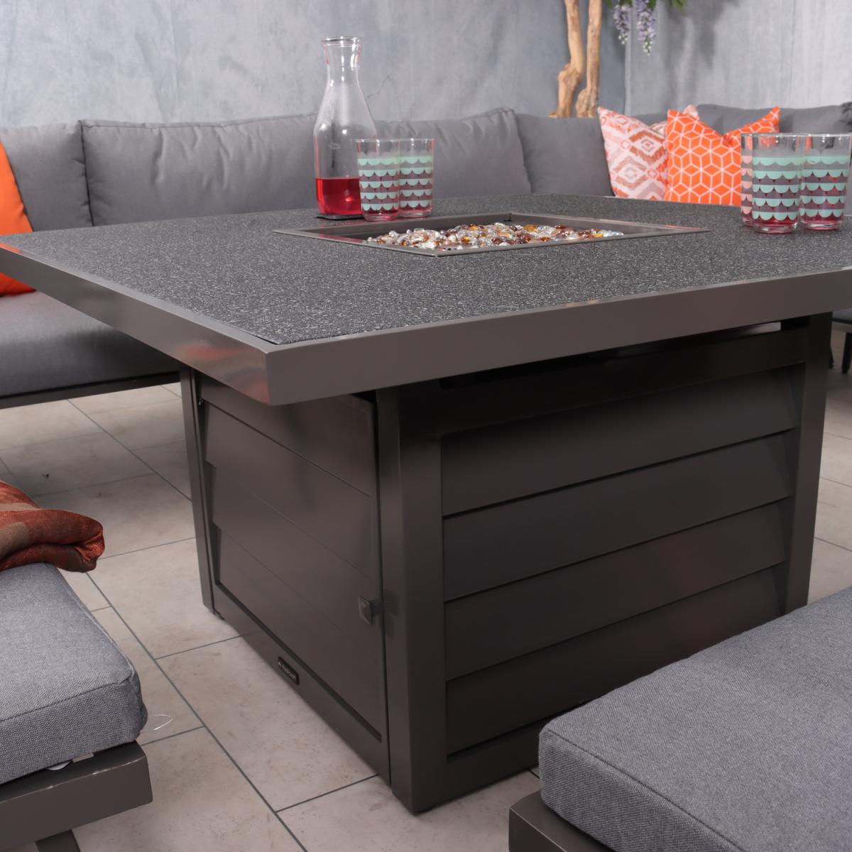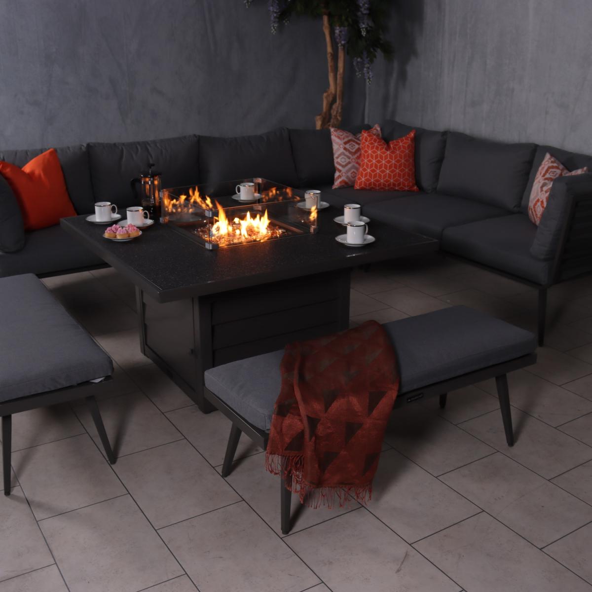 Make a statement in your garden with the Mayfair Corner Lounging Set Firepit Grey collection. This Mayfair fire pit corner dining set brings the warmth from inside to outdoors making it usable all year round. From an afternoon in the sun to evening drinks, this set is perfect for those who enjoy being outdoors throughout the seasons. The table is simply operated with a dial on the side panel of the table, the gas tank (not included) is hidden away in the base of the table which can be pulled out to insert the gas tank in. The fire pit table features a 15cm glass surround for safety away from the flame along with firestones which are included when purchasing. There is a spraystone glass cover plate included which we recommend putting on when the table is not in use, it is very important that you do not put on the cover plate until the internal gas burner has cooled down. We recommend using a 5kg gas bottle when using this table.