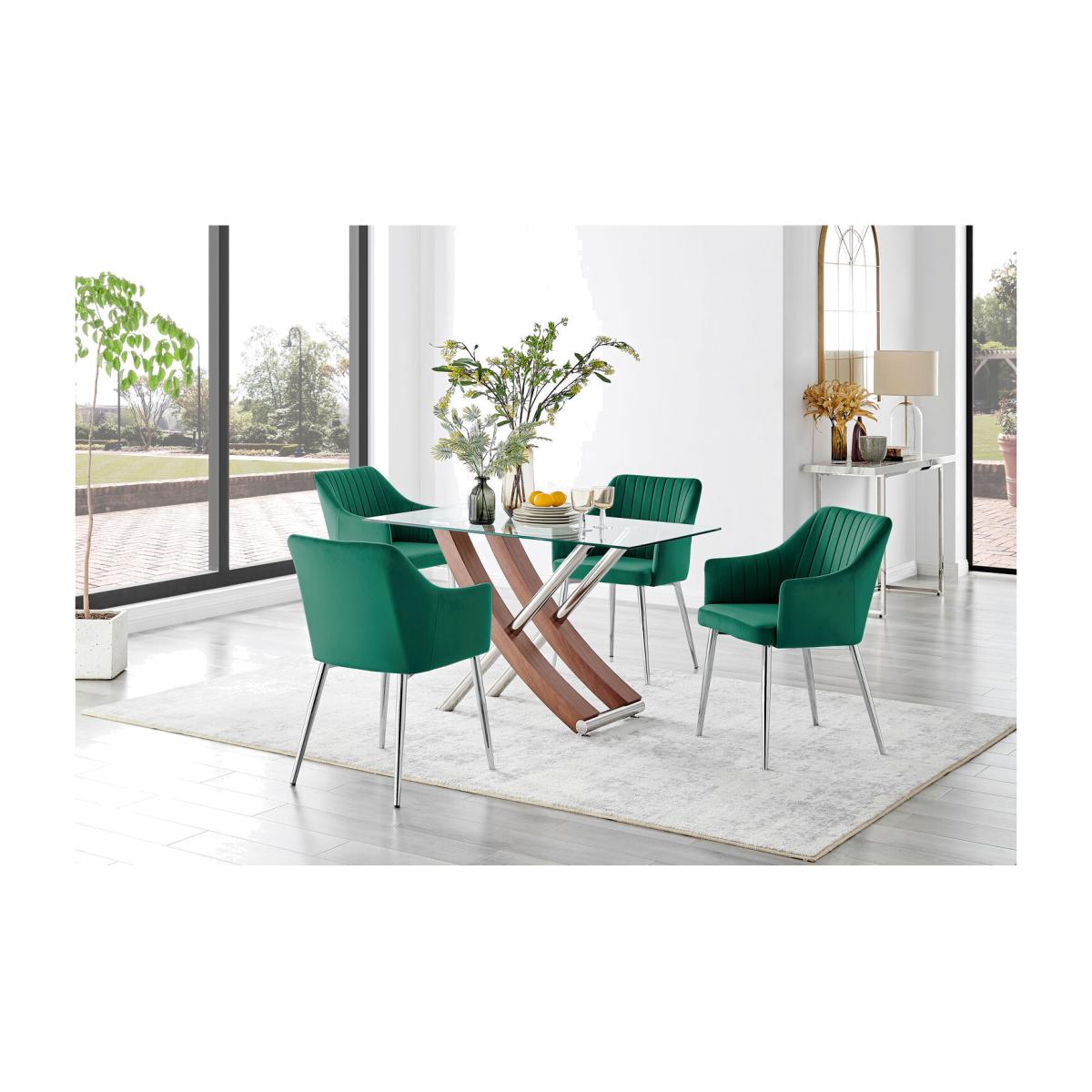 Mayfair Glass and Brown Wood Effect Dining Table and 4 Calla Silver Leg Chairs - Green