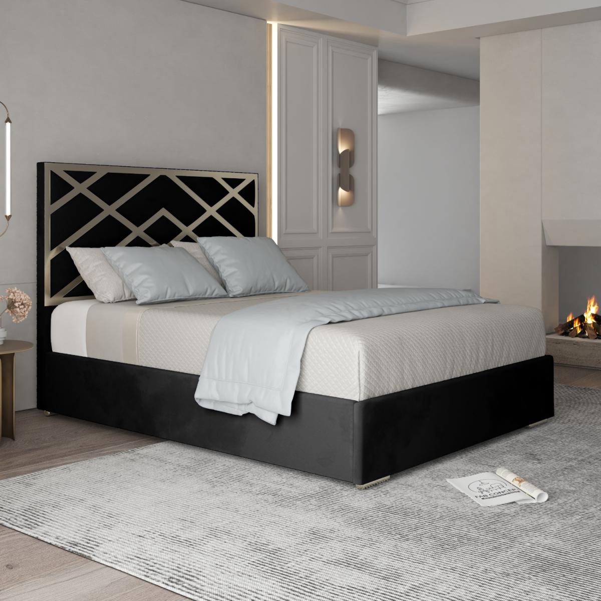 Stylish modern geometric design. Best seller and a real show stopper. Available in a choice of metal finishes. Brushed gold or brushed silver as standard and can also upgrade to mirror gold or mirror silver. The headboard is panelled and boasts a generously padded. The footboard is detailed with pipe feet to match brushed silver or gold legs to match brushed gold. The bed is supplied with solid platform boards for extra support.