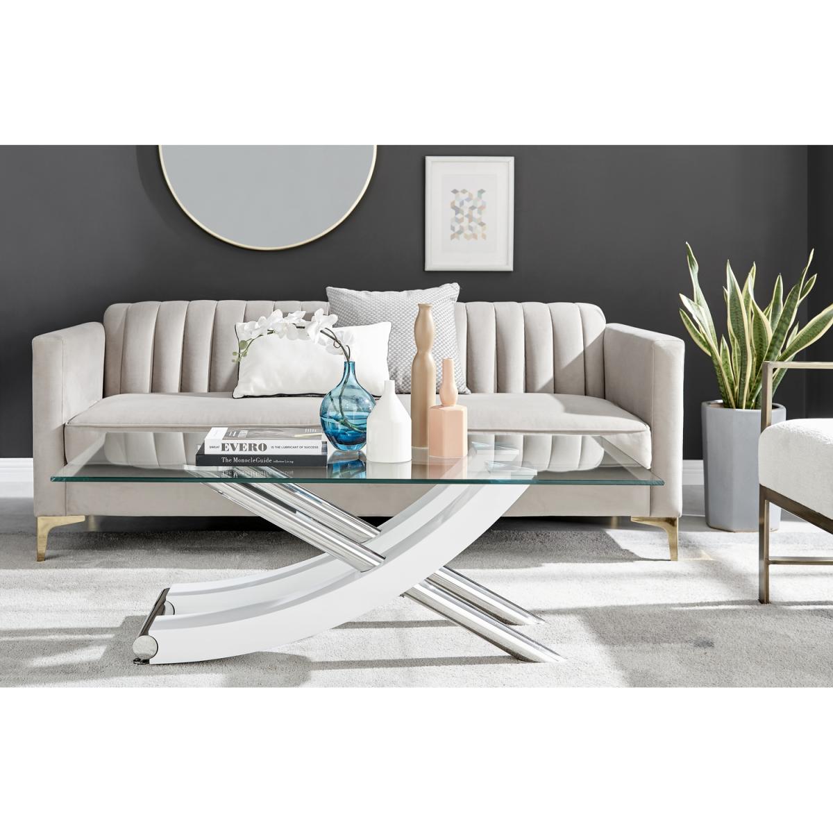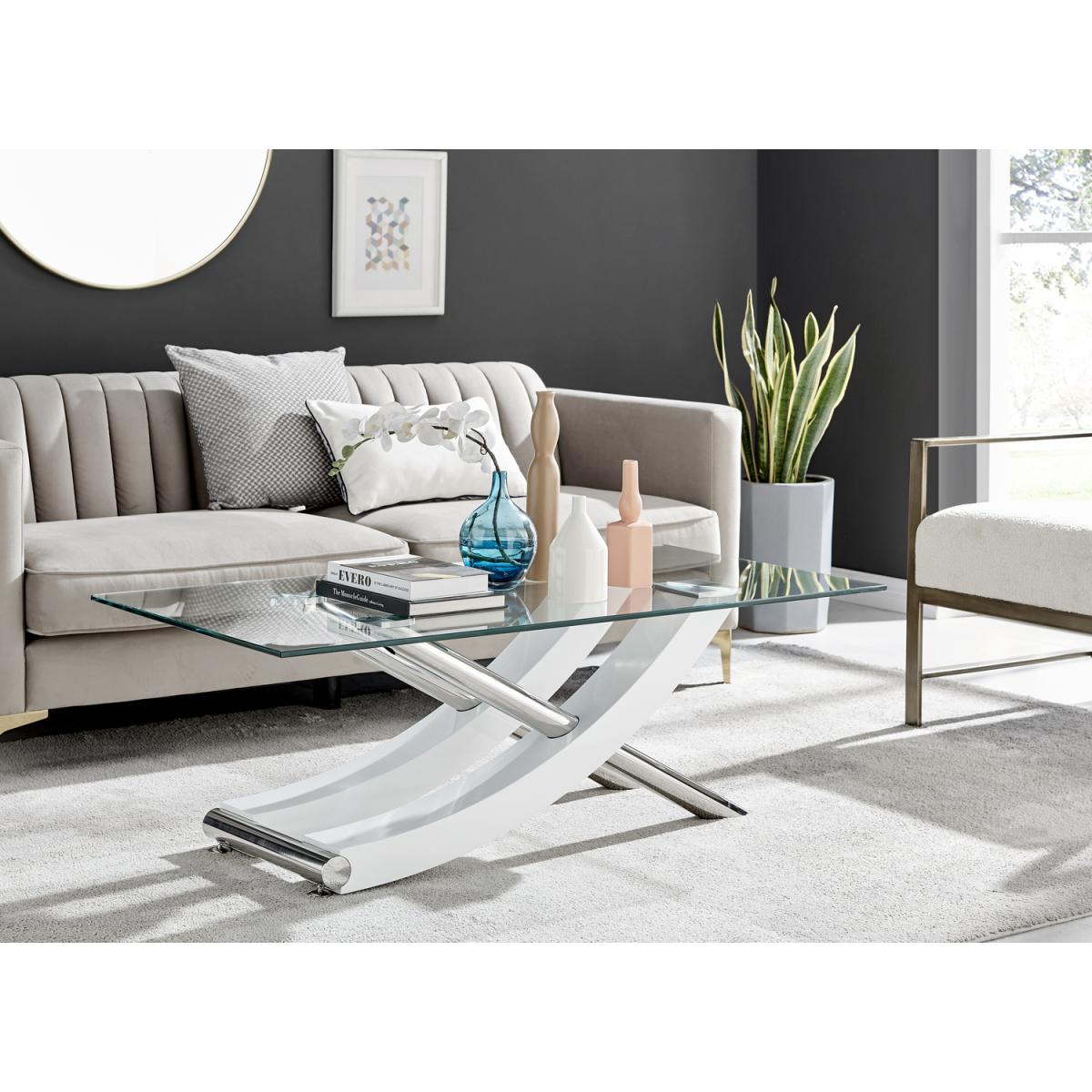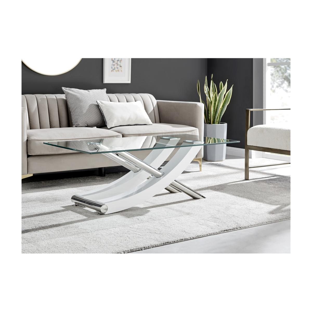 With a unique design and high quality finish throughout, the Mayfair coffee table really is a must have! The coffee table is a stunning combination of glass, white high gloss and shiny chrome metal, with the legs forming a gorgeous sweeping curved cross. Boasting a 120x60cm surface, there's plenty of room for keeping all your living room essentials organised and tidy. Plus room for that all-important cup of tea!Finished to the highest standards, and featuring easy wipeclean surfaces that will keep your coffee table looking brand new for years to come! Make this the centrepiece of your living room today. Matching dining sets available, and the coffee table also available with a brown wood veneer finish.