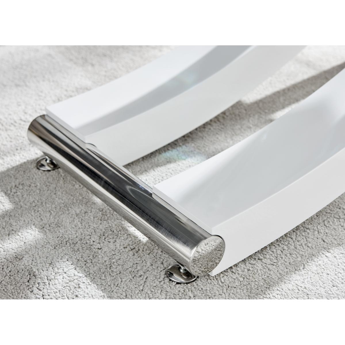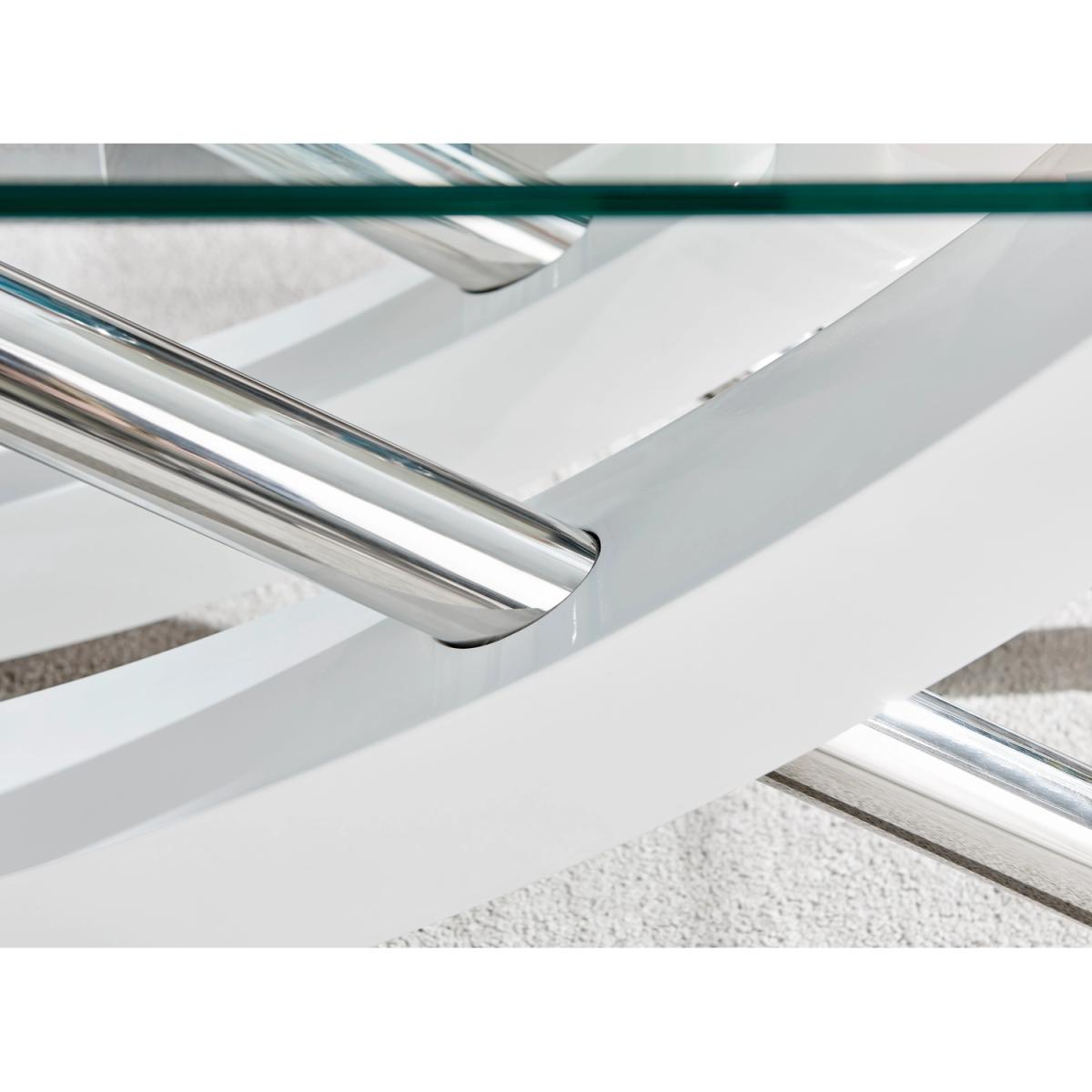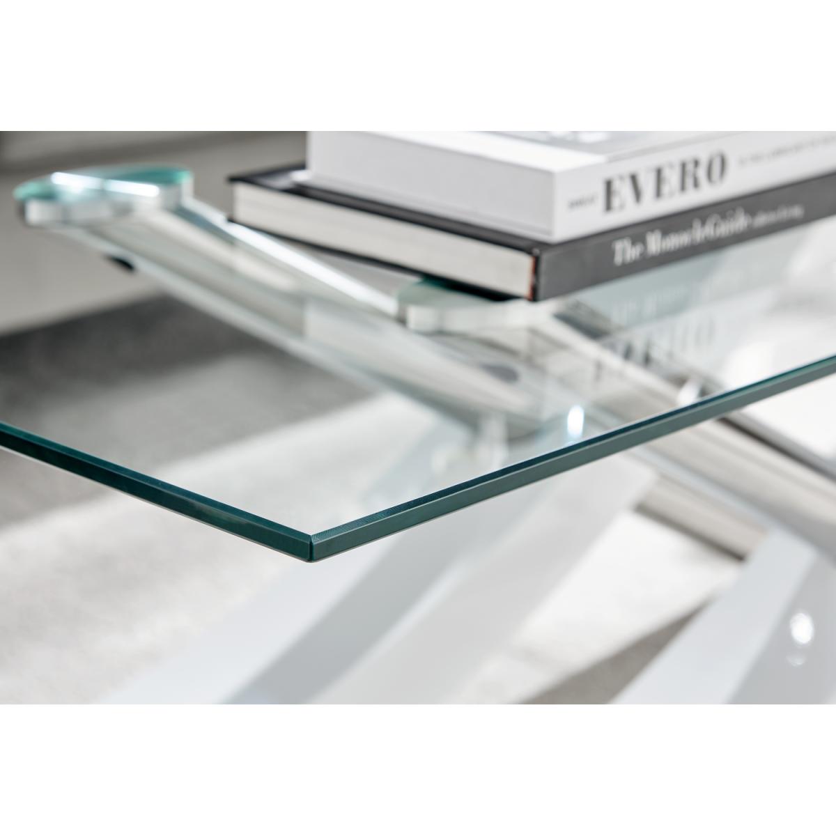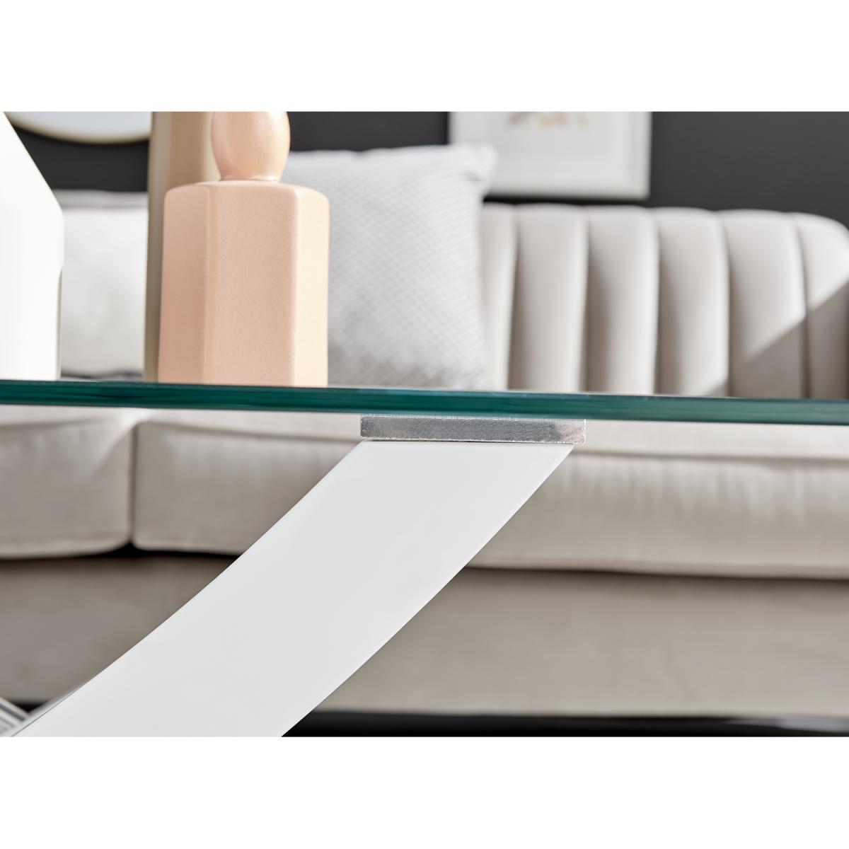 With a unique design and high quality finish throughout, the Mayfair coffee table really is a must have! The coffee table is a stunning combination of glass, white high gloss and shiny chrome metal, with the legs forming a gorgeous sweeping curved cross. Boasting a 120x60cm surface, there's plenty of room for keeping all your living room essentials organised and tidy. Plus room for that all-important cup of tea!Finished to the highest standards, and featuring easy wipeclean surfaces that will keep your coffee table looking brand new for years to come! Make this the centrepiece of your living room today. Matching dining sets available, and the coffee table also available with a brown wood veneer finish.