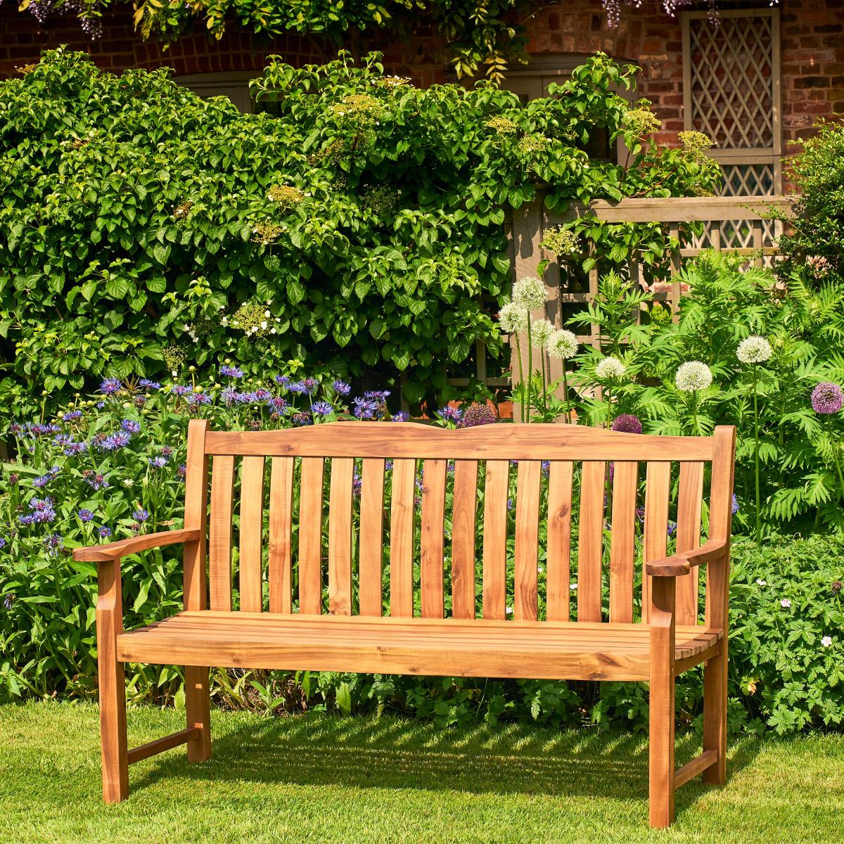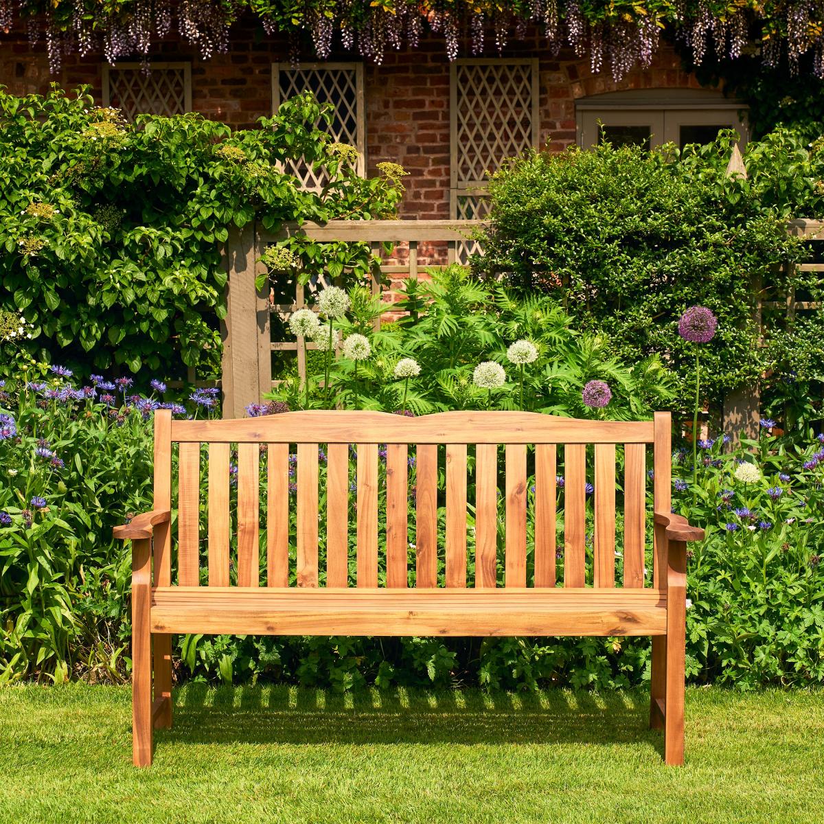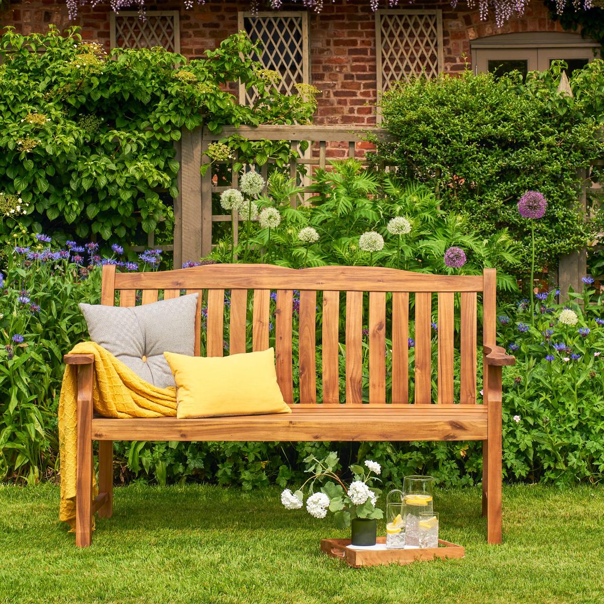 I love this bench because of its versatile, classic design and sturdy construction, making it perfect for outdoor settings. It works well in traditional and cottage gardens, but also offers a natural touch to modern patio spaces. Practical styling tips include pairing it with bright or pastel cushions to invite relaxation or placing it amidst lush greenery to enhance its organic appeal. For a cohesive look, complement it with matching wooden accessories or vintage-inspired decor. This piece is not only functional but also adds warmth and charm to any outdoor retreat.