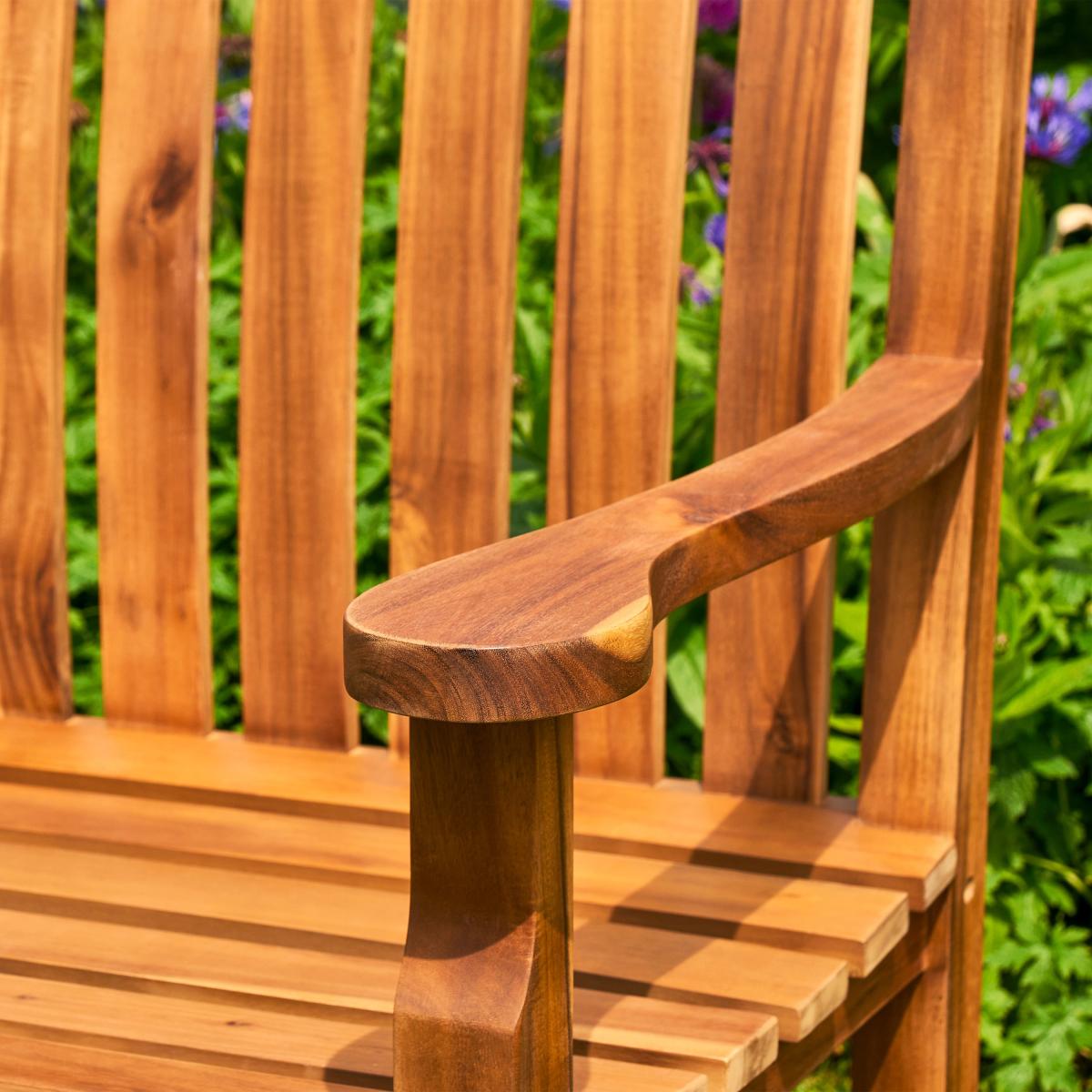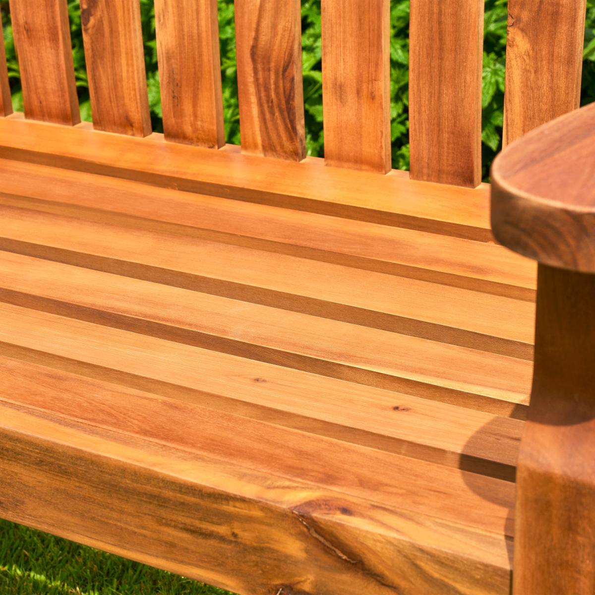 * Teak effect bench * Curved backrest * Deep seat * Weather resistant This three-seat bench offers exceptional comfort with its high curved backrest, deep seating, and armrests, making it a perfect spot for relaxation. Constructed from FSC certified Acacia wood in a Teak-look finish, it brings timeless elegance to your outdoor area while also being environmentally conscious. The bench’s durable and weather-resistant wood ensures long-lasting quality.