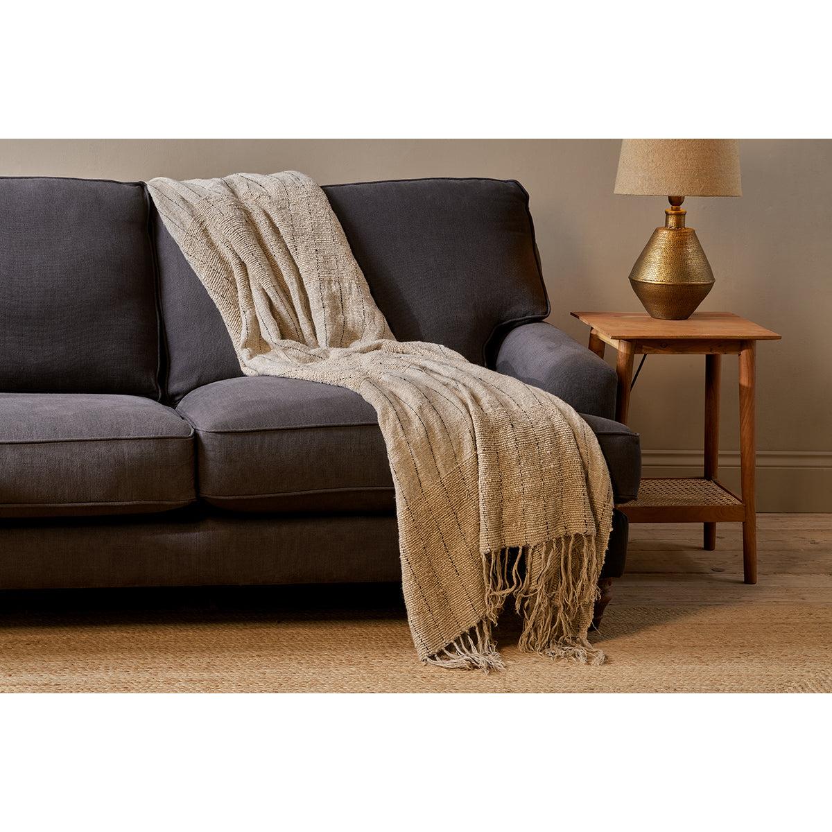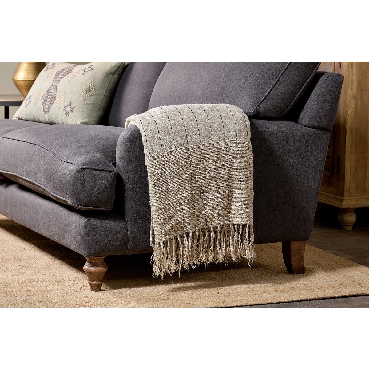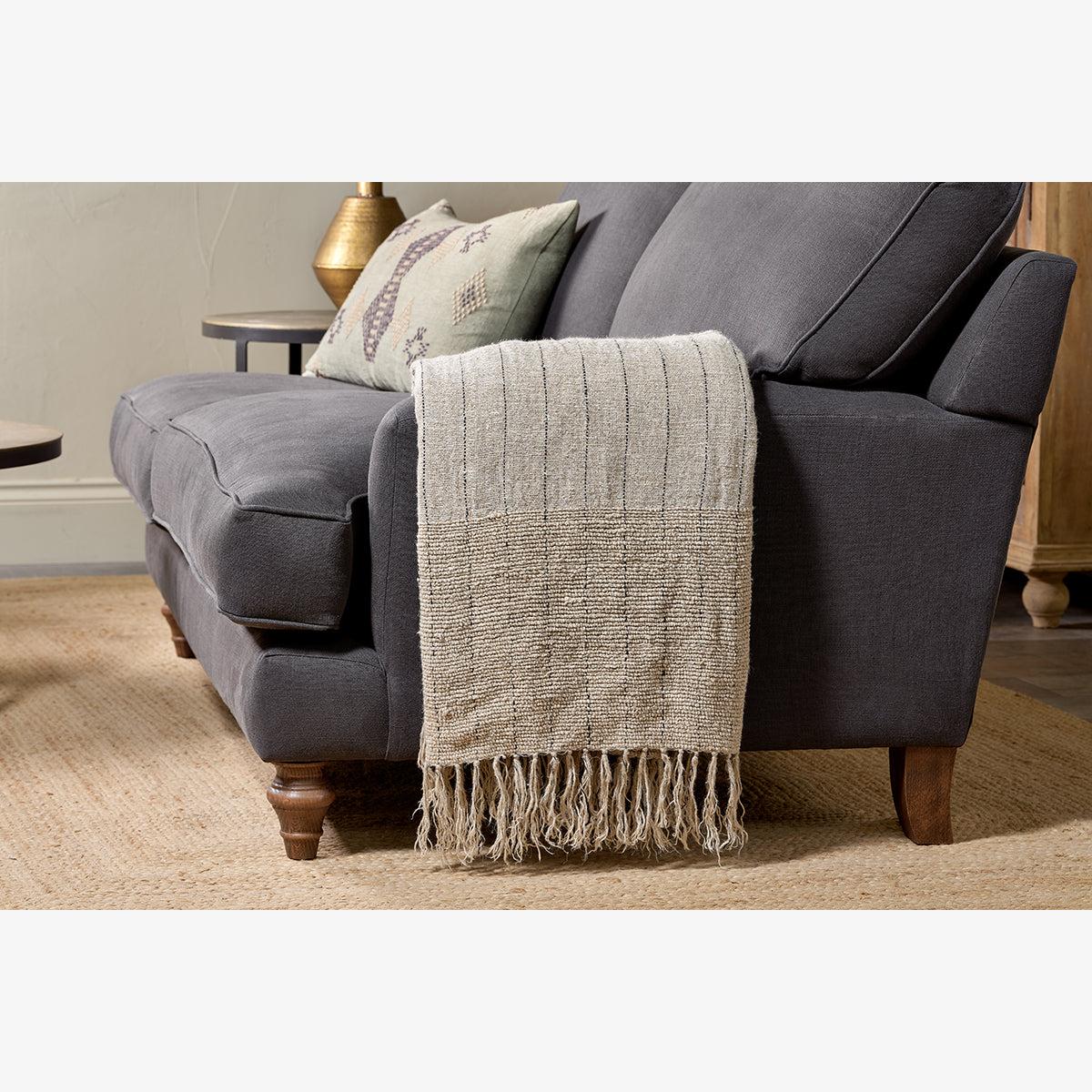 The subtle texture of this tactile cotton and linen Mayla throw is enhanced by the neutral tones and faint charcoal stitching work. Layer across the back of a sofa or armchair. Style with our Mayla cushions.