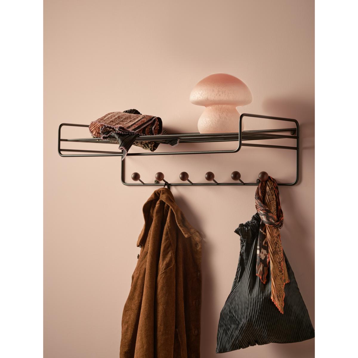 I’m a fan of the Bill rack because its slim, wall-mounted frame combines a shelf and six wooden-ball hooks without eating into floor space. The matte black metal and dark-brown accents suit modern, Scandi-inspired or industrial hallways, and the minimal profile keeps things feeling light. To style it, mount at shoulder height in your entryway, then top the shelf with a low tray for wallets or a small potted plant. Hang coats, umbrellas or a row of hats on the hooks - try grouping colours or mixing textures (wool, leather) for visual interest. In colder months you can stack folded scarves or gloves on the shelf, and come spring swap in hats and lightweight bags. Matched with black-trimmed mirrors or a simple bench below, it’ll pull the whole space together.
