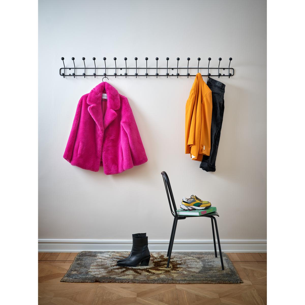 I really like this coat stand for its sleek and minimalist design, making it a versatile piece for various interiors. The horizontal layout extends practicality, providing ample space for coats, scarves, and bags without cluttering the entryway. Its black finish lends a contemporary feel that works well in modern, Scandinavian, or even industrial spaces. To style it effectively, consider grouping it with other monochrome or natural elements, like wooden benches or woven baskets, to create a cohesive look. It's especially useful in smaller hallways or mudrooms where space is at a premium, offering both function and a clean aesthetic.