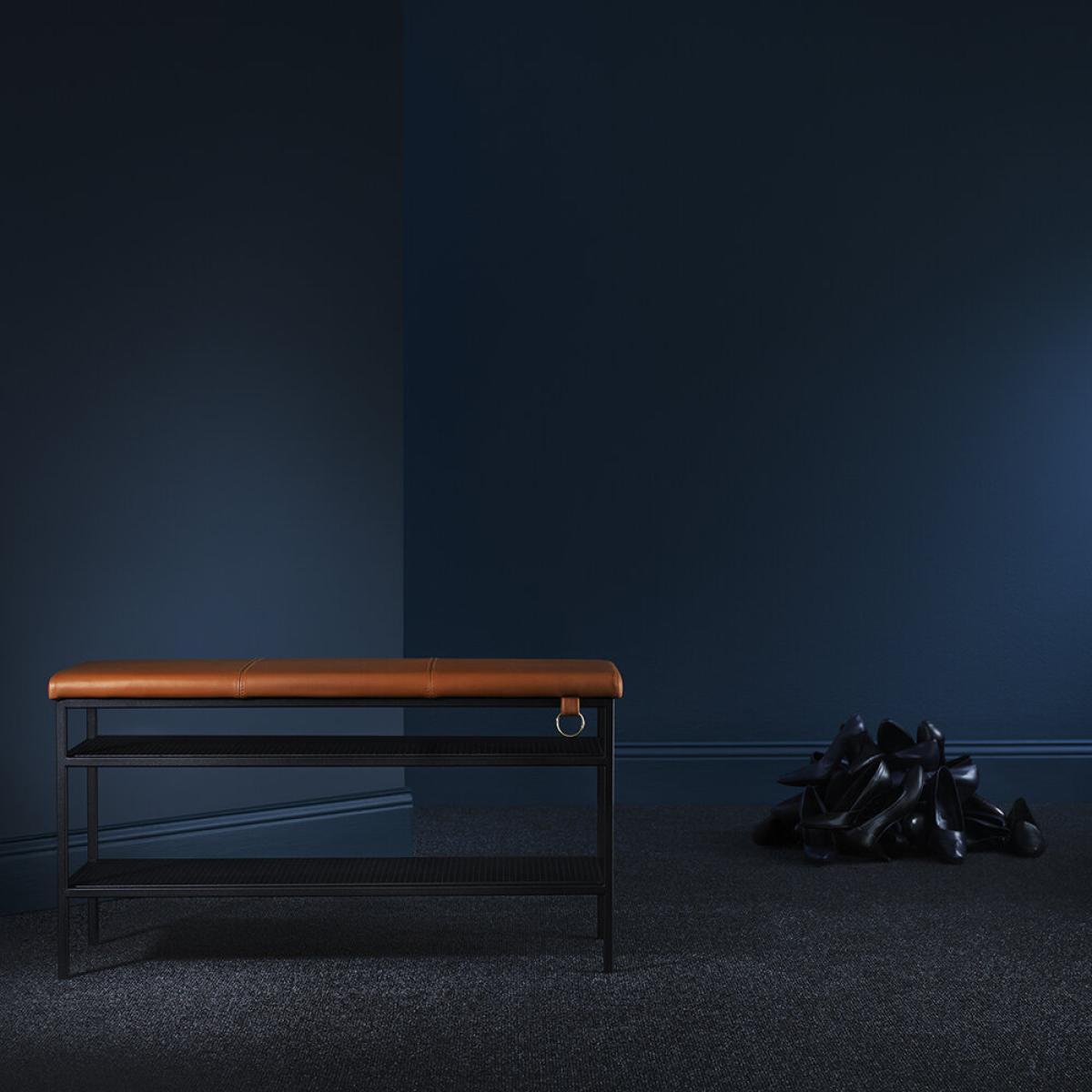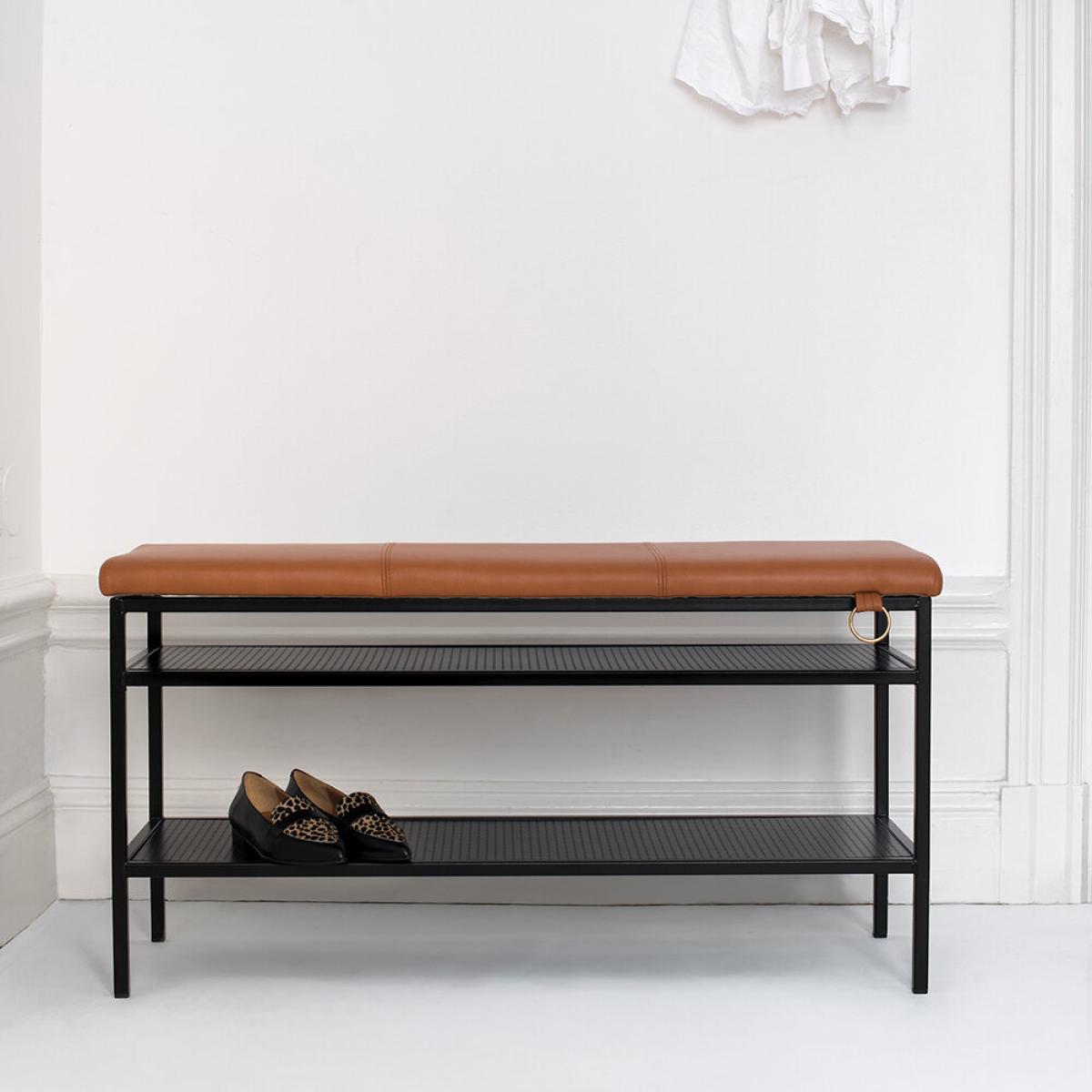 Seating and storage in one? Meet the Nancy bench from Maze Interiors. A wonderful addition to a dining room or hallway, this multitasking design works as a shoe shelf or an elegant bench. Made of perforated sheet metal and naturally tanned leather, the seat is available in both brown and black tones. Key features: * Material: recycled metal, leather * Dimensions: H49xW91.5xD32cm * Black and brown colour * Two shelves * Designed by Louise Hederström * Made in Sweden