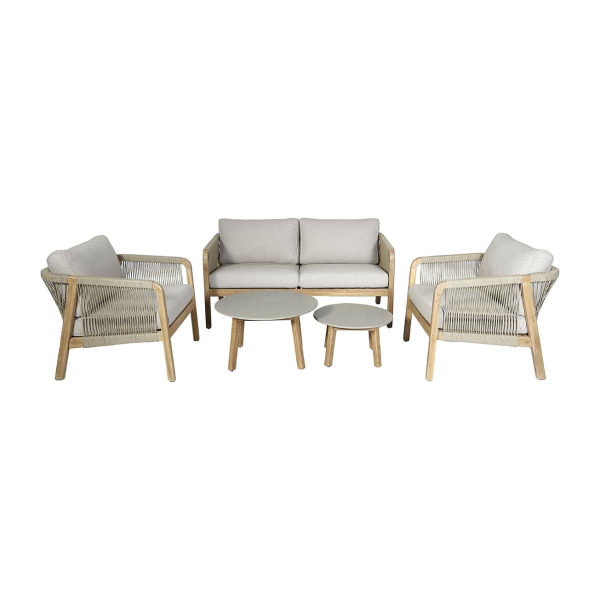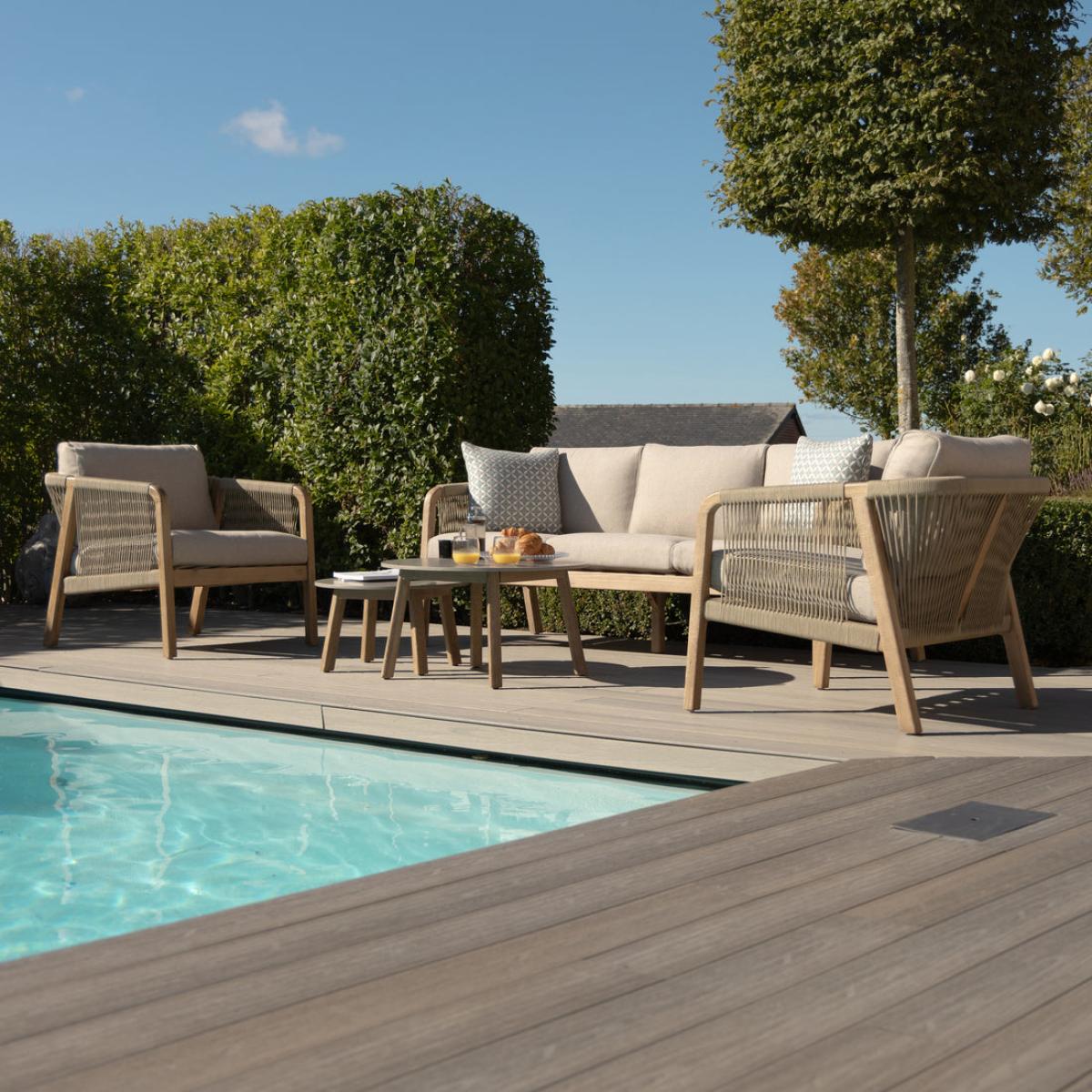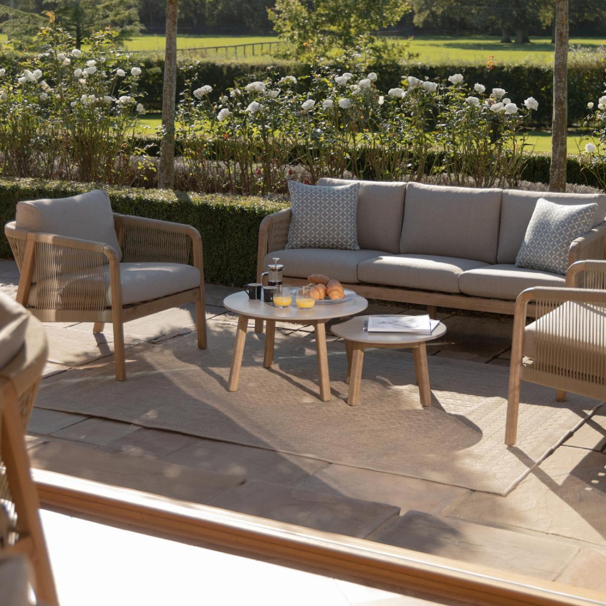The Maze Martinique Lounge Set features sturdy wooden framework composed of sustainably sourced Acacia wood finished with a vintage light teak look. The framework comes with adjustable feet to ensure it sits perfectly level on any surface and is wrapped with an intricately intertwined taupe round polypropylene rope, this beautifully designed structure can be left outside all year round. Whilst we would recommend storing the cushions away in the wetter months, they feature a high-performance olefin material which is both water and stain-resistant. The comfortable and detailed two seat sofa and armchairs and paired with nesting coffee tables that include a wooden base and are complete with striking concrete-composite table-top. The charming design of the Martinique range lends itself to both indoor and outdoor settings, the elegant characteristics echo a style that would suit an outdoor setting as equally as it would enhance your orangery, conservatory, or any internal space. Please note: Acacia wood will weather to a soft grey over time. Small cracks and fissures may develop with changes in humidity and temperature. This is a natural characteristic of solid wood furniture. Character and grain of the wood will vary for each piece.