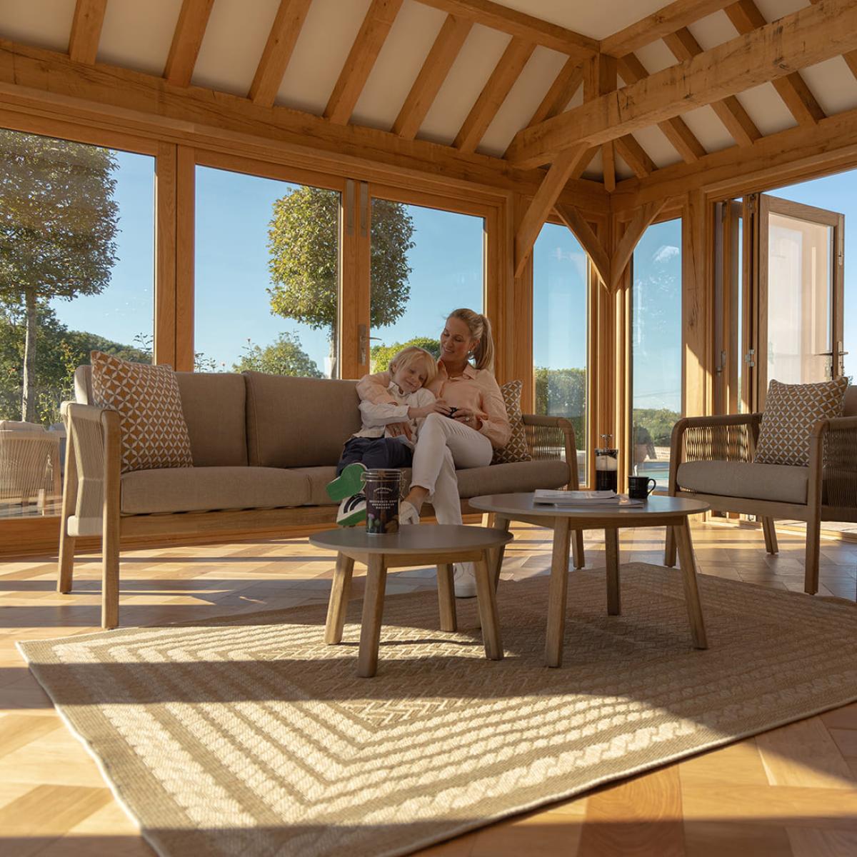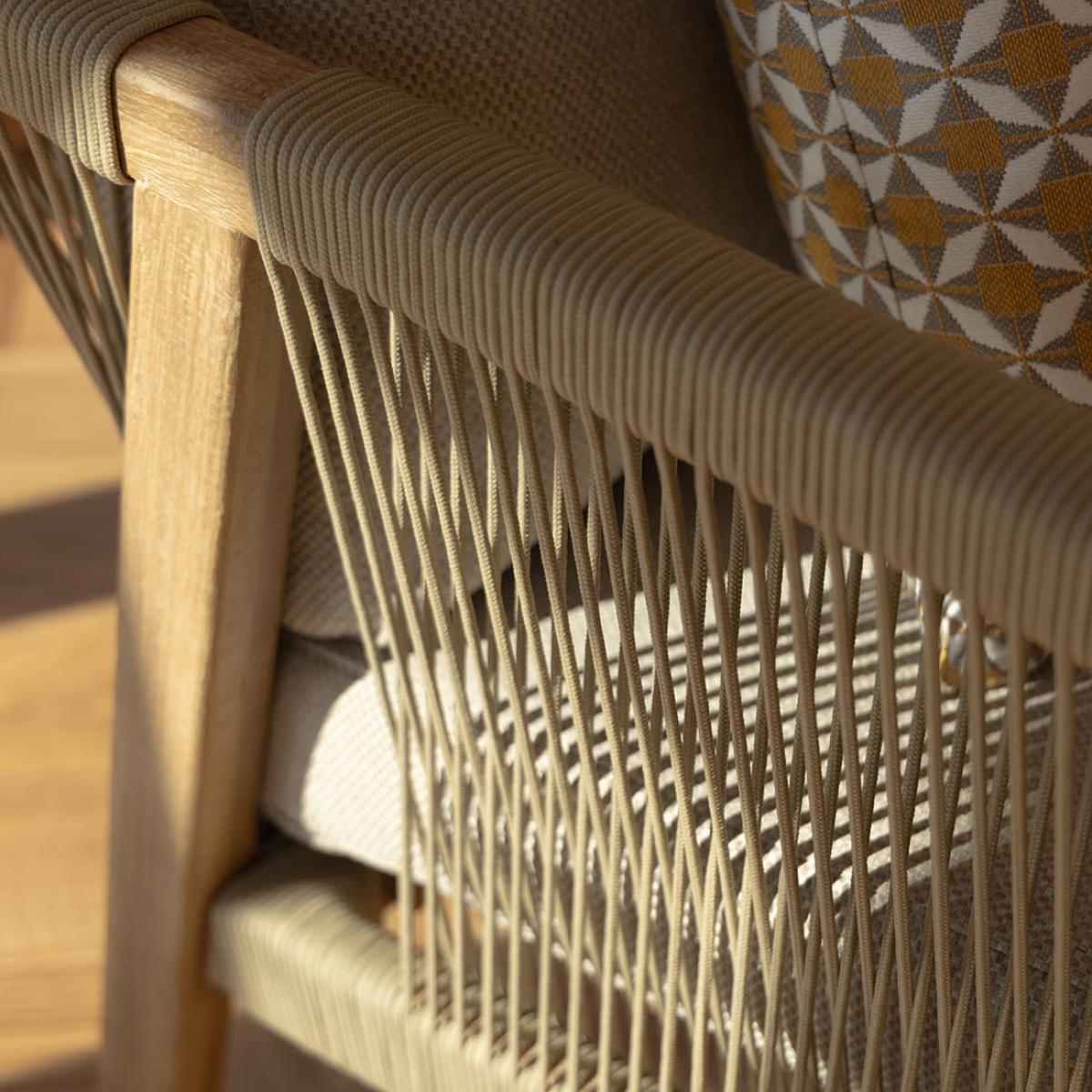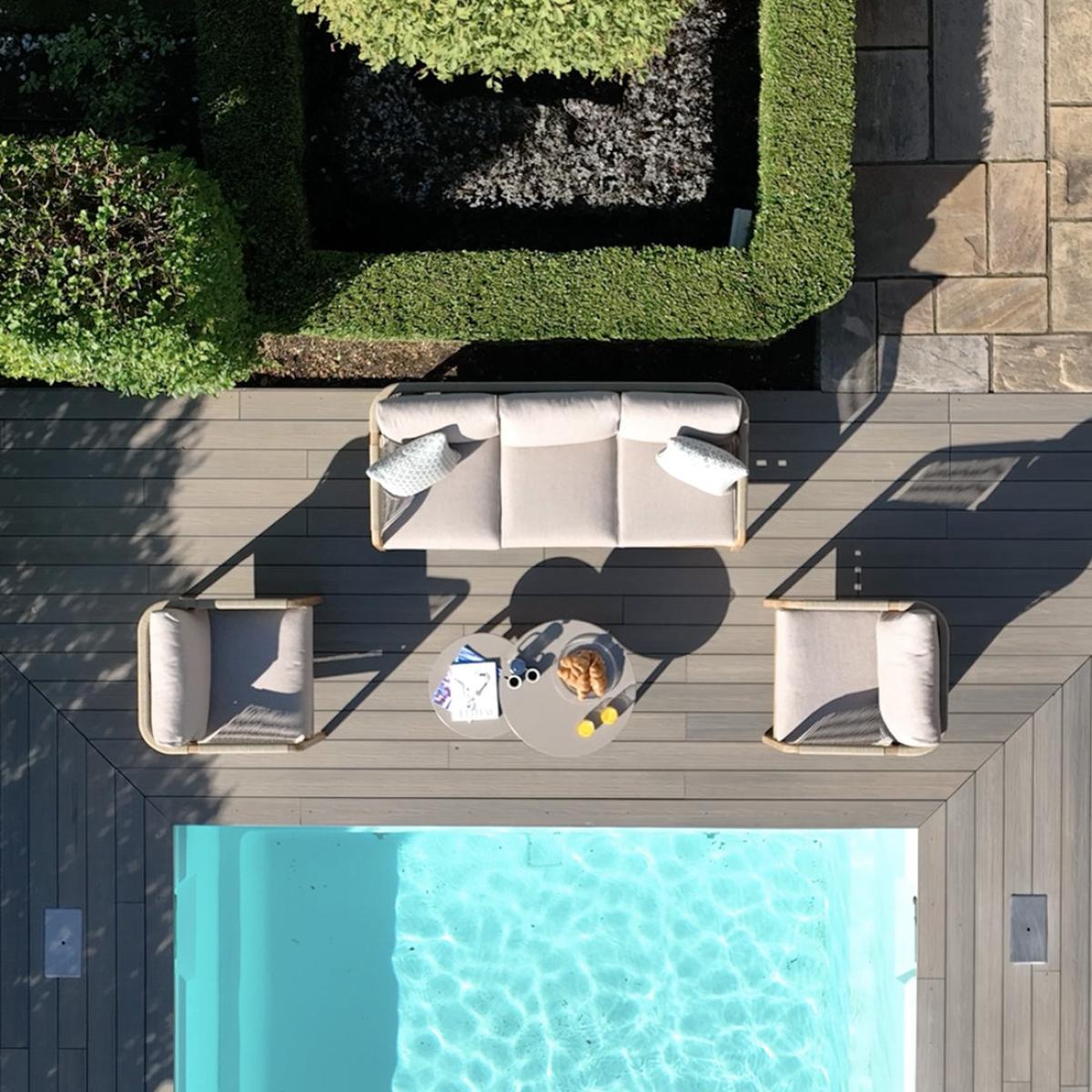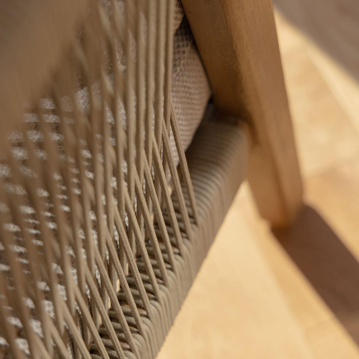 The Maze Martinique Lounge Set features sturdy wooden framework composed of sustainably sourced Acacia wood finished with a vintage light teak look. The framework comes with adjustable feet to ensure it sits perfectly level on any surface and is wrapped with an intricately intertwined taupe round polypropylene rope, this beautifully designed structure can be left outside all year round. Whilst we would recommend storing the cushions away in the wetter months, they feature a high-performance olefin material which is both water and stain-resistant. The comfortable and detailed two seat sofa and armchairs and paired with nesting coffee tables that include a wooden base and are complete with striking concrete-composite table-top. The charming design of the Martinique range lends itself to both indoor and outdoor settings, the elegant characteristics echo a style that would suit an outdoor setting as equally as it would enhance your orangery, conservatory, or any internal space. Please note: Acacia wood will weather to a soft grey over time. Small cracks and fissures may develop with changes in humidity and temperature. This is a natural characteristic of solid wood furniture. Character and grain of the wood will vary for each piece.