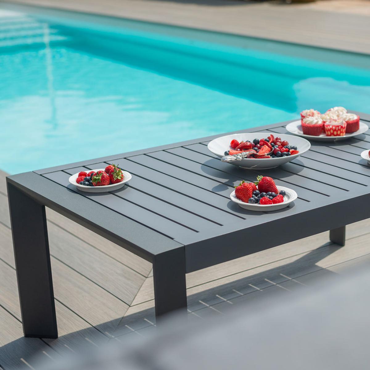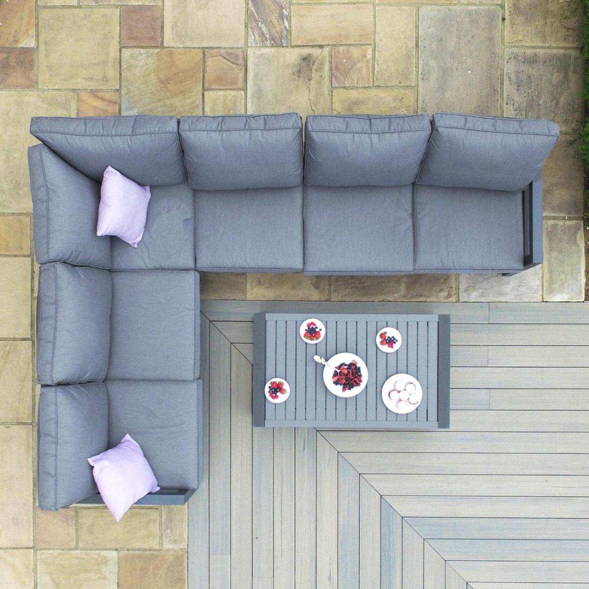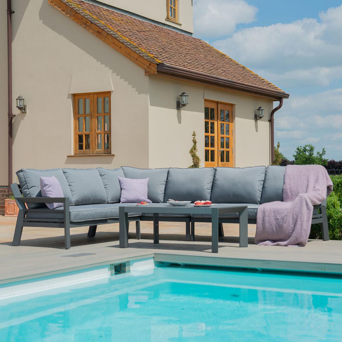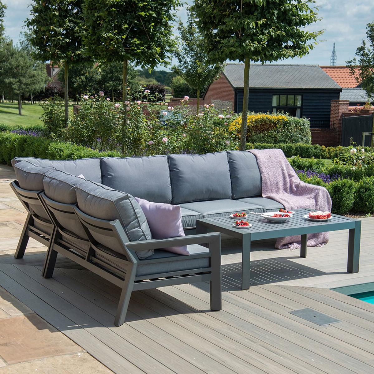 The Maze New York Corner Sofa Set is a simplistic corner sofa, the aluminium framework makes it maintenance free and has thick padded cushions to sink into this summer. If space is limited, the corner sofa can easily seat 6 people. To complement this sofa set, is a slatted aluminium coffee table which matches the rest of the framework. The dark grey framework is beautifully complemented by a new pale grey colourway cushion for 2024. Dimensions:Length of Long Side: H:72 x D:86 x L:293cm Length of Short Side: H:72 x D:86 x L:228cmLeft and Right Hand Sofa: H:72 x D:86 x W:142cm2 Seat Corner Piece: H:72cm x D:86cm x W:151cm. Slatted Coffee Table: H:45 x W:70 x L:120cm Seat Height: 42cm Materials: Aluminium frame Polyester cushions Assembly Required:Yes some assembly required Care Instructions:Wipe clean with a damp cloth, don't use harsh cleaners, etc