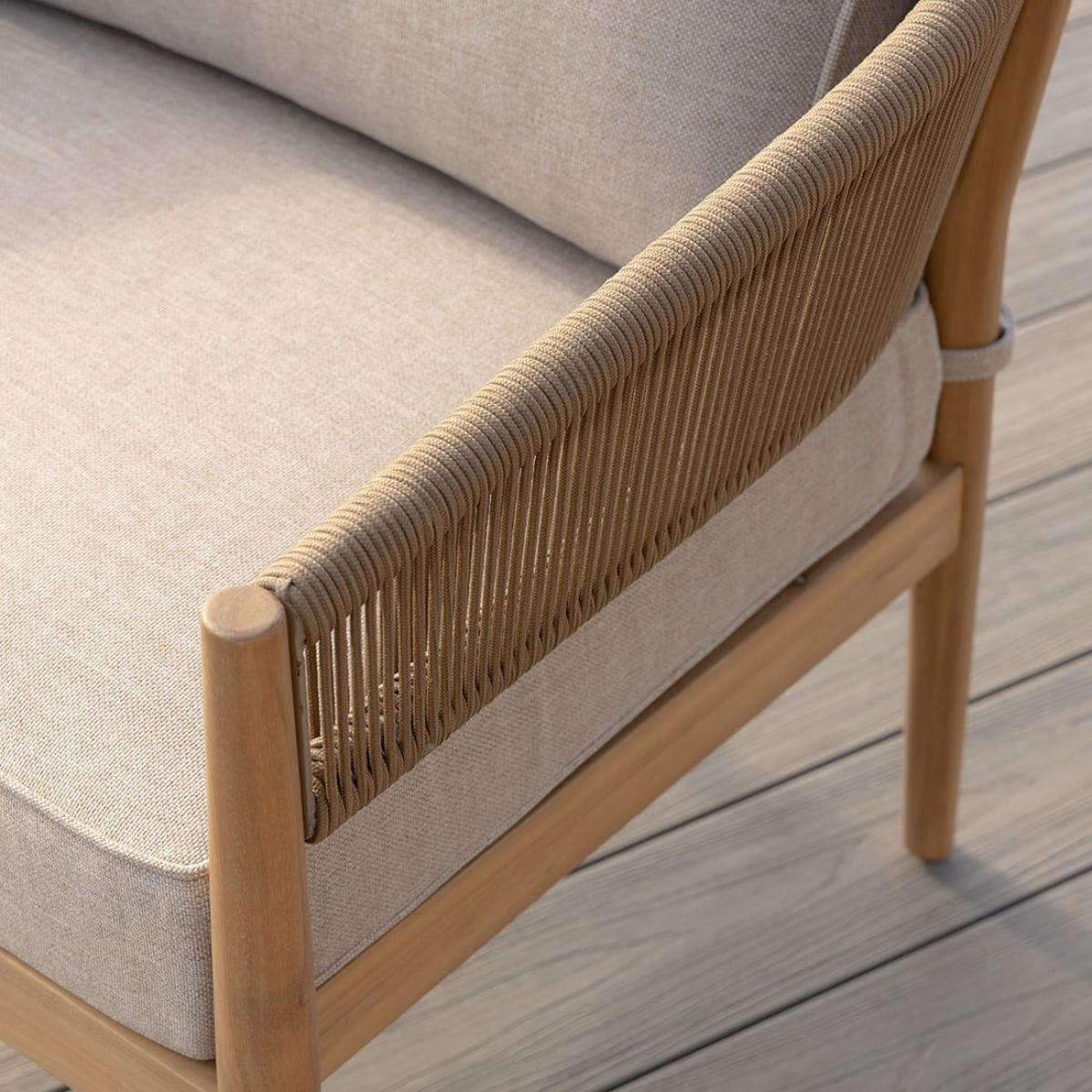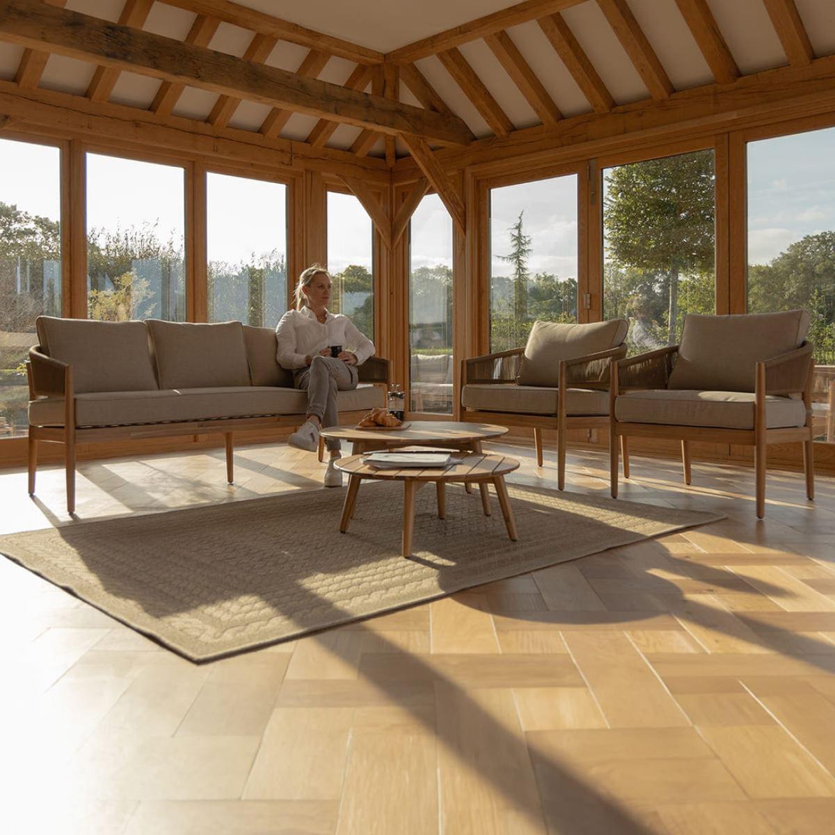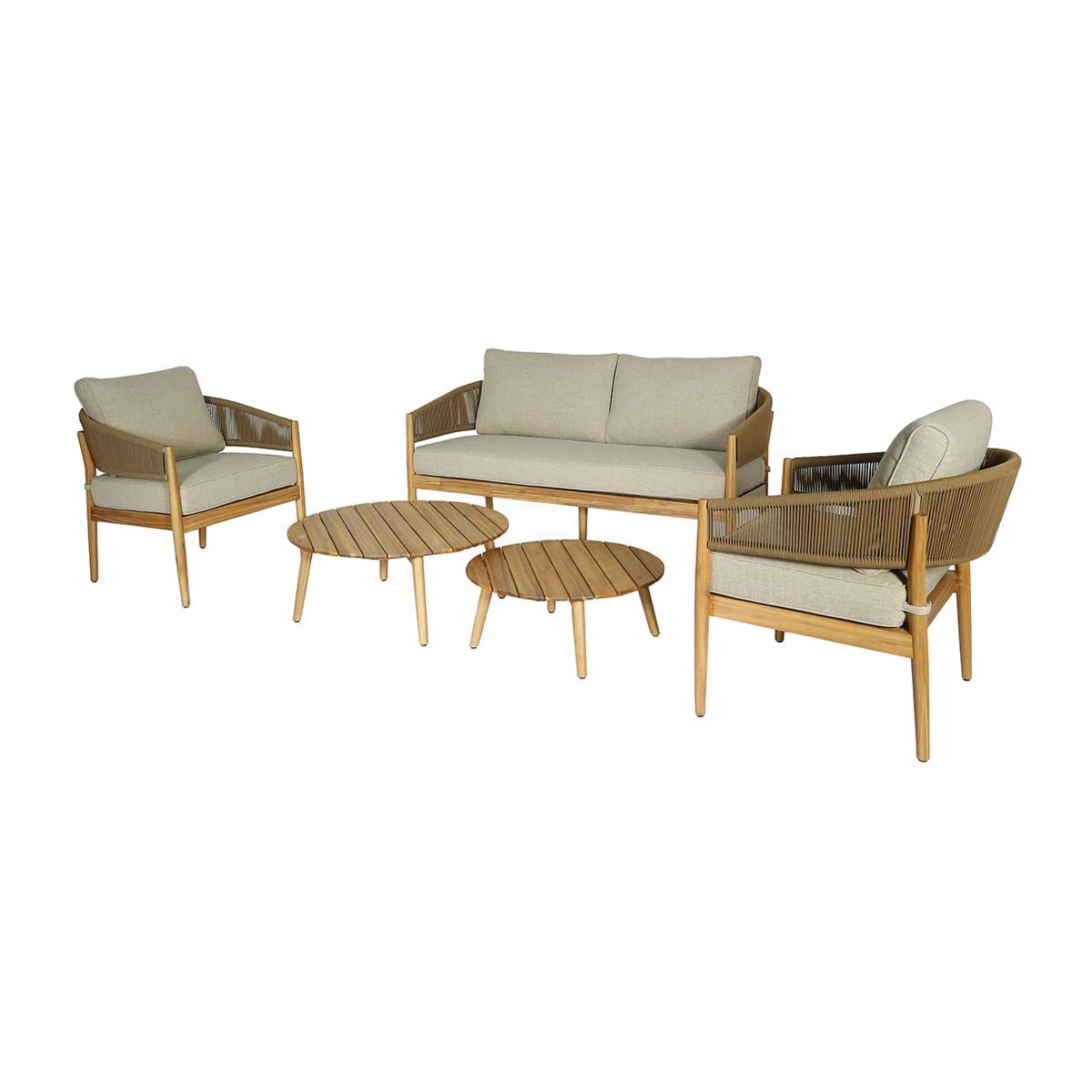 The Maze Porto Sofa Set consists of sustainably sourced solid Acacia wood framework finished with a light teak look. The framework comes with adjustable feet to ensure it sits perfectly level on any surface and is delicately wrapped with a natural brown round polypropylene rope, this stunning structure can be left outside all year round. Whilst we would recommend storing the cushions away in the wetter months, they feature a high-performance olefin material which is both water and stain-resistant. The comfortable two seat sofa and two armchairs feature velcro straps on the seat cushions, and are paired with nesting all-wood slatted coffee tables making it a beautiful addition to any garden. The charming design of the Porto range lends itself to both indoor and outdoor settings, the elegant characteristics echo a style that would suit an outdoor setting as equally as it would enhance your orangery, conservatory, or any internal space. Please note: Acacia wood will weather to a soft grey over time. Small cracks and fissures may develop with changes in humidity and temperature. This is a natural characteristic of solid wood furniture. Character and grain of the wood will vary for each piece.
