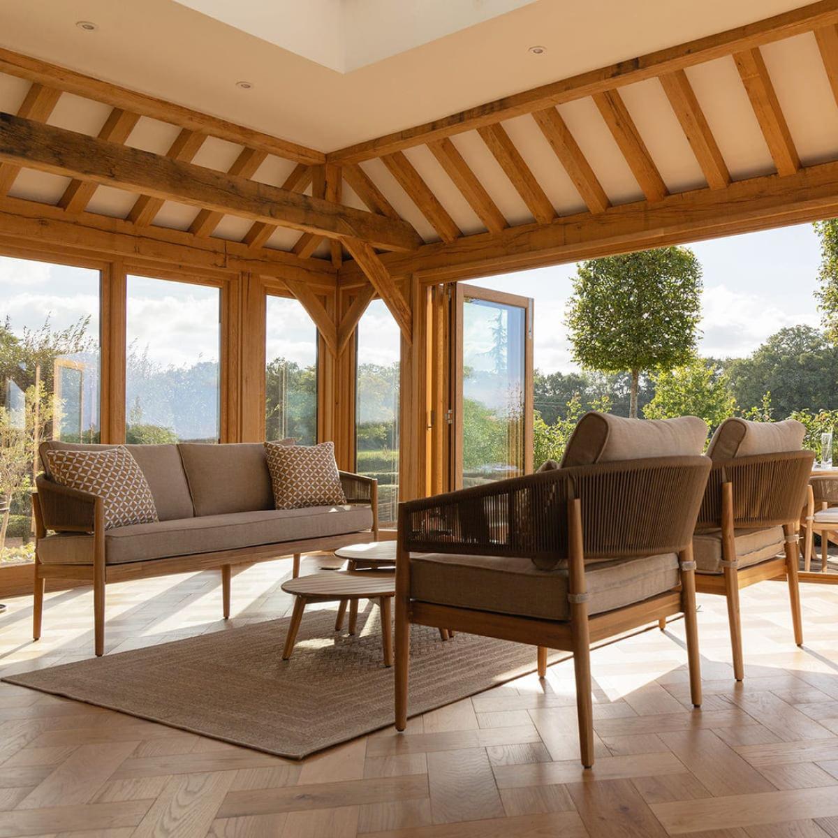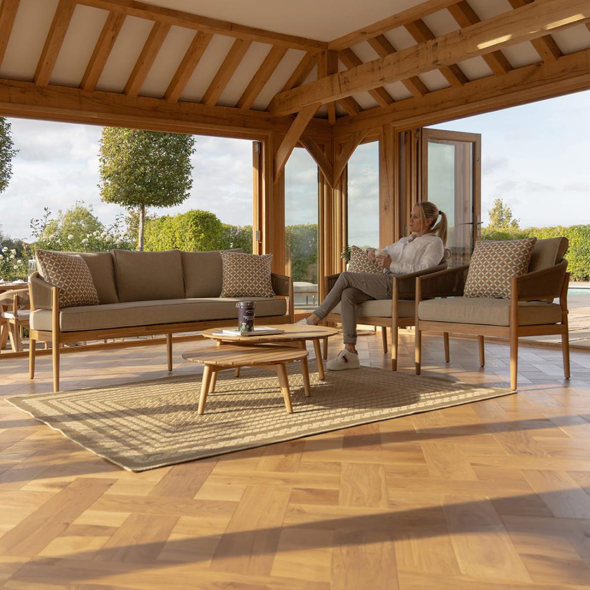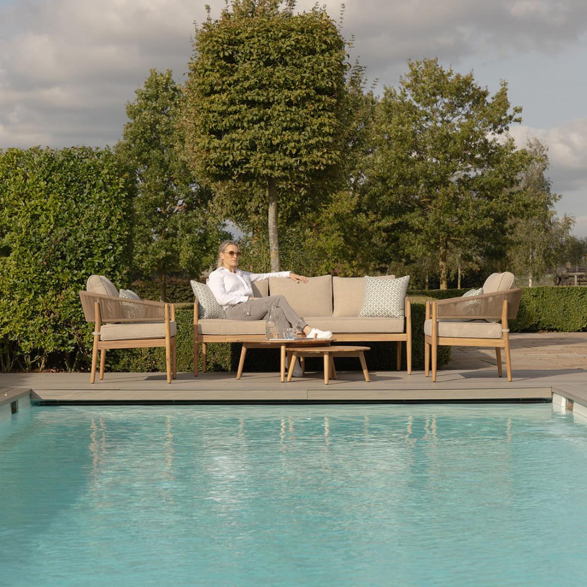 The Maze Porto Sofa Set consists of sustainably sourced solid Acacia wood framework finished with a light teak look. The framework comes with adjustable feet to ensure it sits perfectly level on any surface and is delicately wrapped with a natural brown round polypropylene rope, this stunning structure can be left outside all year round. Whilst we would recommend storing the cushions away in the wetter months, they feature a high-performance olefin material which is both water and stain-resistant. The comfortable two seat sofa and two armchairs feature velcro straps on the seat cushions, and are paired with nesting all-wood slatted coffee tables making it a beautiful addition to any garden. The charming design of the Porto range lends itself to both indoor and outdoor settings, the elegant characteristics echo a style that would suit an outdoor setting as equally as it would enhance your orangery, conservatory, or any internal space. Please note: Acacia wood will weather to a soft grey over time. Small cracks and fissures may develop with changes in humidity and temperature. This is a natural characteristic of solid wood furniture. Character and grain of the wood will vary for each piece.