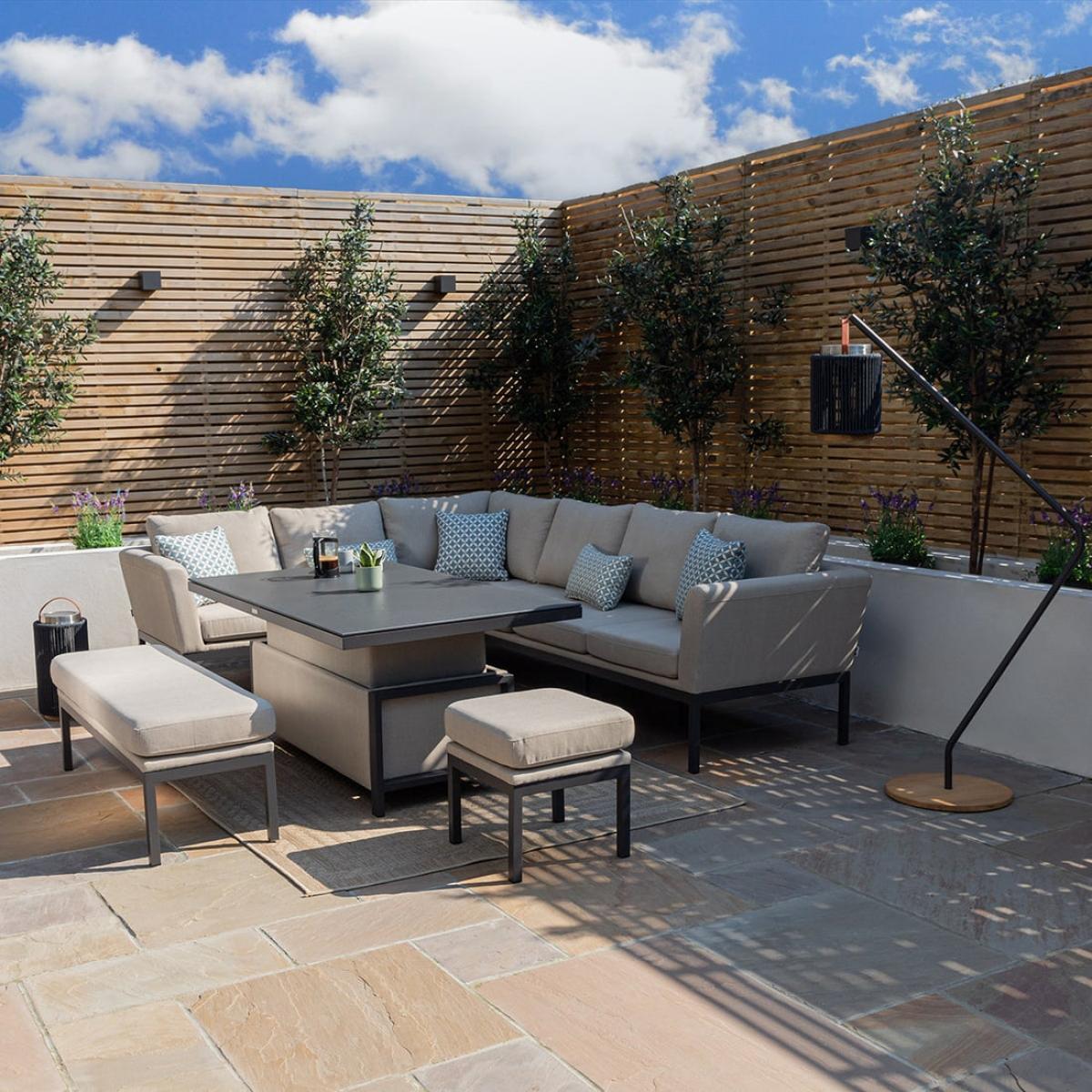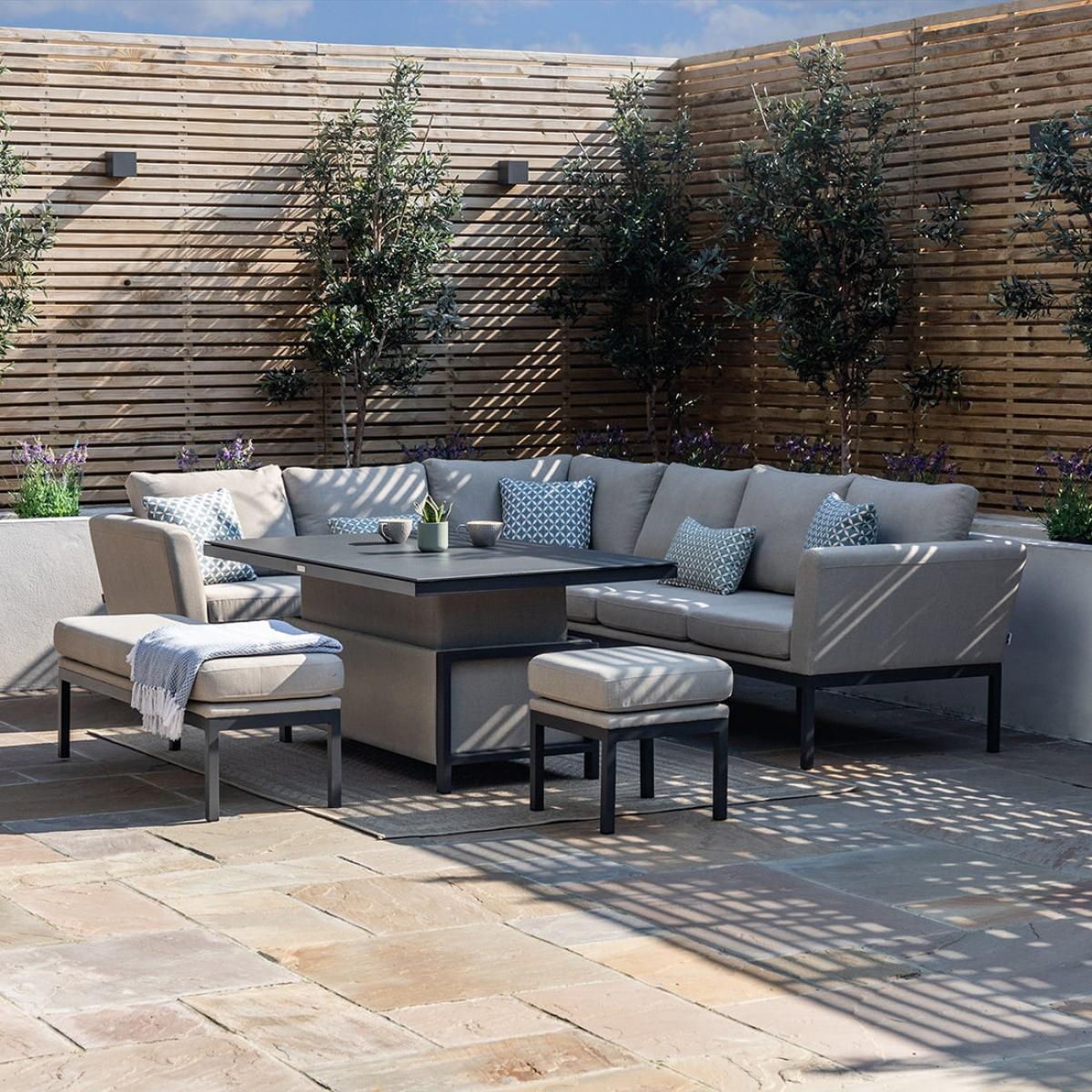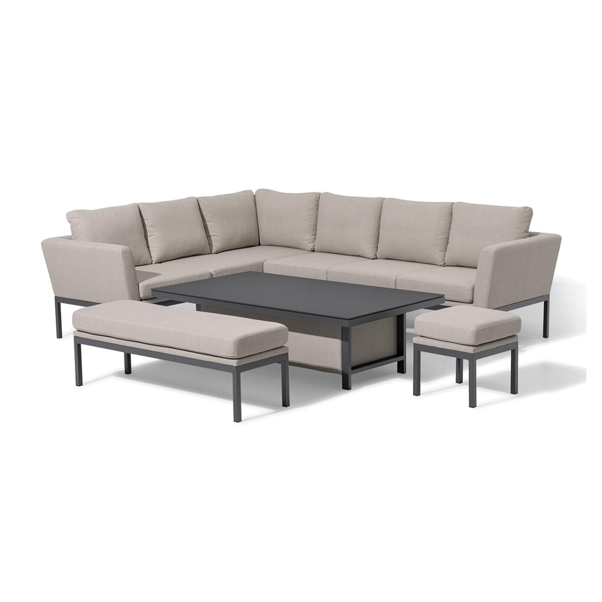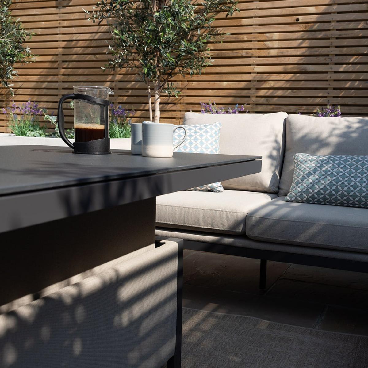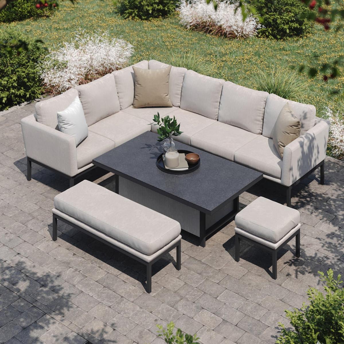 The original set which launched our popular Pulse Range, the Pulse Corner Dining carries all the traits of the more compact Pulse Sofa Set, with sumptuous back and base cushions, as well as simple yet strong legs that help create the refined, fuss-free look and feel. The set comes with the rising table feature, transfer your L shaped corner sofa from a casual dining experience into a relaxed setting. Made from high performance outdoor fabric and materials, the corner sofa is designed to be outside all year round. Prepare your garden in time for Spring with a simple jet wash and leave your set to dry in the warming sun ready for months of use during the warmer season. Dimensions: Length of Long Side: L:278cm. Length of Short Side: L:220cm3 Seat Left Hand Sofa: H:70 x W:220 x D:84cm3 Seat Right Hand Sofa: H:70 x W:196 x D:84cm. Bench: H:44 x L:130 x D:45cm. Footstool: H:44 x W:45 x D:45cm. Rising Table: H:52/68cm x L:160 x W:90cm Seat Height: 44cm. Cushion Thickness: 10cm Materials: Aluminium frame All weather Outdoor fabric cushions Assembly Required:Yes some assembly required Care Instructions:Wipe clean with a damp cloth, don't use harsh cleaners, etc