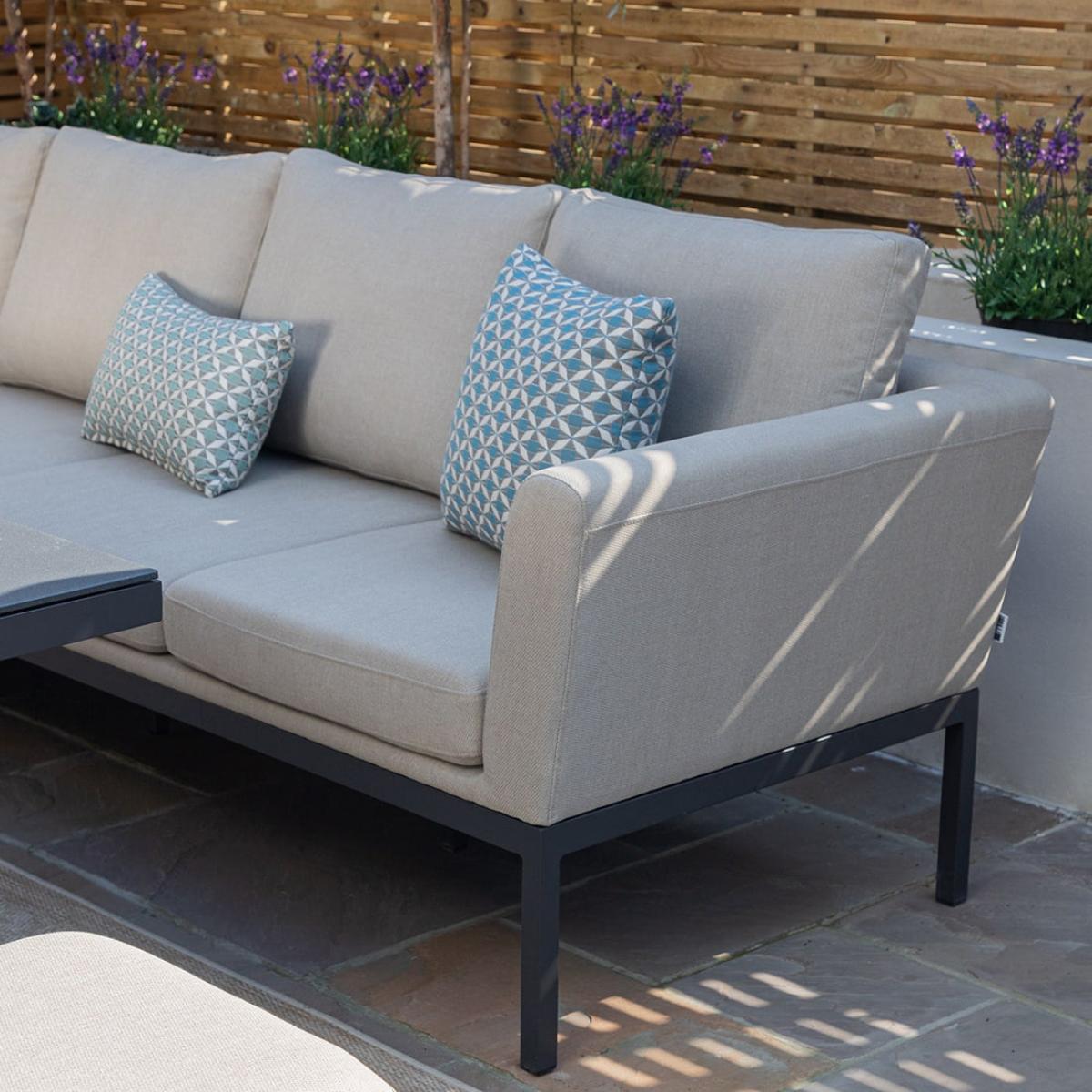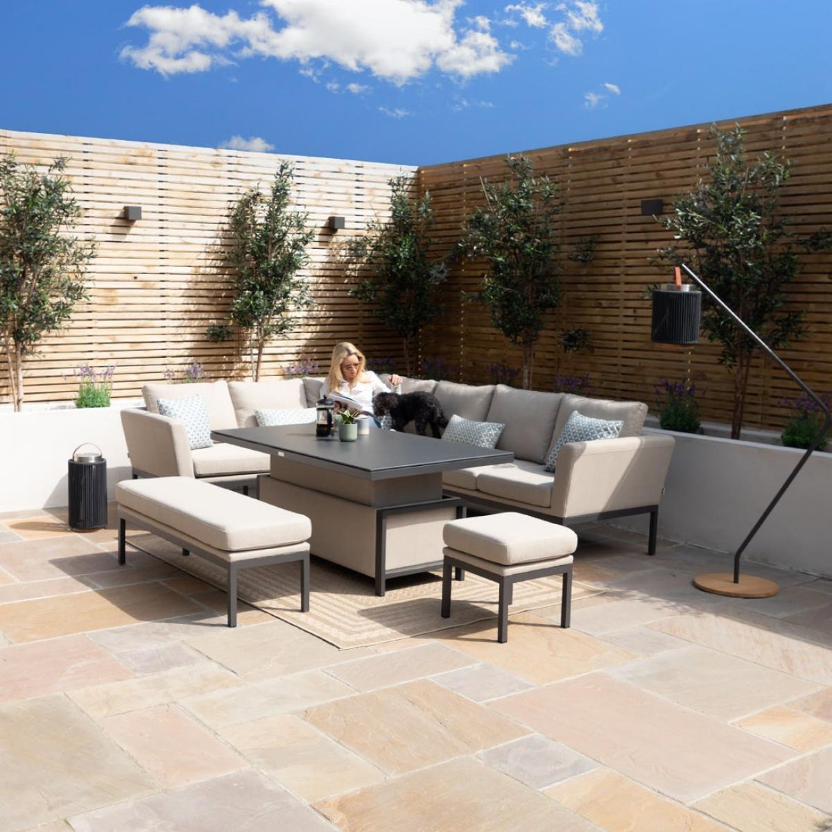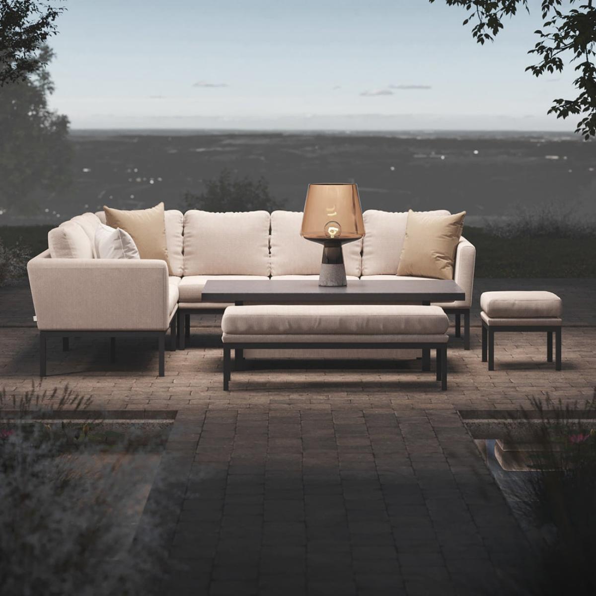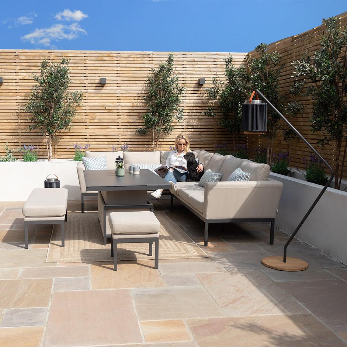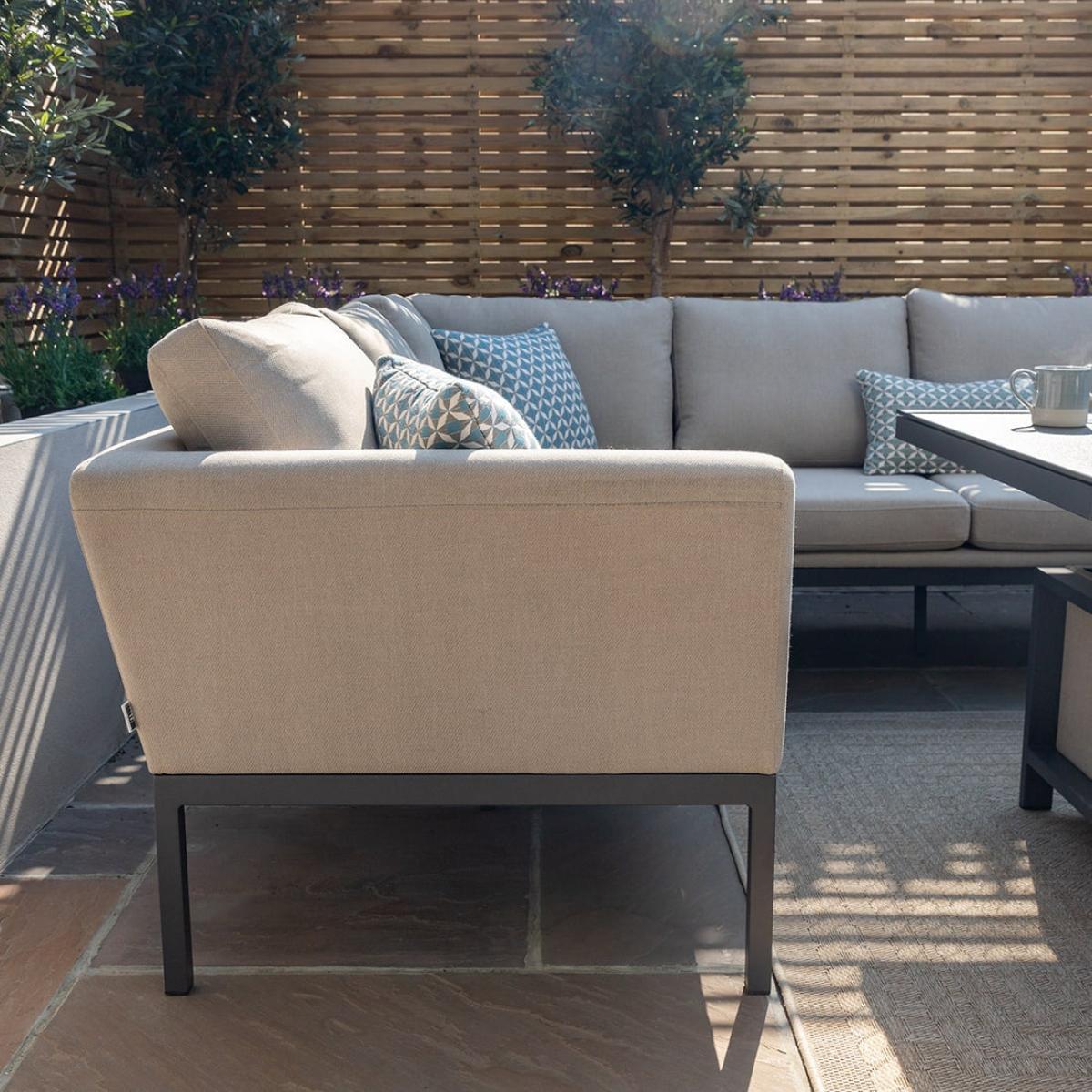 The original set which launched our popular Pulse Range, the Pulse Corner Dining carries all the traits of the more compact Pulse Sofa Set, with sumptuous back and base cushions, as well as simple yet strong legs that help create the refined, fuss-free look and feel. The set comes with the rising table feature, transfer your L shaped corner sofa from a casual dining experience into a relaxed setting. Made from high performance outdoor fabric and materials, the corner sofa is designed to be outside all year round. Prepare your garden in time for Spring with a simple jet wash and leave your set to dry in the warming sun ready for months of use during the warmer season. Dimensions: Length of Long Side: L:278cm. Length of Short Side: L:220cm3 Seat Left Hand Sofa: H:70 x W:220 x D:84cm3 Seat Right Hand Sofa: H:70 x W:196 x D:84cm. Bench: H:44 x L:130 x D:45cm. Footstool: H:44 x W:45 x D:45cm. Rising Table: H:52/68cm x L:160 x W:90cm Seat Height: 44cm. Cushion Thickness: 10cm Materials: Aluminium frame All weather Outdoor fabric cushions Assembly Required:Yes some assembly required Care Instructions:Wipe clean with a damp cloth, don't use harsh cleaners, etc