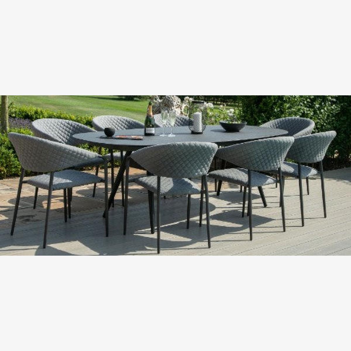With its generously filled base and quilted back cushion, the Pebble 8 Seat Oval Outdoor Dining Set has a personality of its own. As the chairs easily stack away, it is a real space saver, with all the benefits of our fabric material. Dimensions:8 x Pebble Chairs - H: 84 x W: 56 x D: 62 cm1 x Spray Stone Table - H: 75 x W: 230 x D: 107 cm. All weather Rattan Lightweight Aluminium Frost Resistant RattanUV Resistant Rattan Waterproof Rattan Showerproof cushions. Easy Care. Made from Recycled Materials