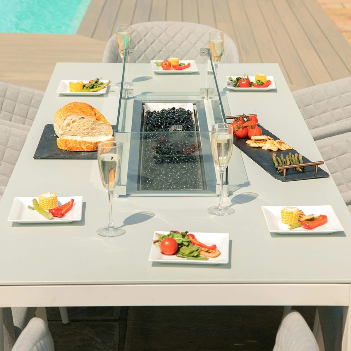 Cook, dine, socialise and relax, sat around the. Maze Rattan Ambition 8 Seat Rectangular Fire Pit Dining Set! Including a grill plate and protective glass surround; cook steaks, sizzling sides and veggies for everyone to tuck into and once you've finished eating, warm yourselves in frontof the fire pit late into the night and enjoy your garden for longer. Not in the mood for grilled food? Simply cover the fire pit and utilise the whole table top. Complete with 8 quilted fabric chairs, they have been covered and cushioned for your comfort, but they can also be left outside all year round thanks to the weatherproof, UV and stain resistant materials. Practical, stylish and supportive. Once you've sat down you'll want to stay put! Available in a choice of colours, completely transform your outside space with this fabulous set!.