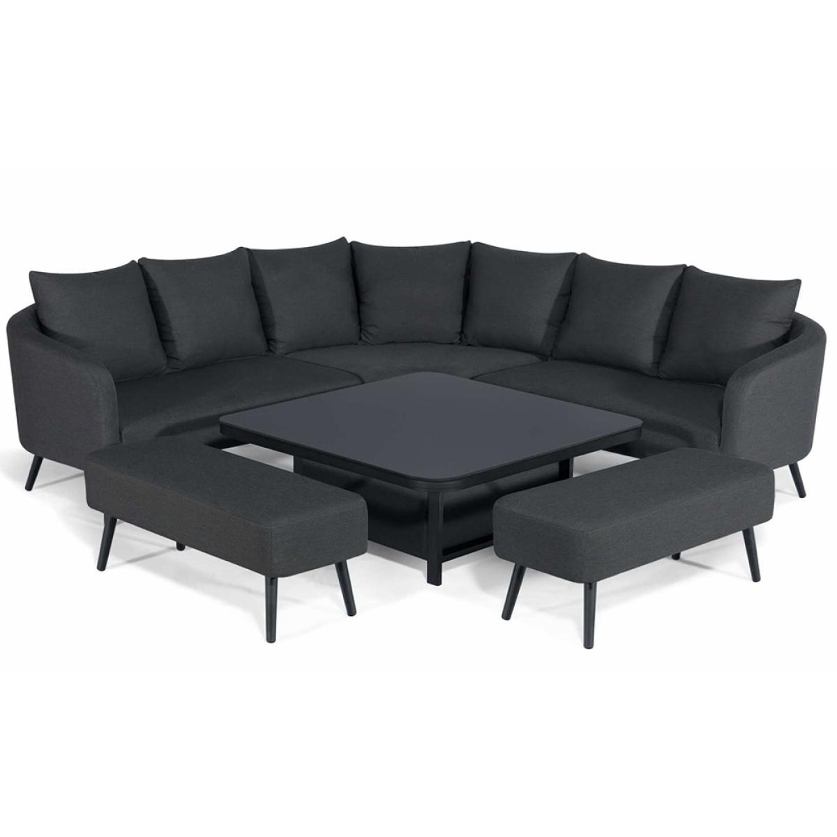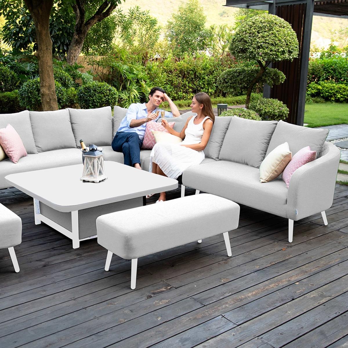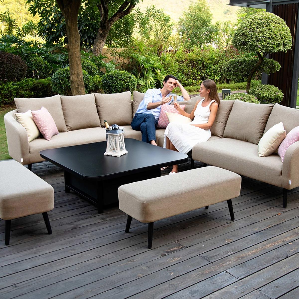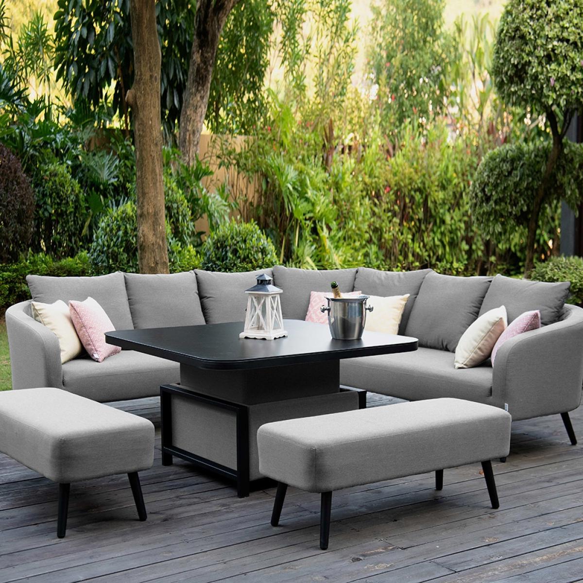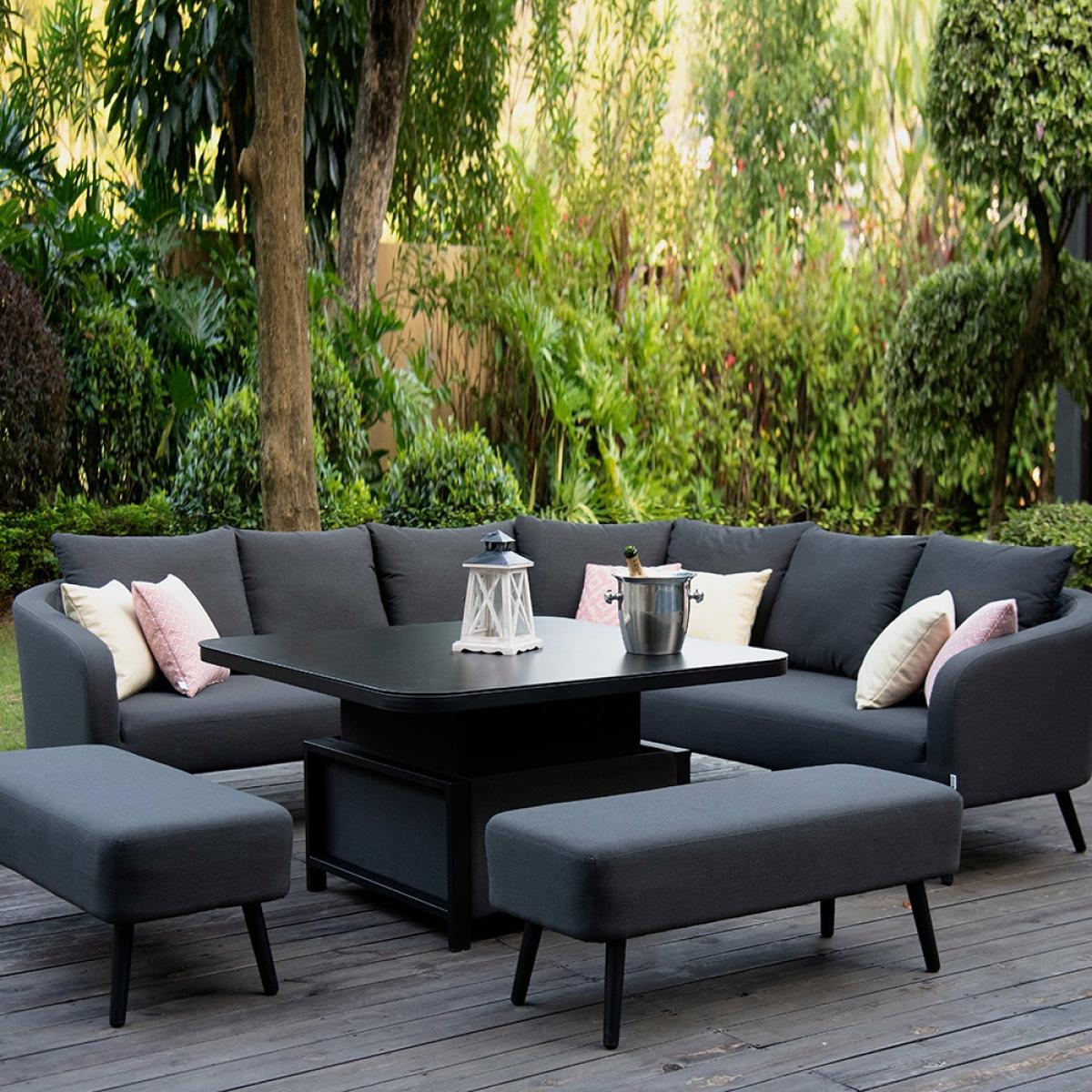 TheMaze Rattan Ambition Square Corner Dining Set with Rising Table offers so much more than your average garden furniture set! With the option to raise and lower the table, it's the perfect set for dining and socialising. Complete with a plush modular corner sofa and 2 upholstered benches, enjoy family meals in comfort or drop the table and have coffee and a catch-upoutside with friends. Simply adapt your set to suit the occasion! You could always just spread yourself out and relax with a good book? Covered and cushioned with weatherproof, UV and stain resistant materials; even if the weather is being less than kind you're able to leave the fabric cushions, table and frame outside in the elements, all year round! Easy to clean, quick drying and oh-so comfortable and stylish, you couldn't want for more. Available in a choice of colours, you have the tricky decision of picking your favourite!.