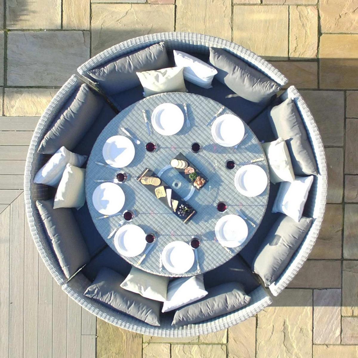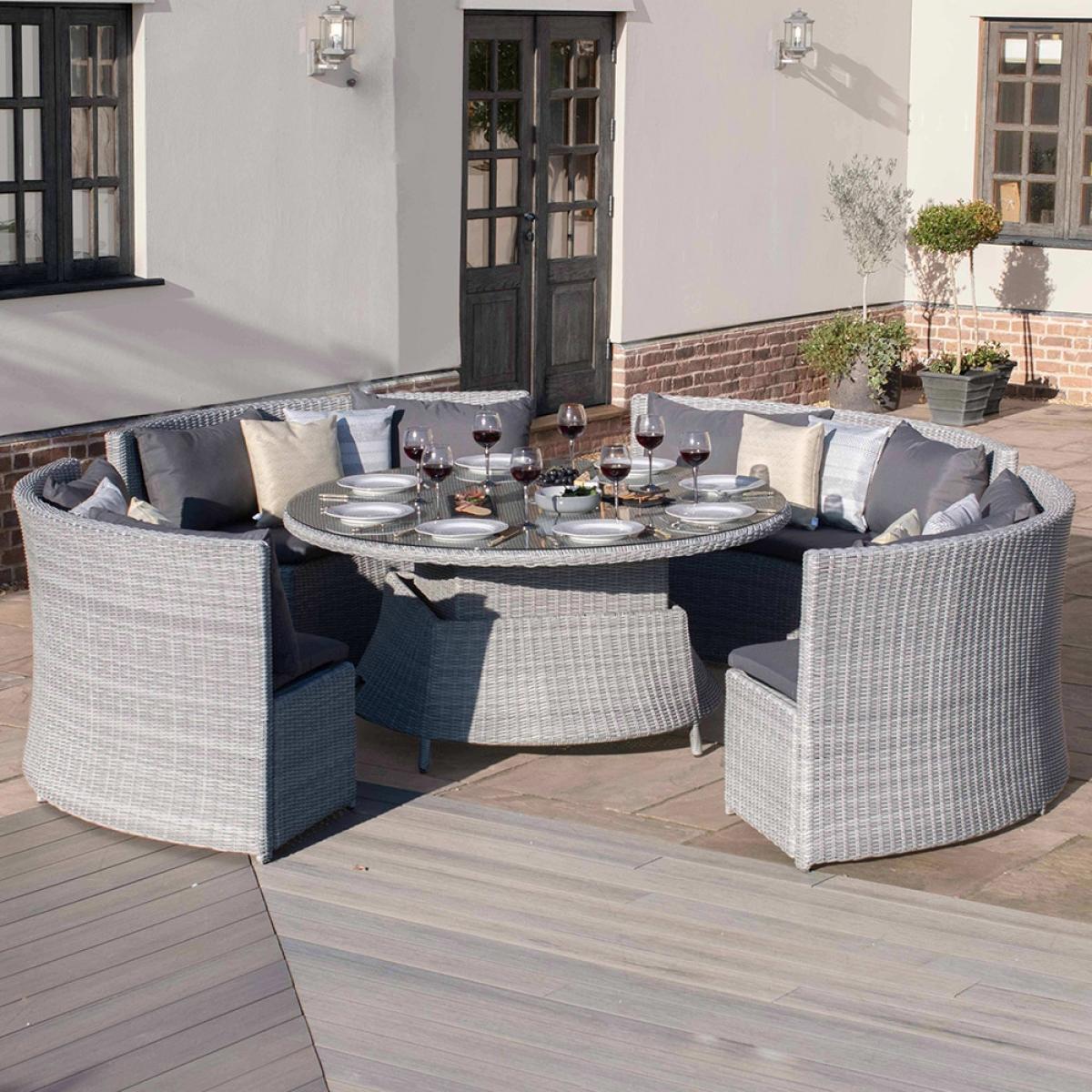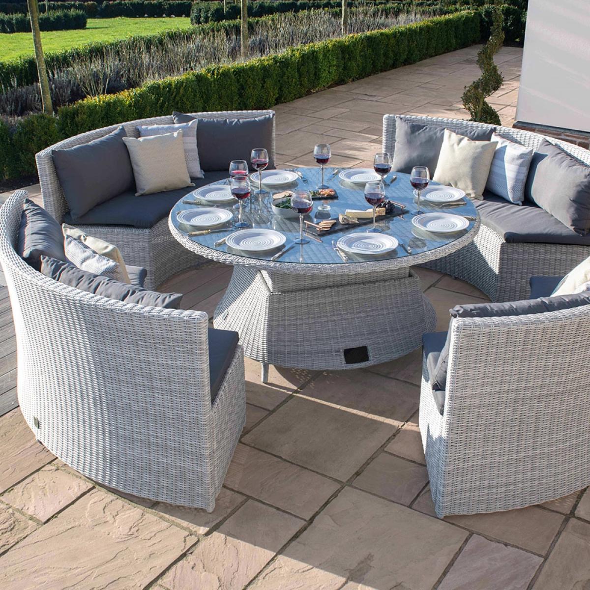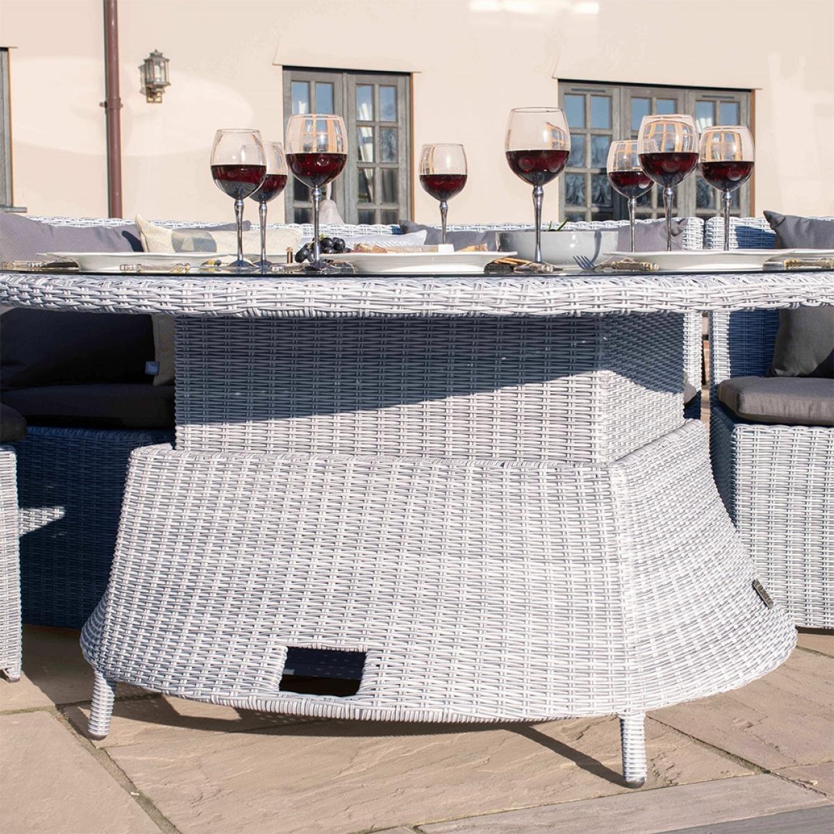 Create a unique garden dining experience with the Maze Rattan Ascot Round Sofa Dining Set with Rising Table. You'll adore this robust, showerproof luxury set that allows up to 8 people to pull up and feast alfresco style. The rising table allows for a versatile experience, whether it be a causal afternoon coffees on the terrace, or evening BBQs! Comfort isn't compromised either, with luxurious deep filled cushions which are also water resistant for those unpredictable days. However you choose to use your Ascot round dining set, you most definitively won't be disappointed!.