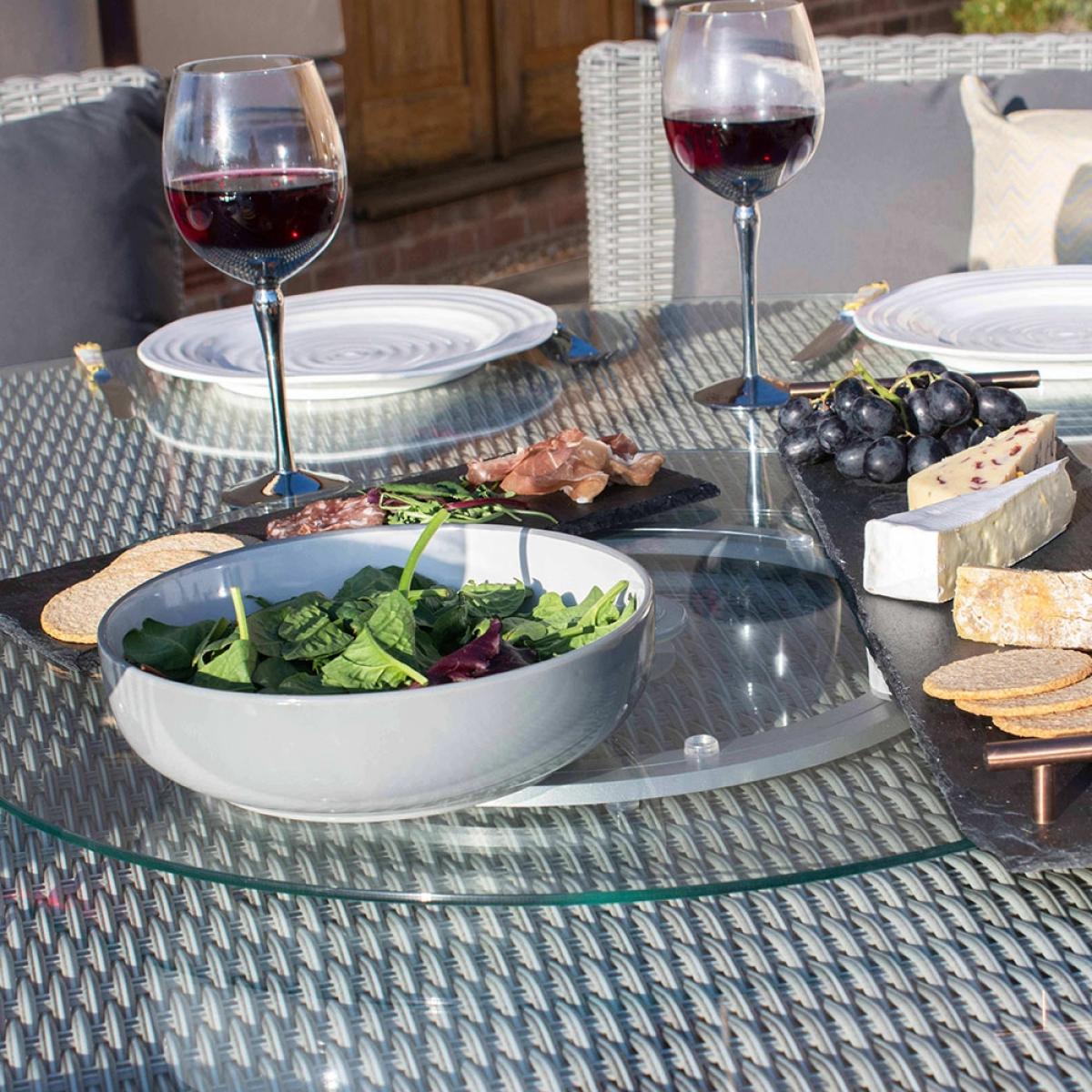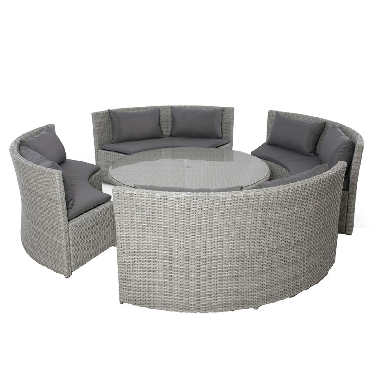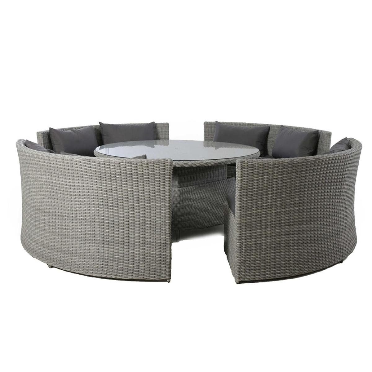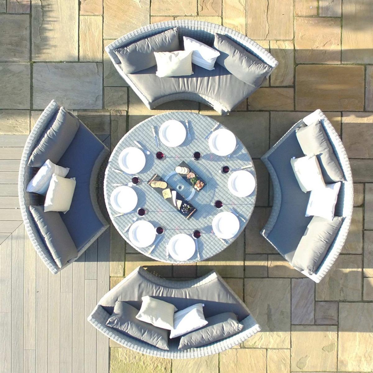Create a unique garden dining experience with the Maze Rattan Ascot Round Sofa Dining Set with Rising Table. You'll adore this robust, showerproof luxury set that allows up to 8 people to pull up and feast alfresco style. The rising table allows for a versatile experience, whether it be a causal afternoon coffees on the terrace, or evening BBQs! Comfort isn't compromised either, with luxurious deep filled cushions which are also water resistant for those unpredictable days. However you choose to use your Ascot round dining set, you most definitively won't be disappointed!.