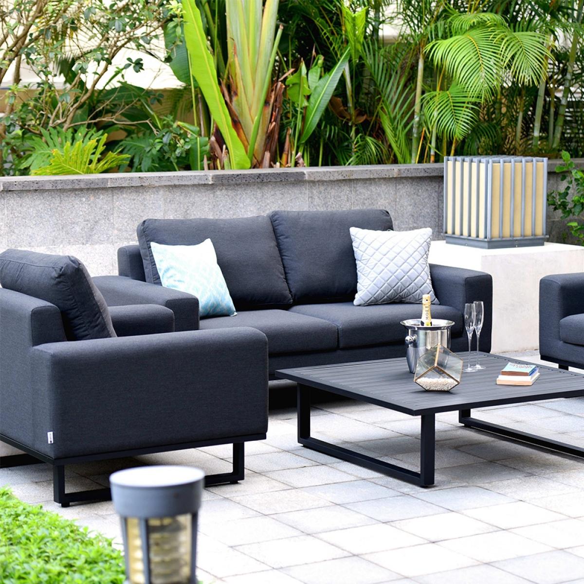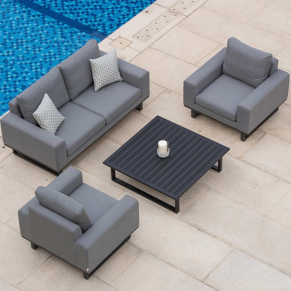Create a unique and Stylish garden haven with the. Maze Rattan Ethos 2 Seat Sofa Set With Coffee Table! This skillfully crafted contemporary set comprises of a 2 seater sofa, 2 luxurious armchairs and a matching coffee table. Trusted La Vita fabrics, create a robust, stain resistant finishthat wont fade in UV sunlight. Whilst high performance foam, specially designed for the outdoors, gives optimum comfort and with 4 sumptuous colours to choose from, you'llbe spoilt for choice!.