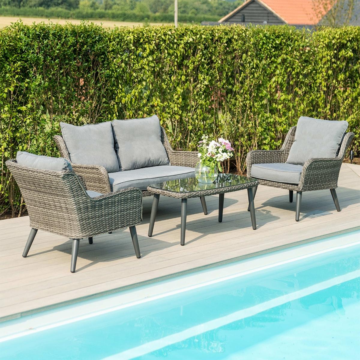 Where better to enjoy the glorious summer sun than the Maze Rattan Florence 2 Seat Sofa Set. Complete with a sofa, two armchairs and a coffee table, invite your friends over for some cocktails or afternoon tea, there will be plenty of space to get comfy and have a natter! Manufactured from the highest quality PU rattan woven onto a powder coated aluminium frame, with its curved design and modern grey finish, this Maze Rattan Florence set will look stunning on your patio.