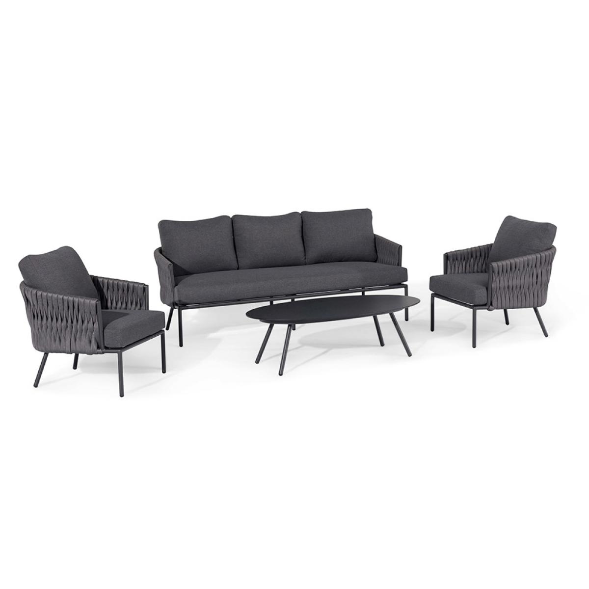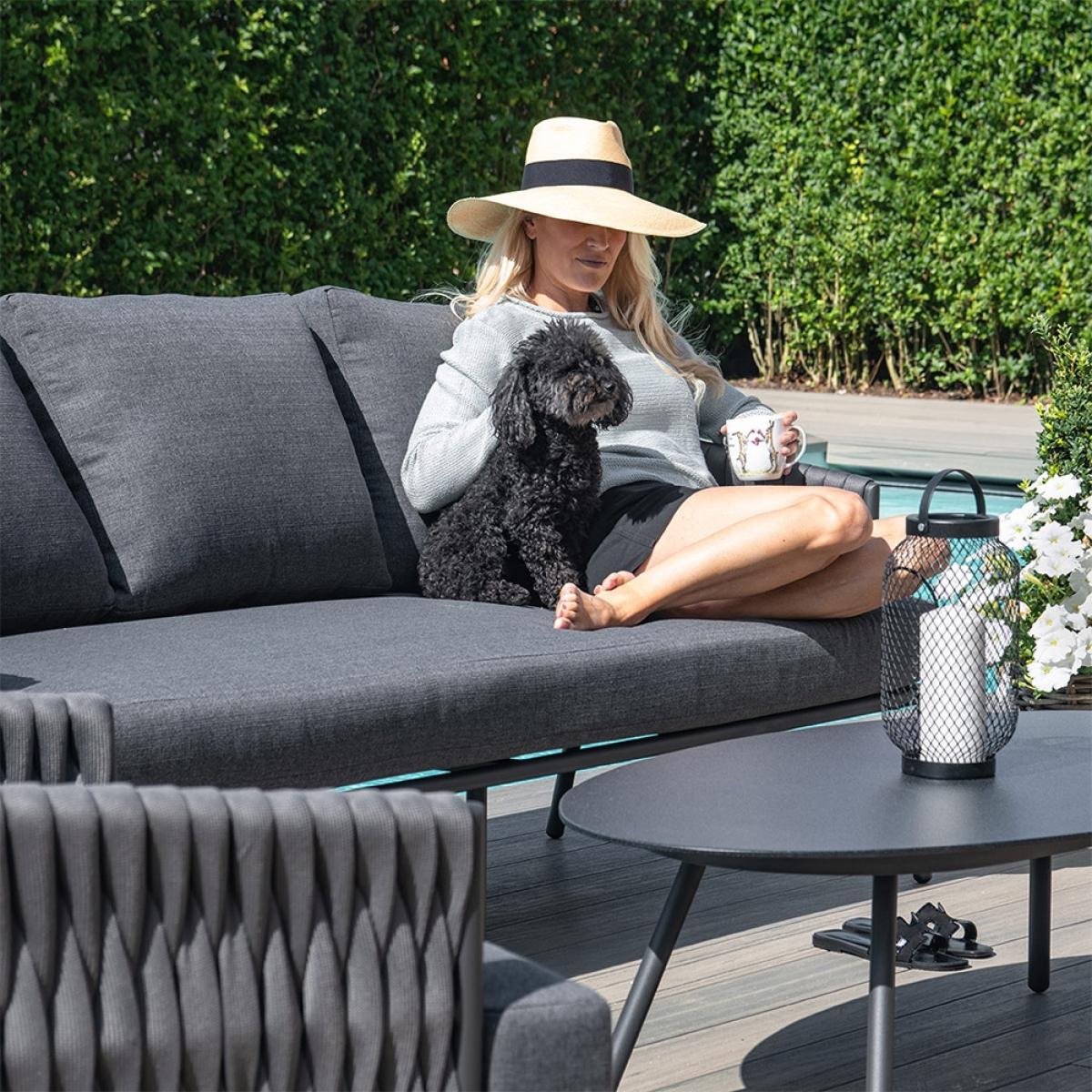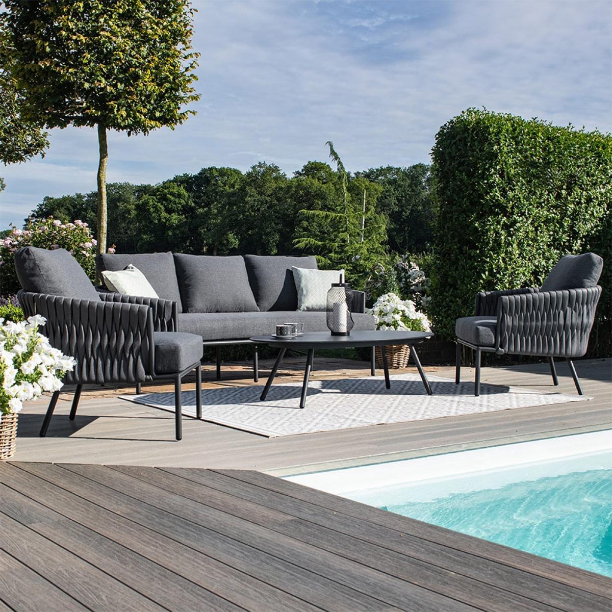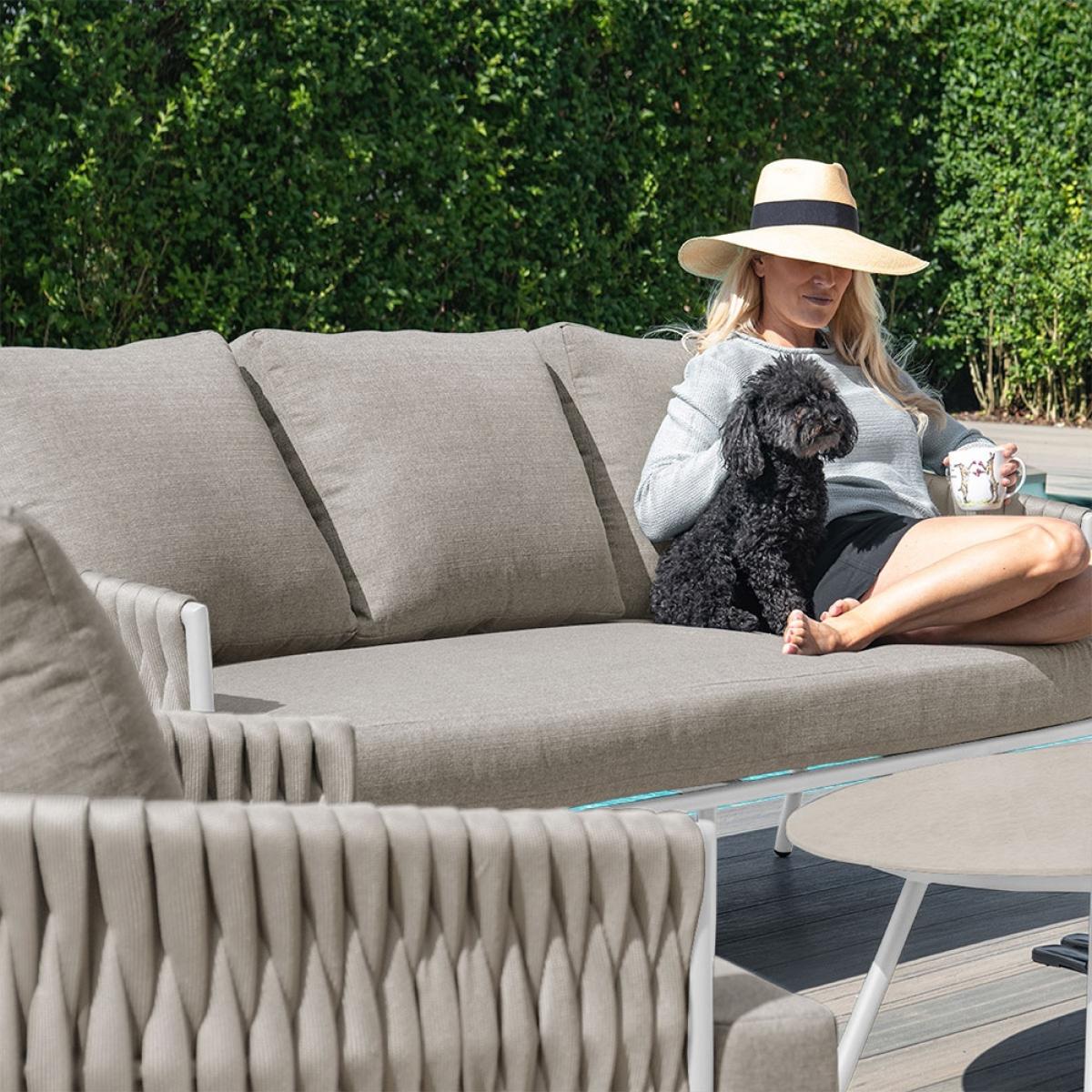 The Maze Rattan Marina 3 Seat Sofa Set will be a beautiful addition to your garden. The eye catching rope design adds a touch of elegance to your space while the sumptuous cushions and ergonomic design will have you and your guests relaxing into the early evening. The gorgeous tempered glass coffee table will be the perfect spot to rest your drinks and keep all those tasty snacks within easy reach! Whether you're having a BBQ with friends or just fancy a quiet morning cup of coffee out on the terrace the Marina Sofa Set will be the ideal spot!.