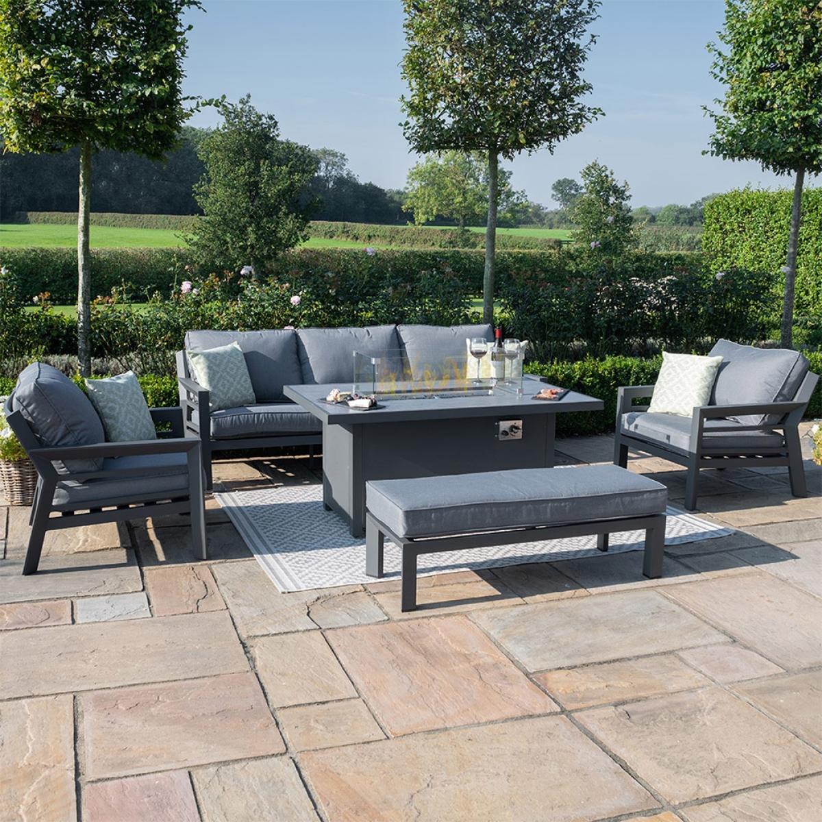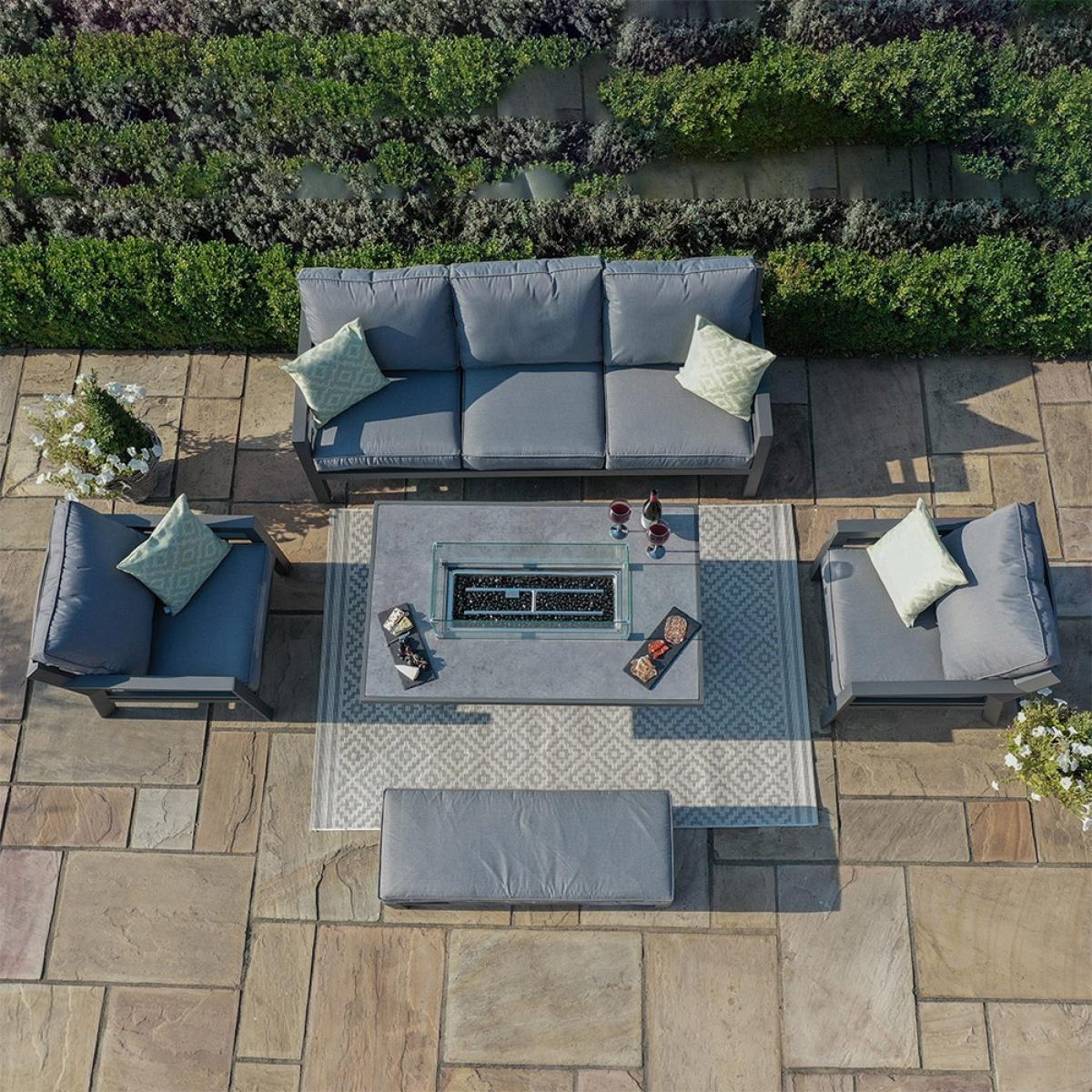 Looking for the perfect spot to relax, gather round,catch up and create memorable moments? Stop the searching! We give you the. Maze Rattan New York 3 Seat Sofa Set With Fire Pit Table. Get the flames going, crack open a bottle of bubbly and toast the occasion! Easily seating 7; the deep filled cushions and angled seat backs offer comfort and support while you all relax around the fire pit table. Each cushion is showerproof and UV resistant too, so no matter the weather your set is protected. Expertly crafted, the UV, rust, frost and water resistant frames can be left outside all year round without worry! Rain, shine, night and day; the Maze Rattan New York Sofa Set will be at the centre of all your favourite evenings!.