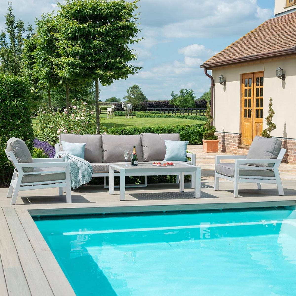 Stylish, comfortable and practical; the Maze Rattan New York Garden Sofa Set will leave you feeling relaxed and refreshed! With angled seat backs and deep filled cushions, you can kick back in pure comfort. To top it off, there's even a matching coffee table, the perfect centre piece to catch-ups with friends and family! This low maintenance, robust lounge set is ready and waiting for you! The luxurious cushions are stain and shower resistant and the lightweight aluminium frame can remain outside all year round. It doesn't get more practical than that! Available in a choice of sizes and with alternative colours to pick from, select the set to suit your outdoor space and let the lounging commence!.