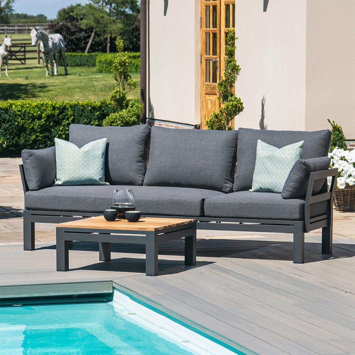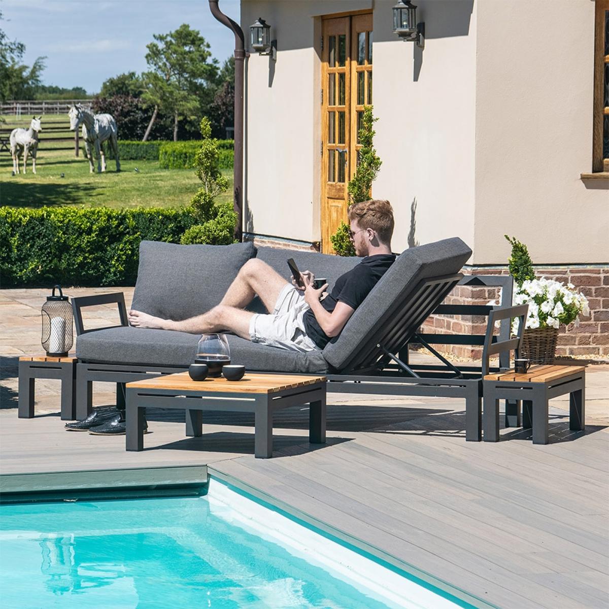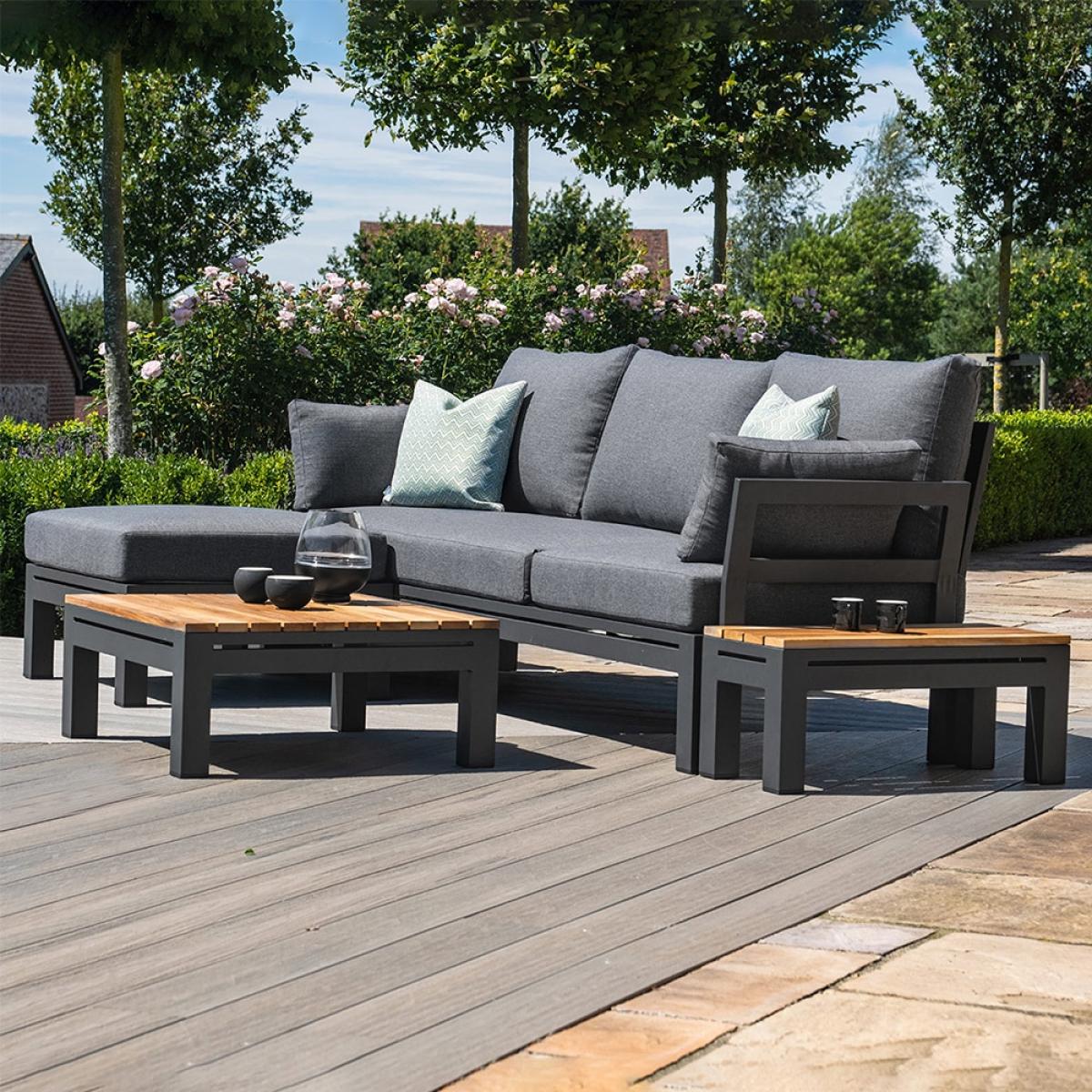 If you're unsatisfied with your outdoor space and in need of a transformation the Maze Rattan Oslo Chaise Sofa Set is the one for you! It can fully recline and become a relaxing lounger to doze off in the sunshine. Or keep it upright to create a sociable area for you and your friends to enjoy a chilled afternoon full of refreshing drinks and delicious nibbles around the beautiful wood topped coffee table. The all-weather aluminium frame paired with the plush comfy grey cushions will add the perfect finishing touch to your outside space. It's clever modular design means that no matter what your needs the flexible seating has got you covered. With the additional of a small cushion you can recline on either end!.