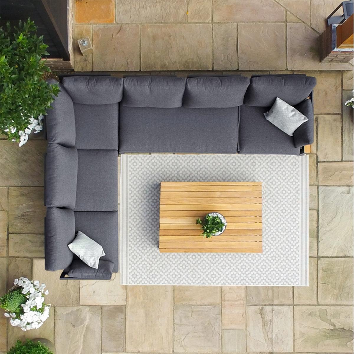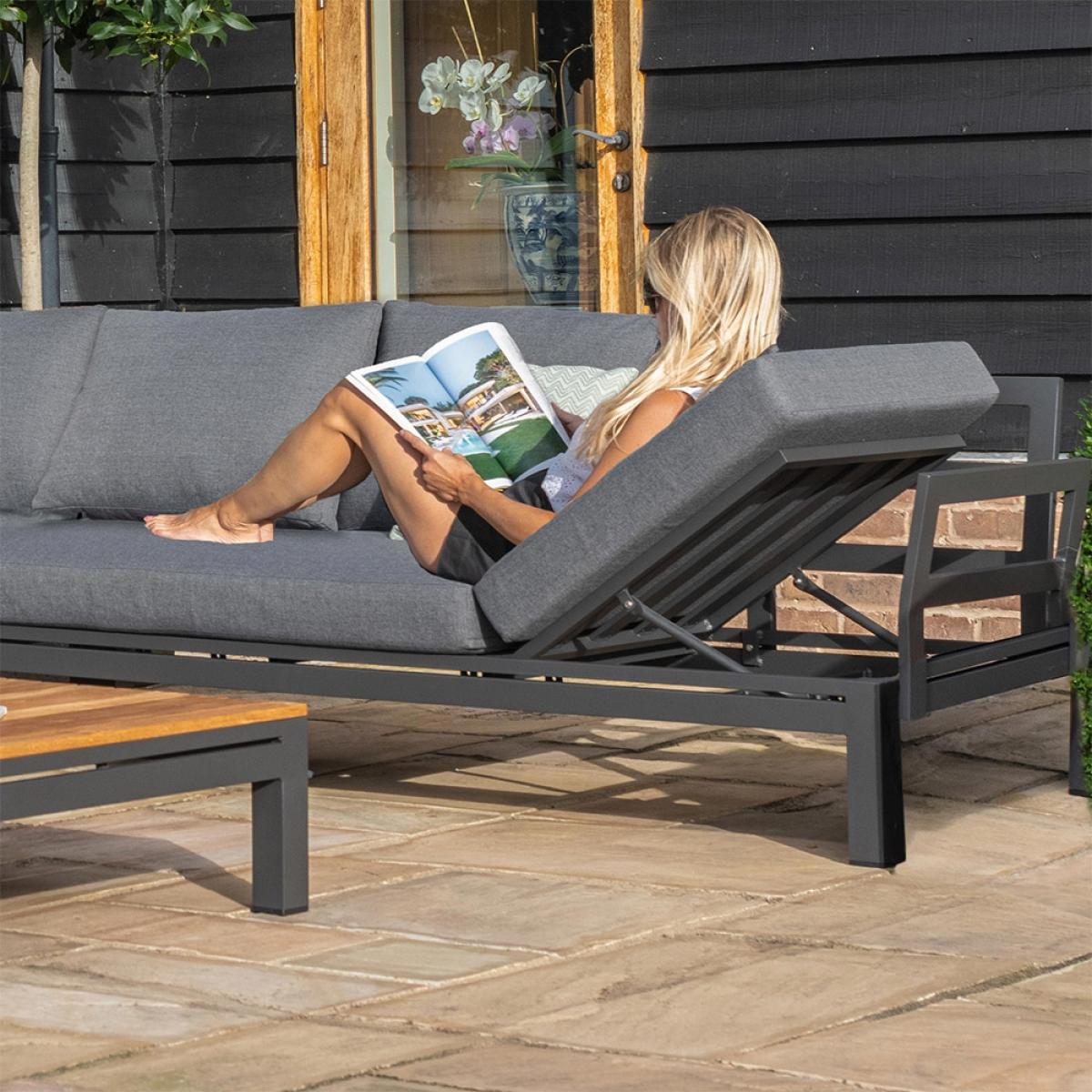 Completely transform your outside space with the Maze Rattan Oslo Corner Sofa Set! With its sleek grey aluminium frame and warm teak wood table top, it's a real head-turner. Not only does this piece look fantastic but it's hiding a relaxing secret, at the end of each sofa is a nifty recline feature to create a sun lounger! You'll be able to sit out in the garden with that first cup of morning coffee and put your feet up and relax. What a way to start the day! This corner sofa will be the perfect setting for family BBQ's, alfresco drinks at sunset or just lazy Sunday lounging soaking up the sunshine. What more could you need?.