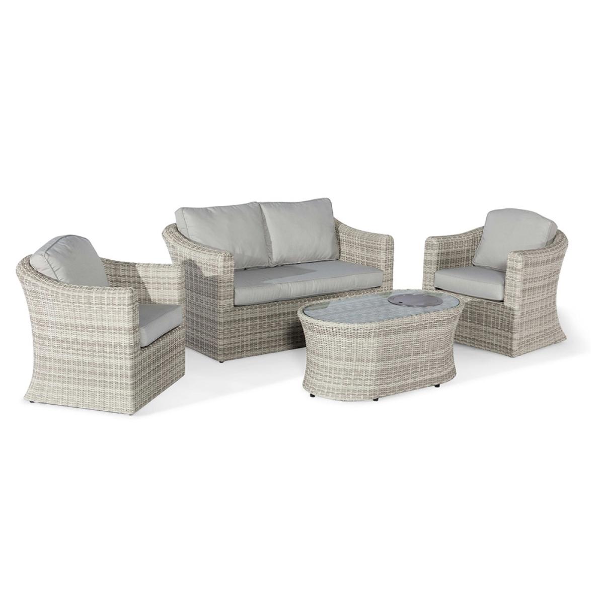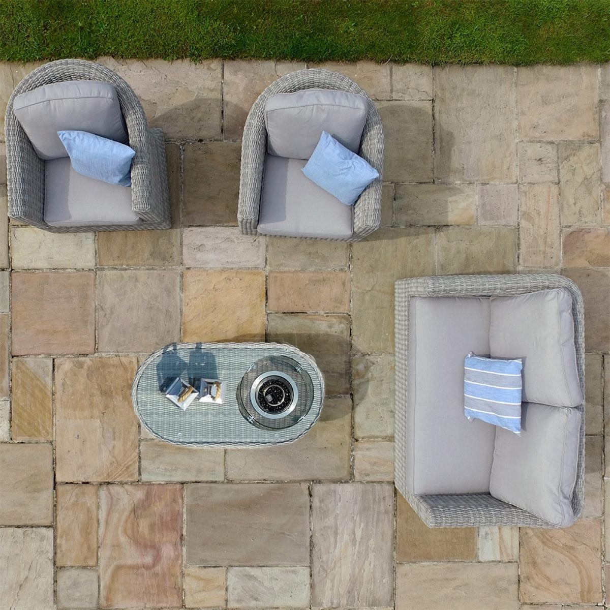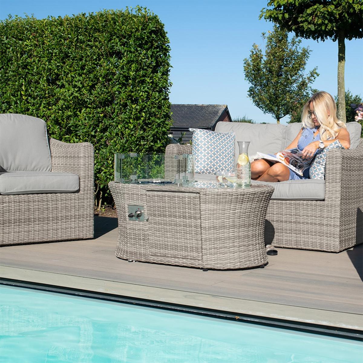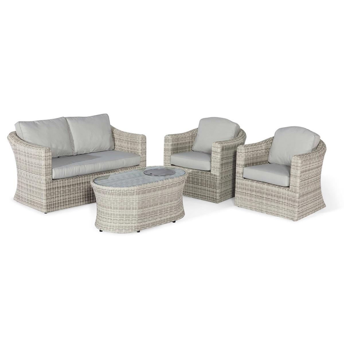 This Maze Rattan Oxford 2 Seat Sofa Set with Fire Pit Coffee Tableallows you to be sociable but can also provide you with that all important personal space! No one likes sharing the sofa after all! The wide two-seat sofa and separate armchairs are the perfect combo to any garden. Whether you're wanting to follow the sun or even take yourself away for a quick 30-minute downtime, it won't be too much hassle to readjust the seats. Manufactured from the highest quality polyurethane rattan woven onto a powder-coated aluminium frame, with its curved structure and natural modern grey finish, this set will look the part in your outdoor space! Invite your friends over and allow yourself to sink into the luxury filled cushions whilst soaking up your daily dose of vitamin D!.