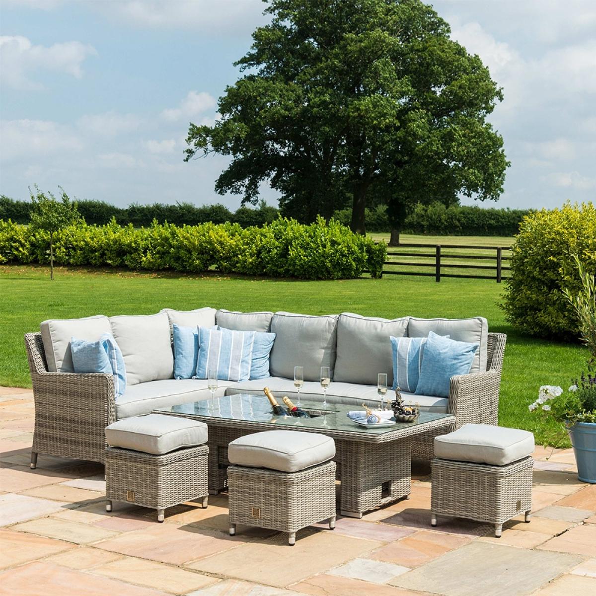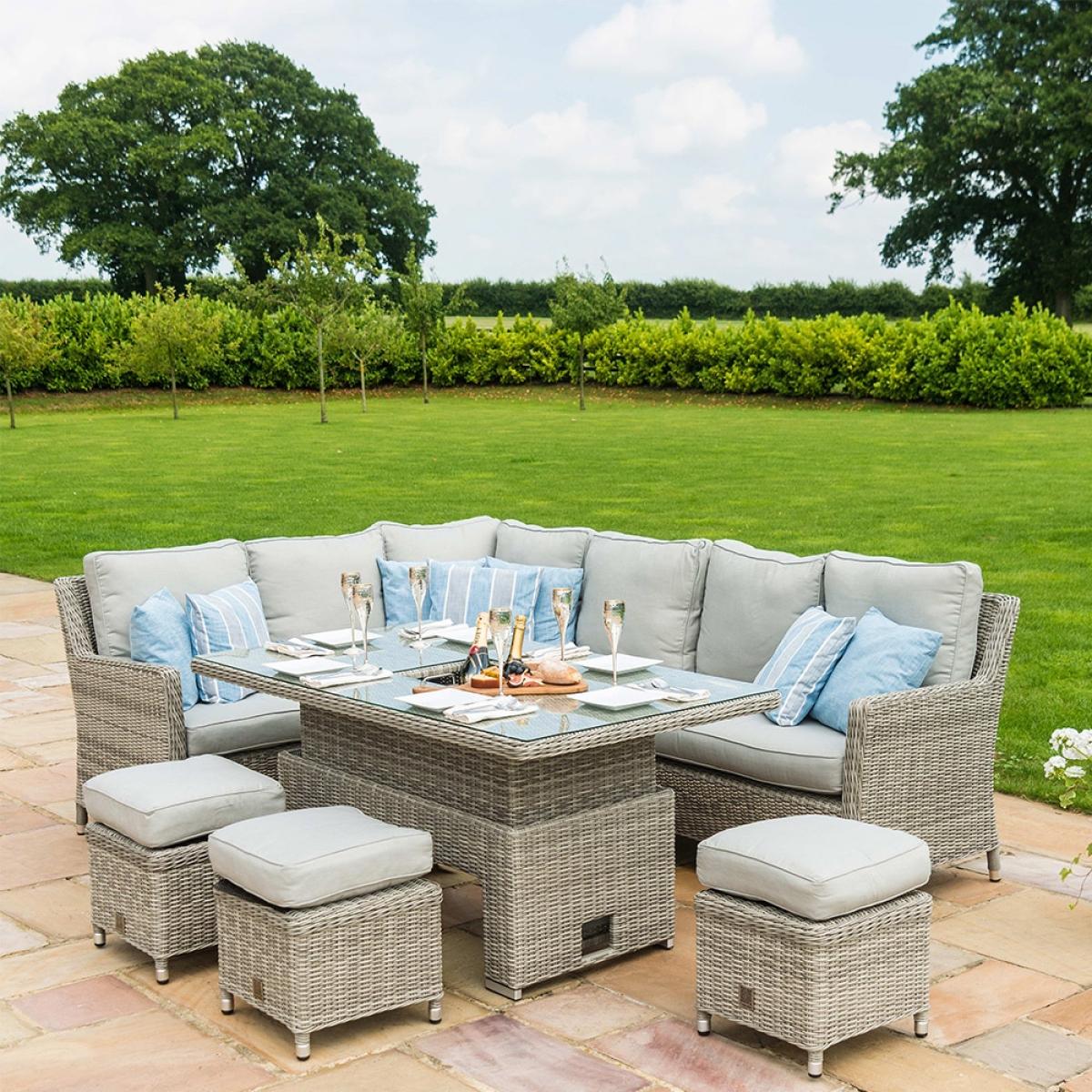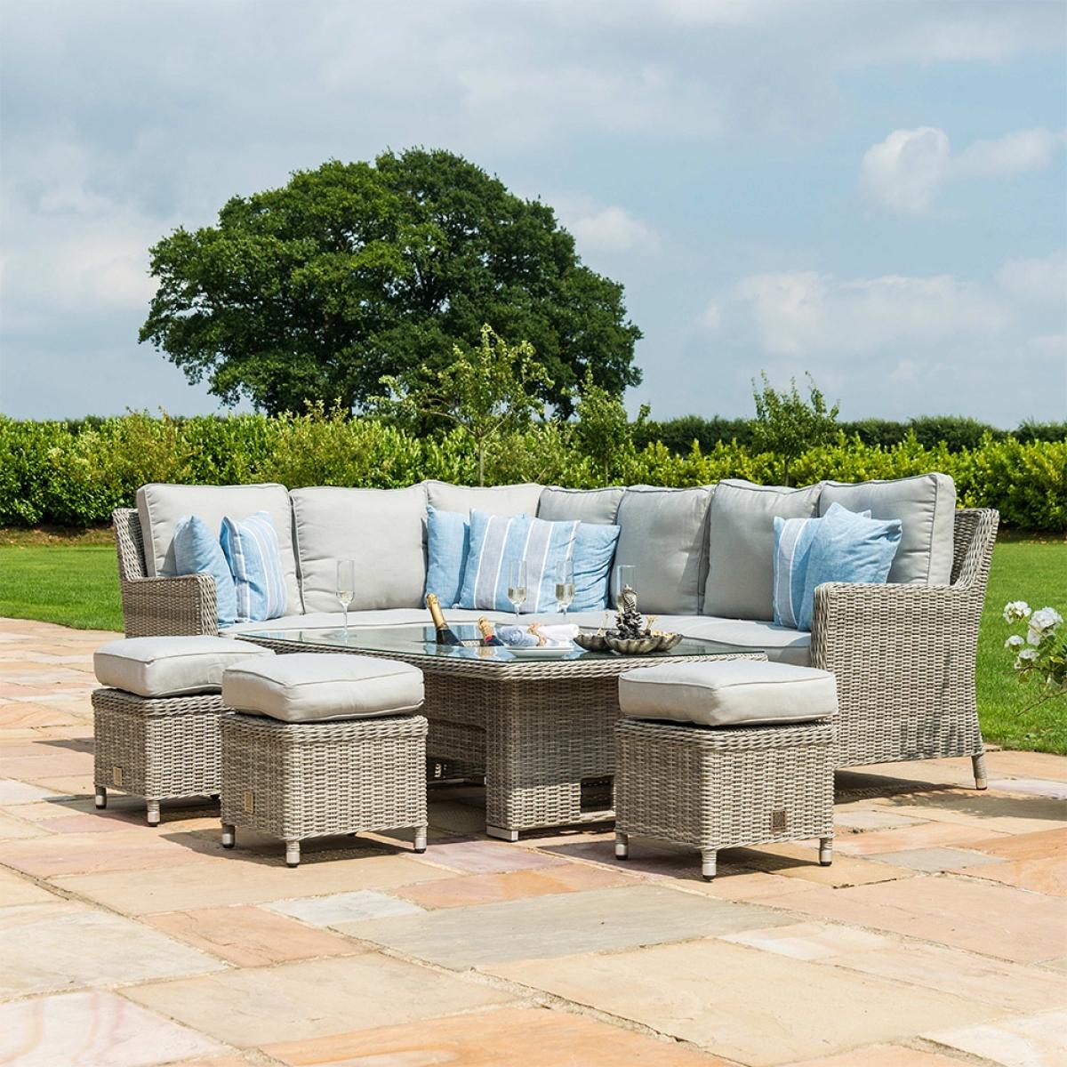 Create an alfresco haven with the Maze Rattan Oxford Corner Dining Set with Ice Bucket! A tempered glass table with the added feature of a integrated ice bucket, is the focal point of your outdoor dining experience, with the added feature of a height adjustable table. Meaning you can go from casual coffee table to decadent dining in seconds! The luxurious deep filled cushions on the corner sofa and 3 extra dining stools allows for pure comfort and relaxation, with enough space to gather all the family around for a summer feast!.