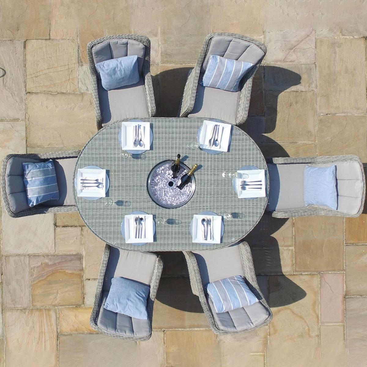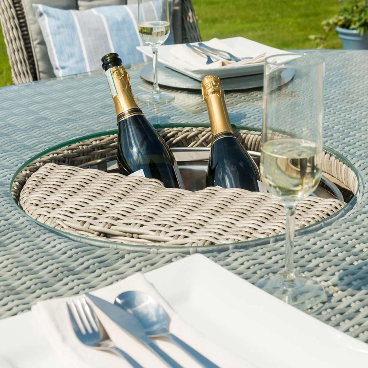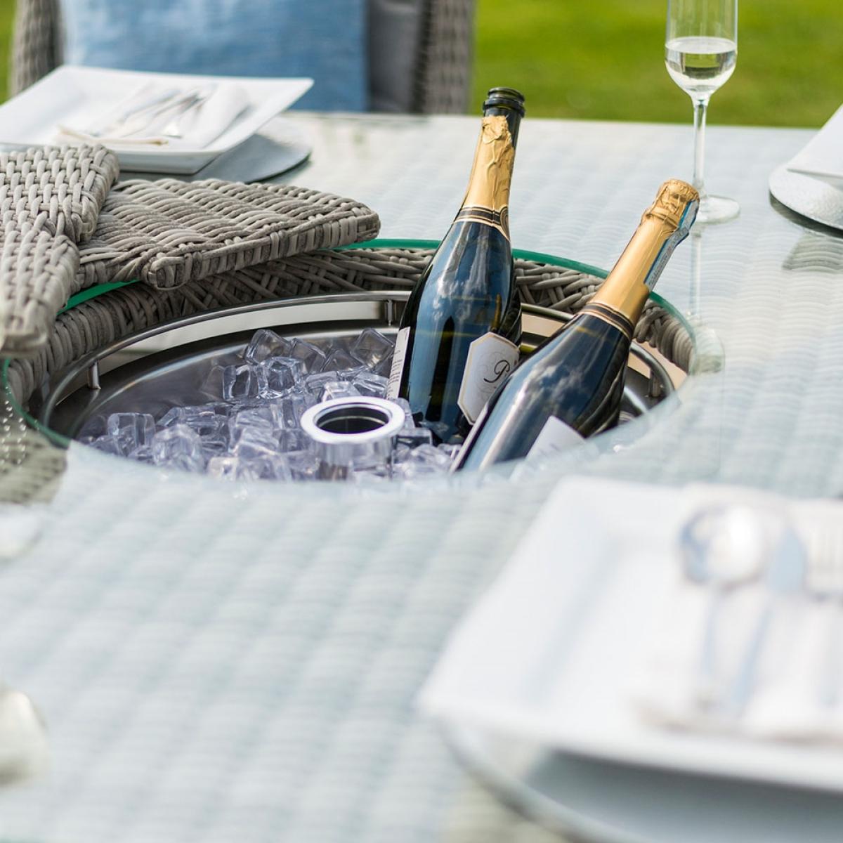 Keep your Prosecco chilled to perfection with the Oxford Oval Ice Bucket Dining Set from Maze Rattan. Manufactured from the highest quality PU rattan woven onto a powder coated aluminium frame, it comes with an integrated ice bucket and lazy susan, catering to all your needs. So if you're hosting a party and need the drinks chilling on ice - no problem, or a cheeky lunch with friends where you want to share the olives; this table can do both. The subtle grey weave and cushions pair beautifully together, giving a timeless finish. So sit back, relax and soak up those rays!.