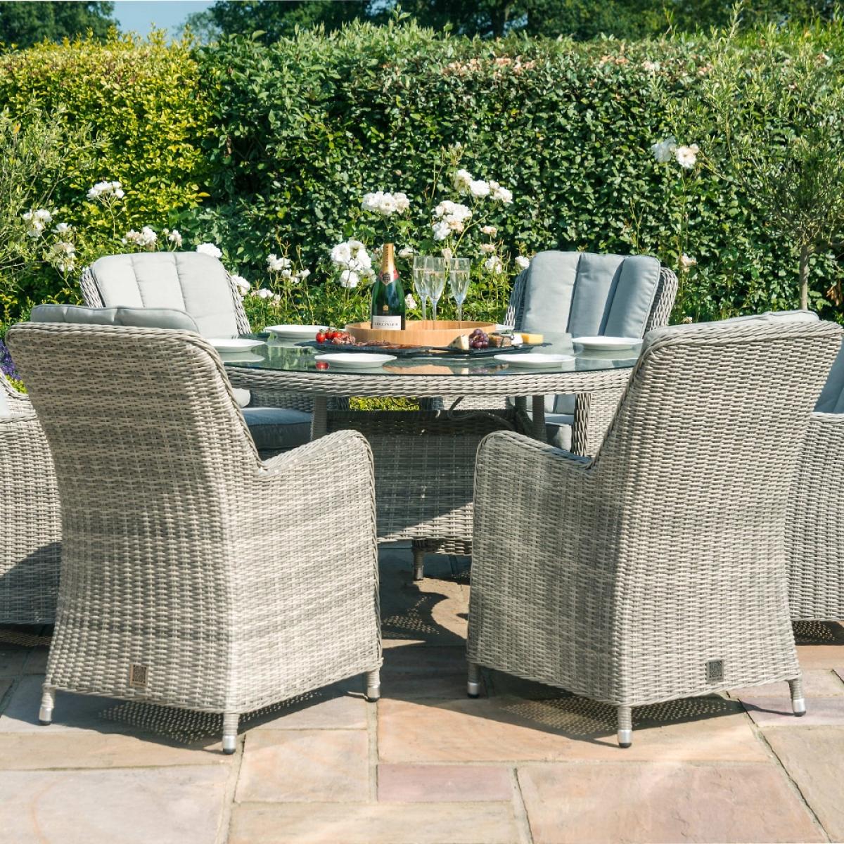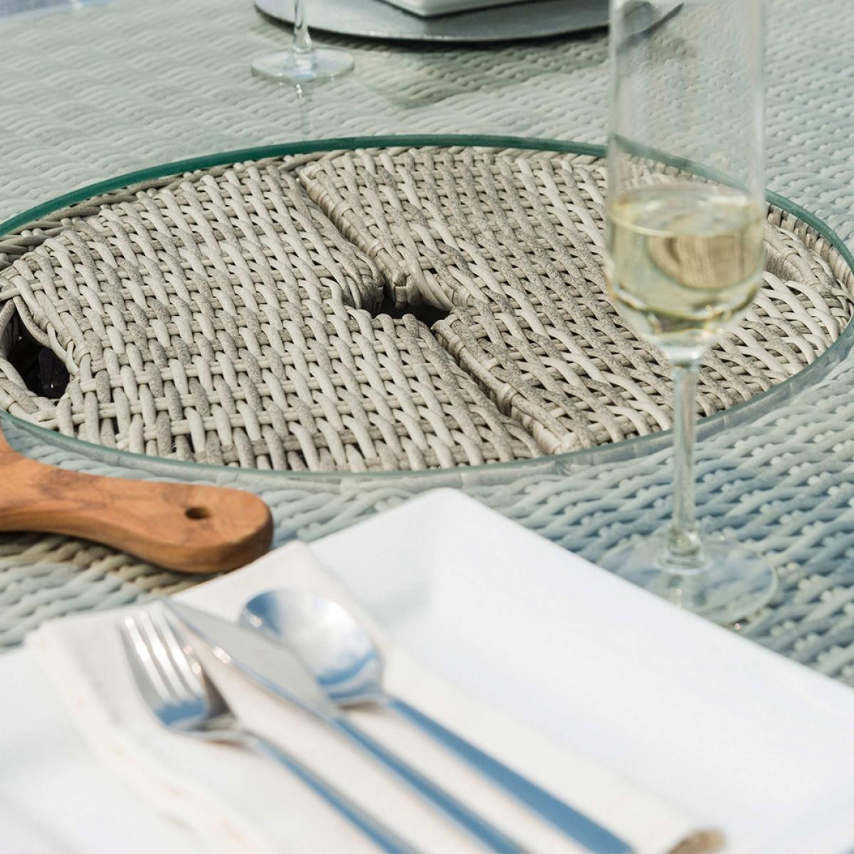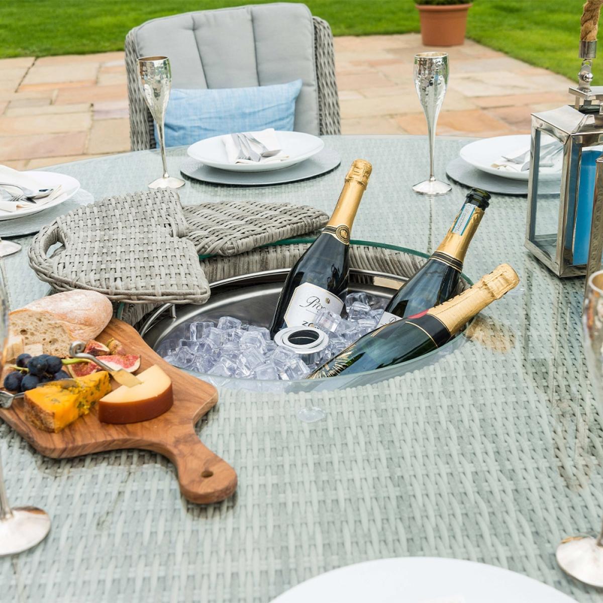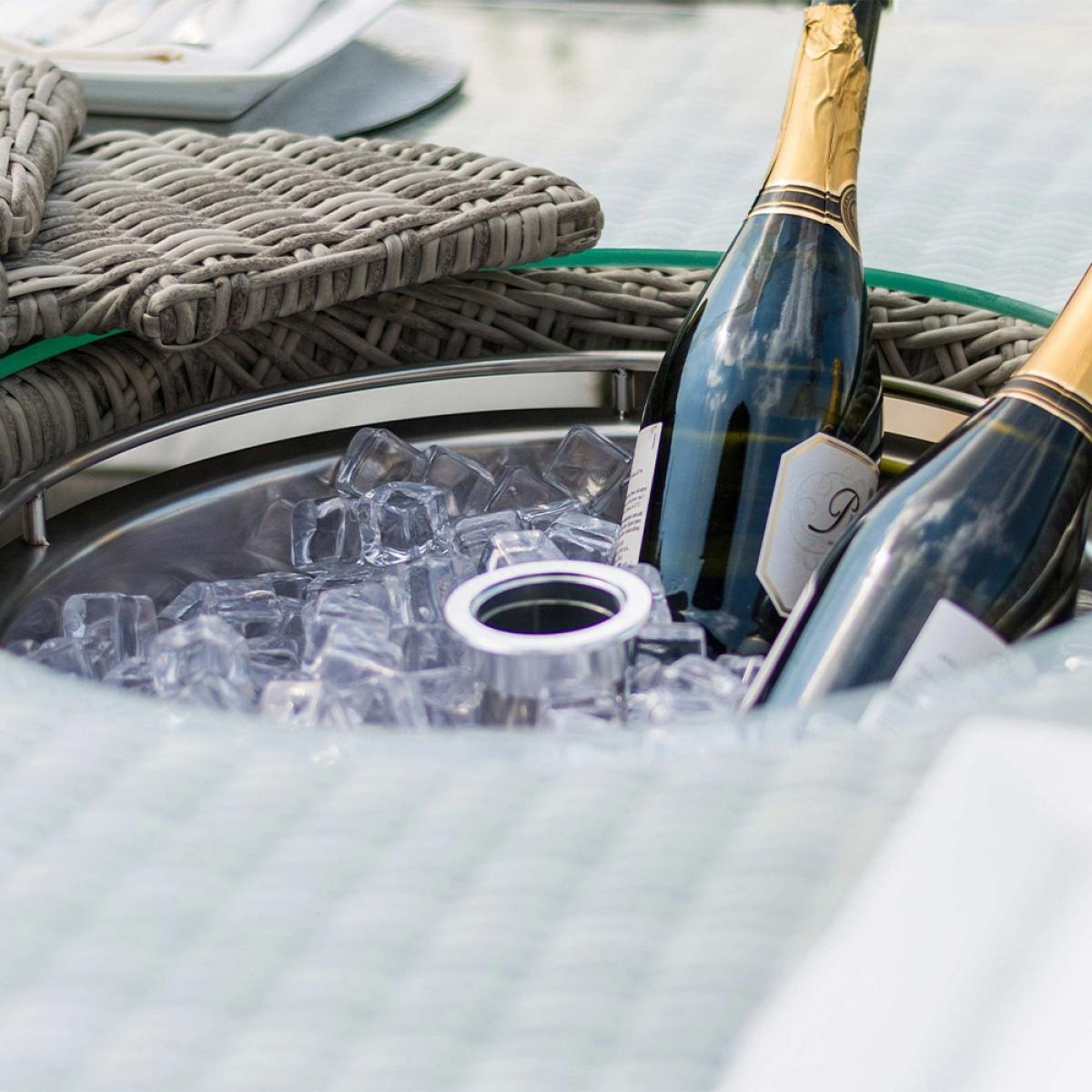 Upgrade your garden furniture with the premium Maze Rattan Oxford Round Ice Bucket Dining Set with Venice Chairs. Including 6 luxurious cushioned seats, sit around the glass top dining table and enjoy BBQ's, buffets or just a bottle of bubbles with your nearest and dearest! Keep drinks chilled with the integrated ice bucket and with a lazy susan, not more leaning over to pass the salt! Just sit back, relax and enjoy yourselves in pure comfort. And with showerproof cushions and all weather rattan frames, if the heavens decide to open, you don't need to worry. Now what are you still doing on this page? It's time to head to the checkout!.