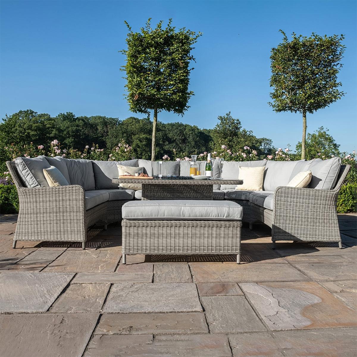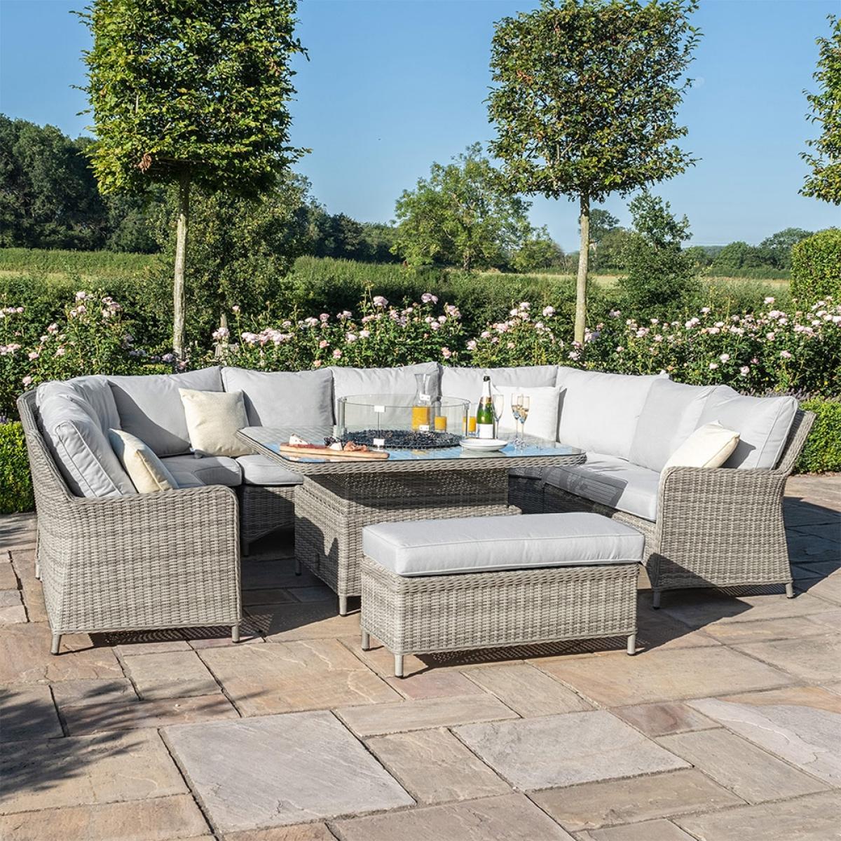 The trendy grey hues of this Maze Rattan Oxford Royal U-Shaped Sofa Set with Fire Pit is going to take centre stage in your outdoor area. With the U shaped setting and extra bench you'll no longer need to stress about not having enough seats for you or your guests to sit. The luxurious filled cushions and integrated firepit will leave you feeling relaxed everyday and will keep you coming back all year round or just to keep you warm and cosy whilst the sun sets. With the fire pit centre stage it creates a happy and relaxed setting, giving you full access to cooking and nibbling into the night without having to move too far!.