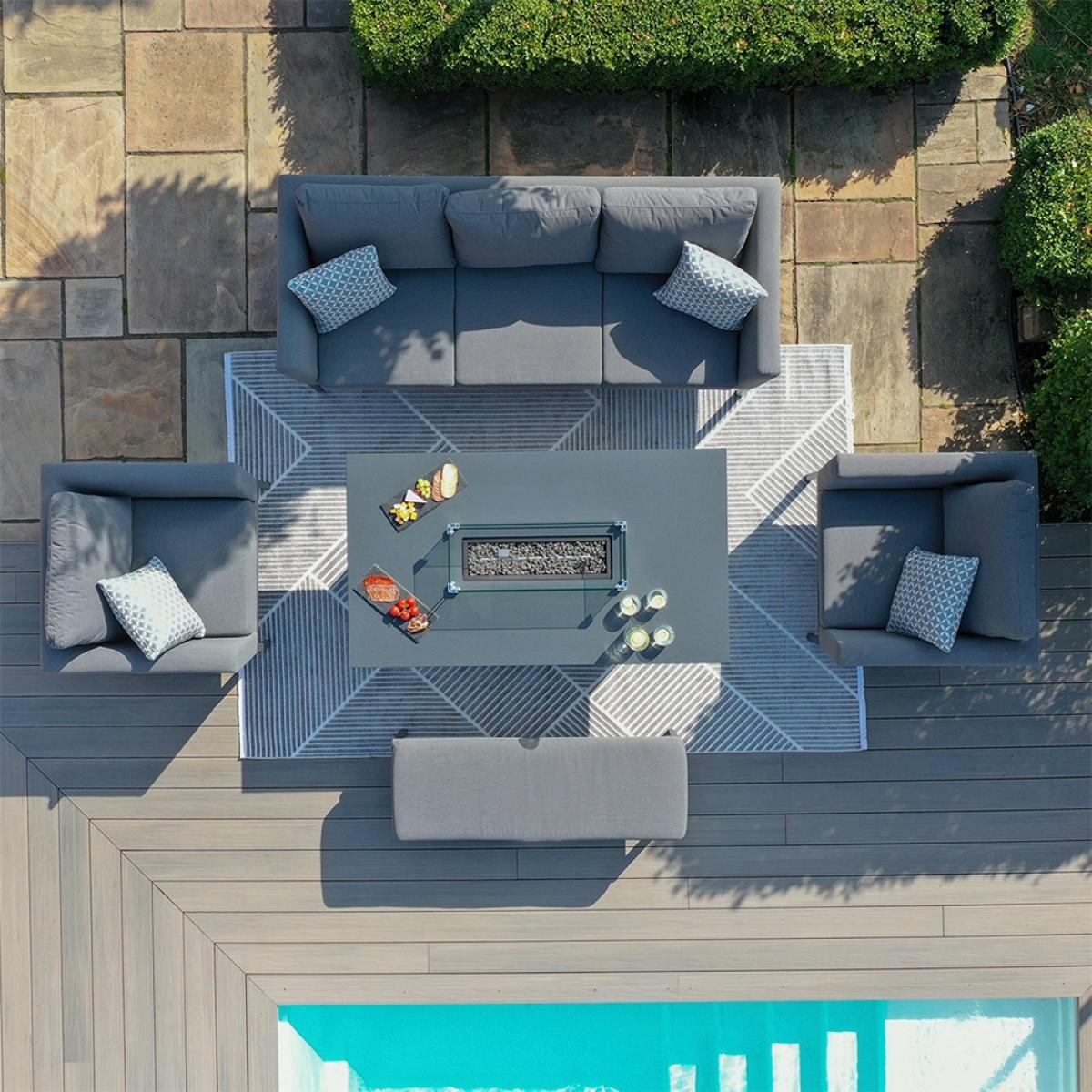 Available in a choice of colours; sit back and relax around the. Maze Rattan Pulse 3 Seat Sofa Dining Set with Fire Pit Table. Comfortably seating 7 guests, with the fire pit at the centre keeping you all cosy and warm, the party can continue late into the night with the flickering flames setting the mood for the evening. The modular design and lightweight aluminium frames are easy to move, so when you're not gathered around the fire pit table, the individualpieces can be positioned wherever you like. Follow the sun around the garden, move to a quieter corner, or take shelter if the heavens decide to open! Although as the cushions are showerproof, UV, frost and fade resistant it's not a worry if you make a run for it, the set can remain outside all year round without worry. Part of the Pulse range from Maze Rattan, select the set to suit you!.