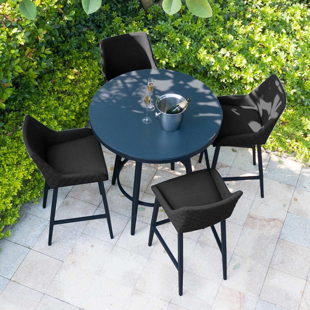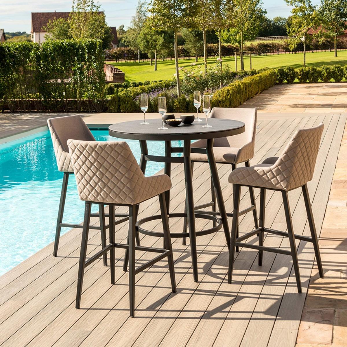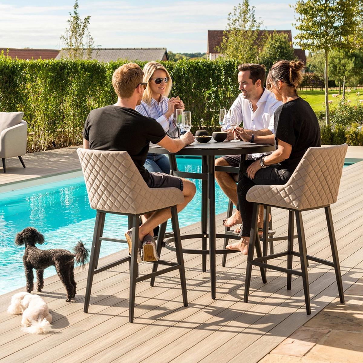 Complete with a stylish round bar table and 4 bar stools, the. Maze Rattan Regal 4 Seat Round Bar Set is the ultimate spot for entertaining! The bar stools have been covered and cushioned with weatherproof, UV and stain resistant materials so whatever the weather you can leave your garden furniture outdoors. Featuring an attractive quilted design and spray stone table top, this might just become your new favourite spot! Quick drying, easy on the eye and super comfortable Maze Rattan have thought of everything. Available in a choice of colours, select the set to suit your space! Now grab a few glasses and enjoy your new Maze Rattan garden furniture!.