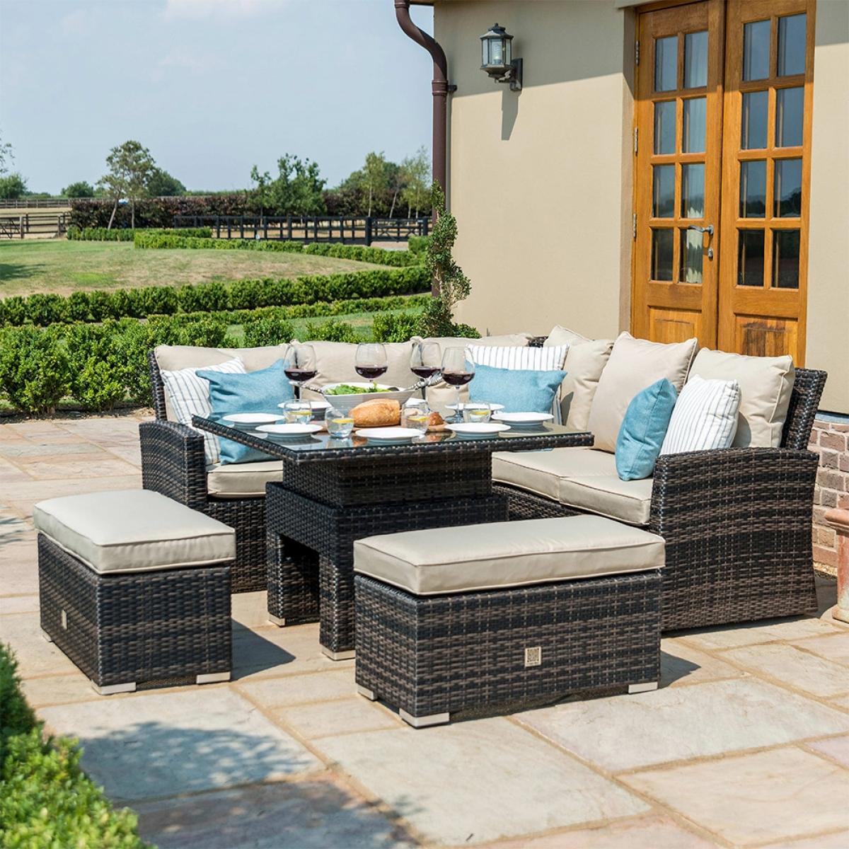 Summer has arrived! Well it certainly feels like it with the Maze Rattan Richmond Corner Bench Set with Rising Table! You'lllove this statement garden corner set with not only a corner sofa, but two benches too! So you have ample space to invite all the family around. The added feature of a rising table means that it can transform from a coffee table right up to a full size dining table, with tempered glass included. And to top it off, all the cushionsare deep filled for optimum comfort not to mention showerproof in case the heavens decide to open! Whatever the weather, the Richmond Corner Bench set is your must have garden piece this year!.