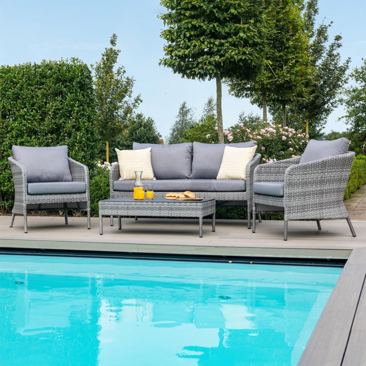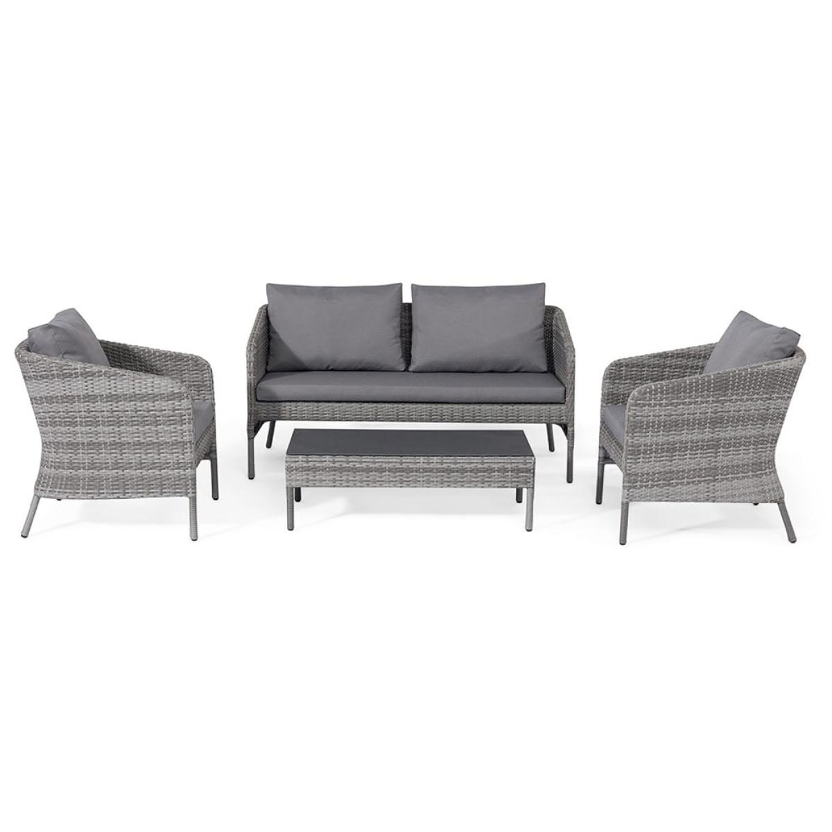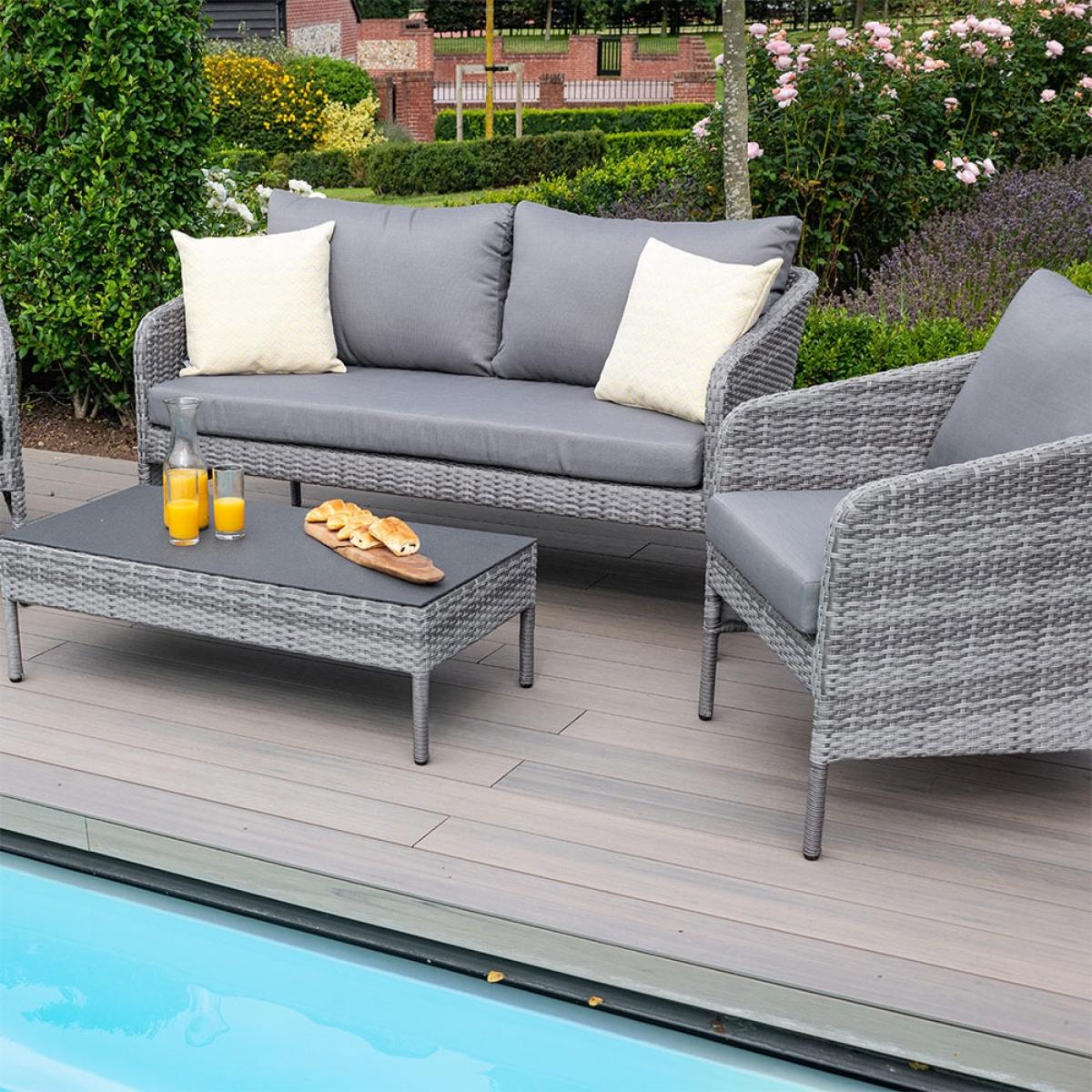 Stylish and space saving - your patio will score tens across the board with the. Maze Rattan Santorini 2 Seat Sofa Set! Stackable to save space; if you're planning a sit down out in the garden, arrange the two seater sofa, armchairs and coffee table in your suntrap. Four can sit comfortably and settle into the deep filled stain and showerproof cushions - great if there's a downpour or the kids decide a water-fightis needed! The low, tempered glass coffee table slots neatly under the sofa when not being used. All pieces have been made with durable and lightweight aluminium frames and a poly-rattan weave in grey - completely UV and frost resistant, leave them outside all year round without worry. Easy to care for and pleasure to look at and sit down on, the Maze Living Santorini Garden Lounge Set is worth every penny!.