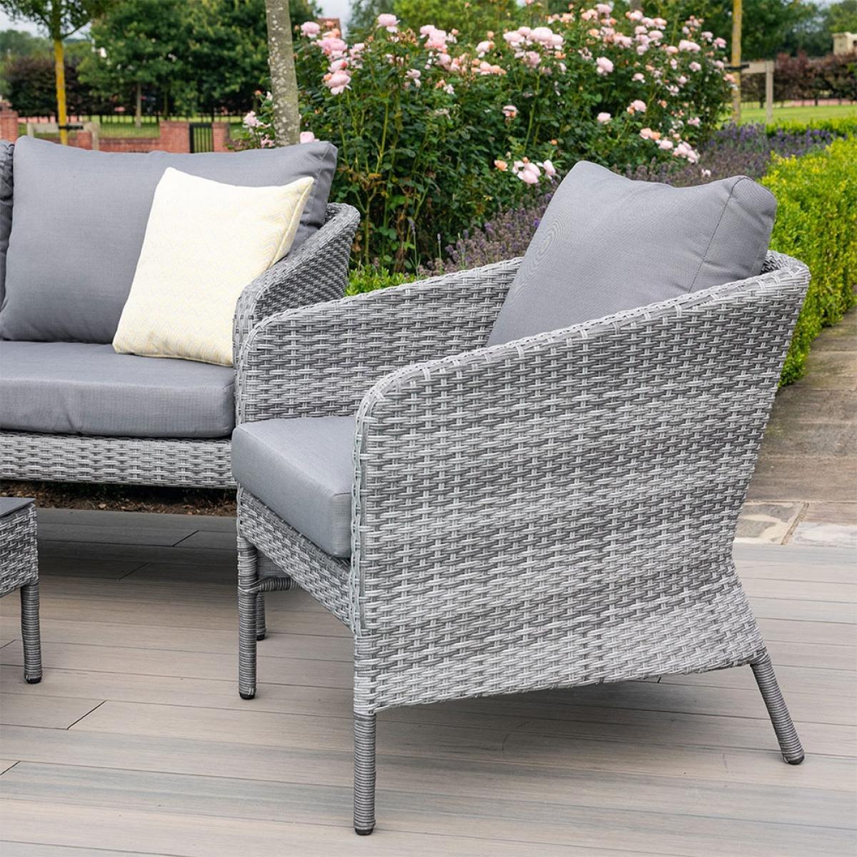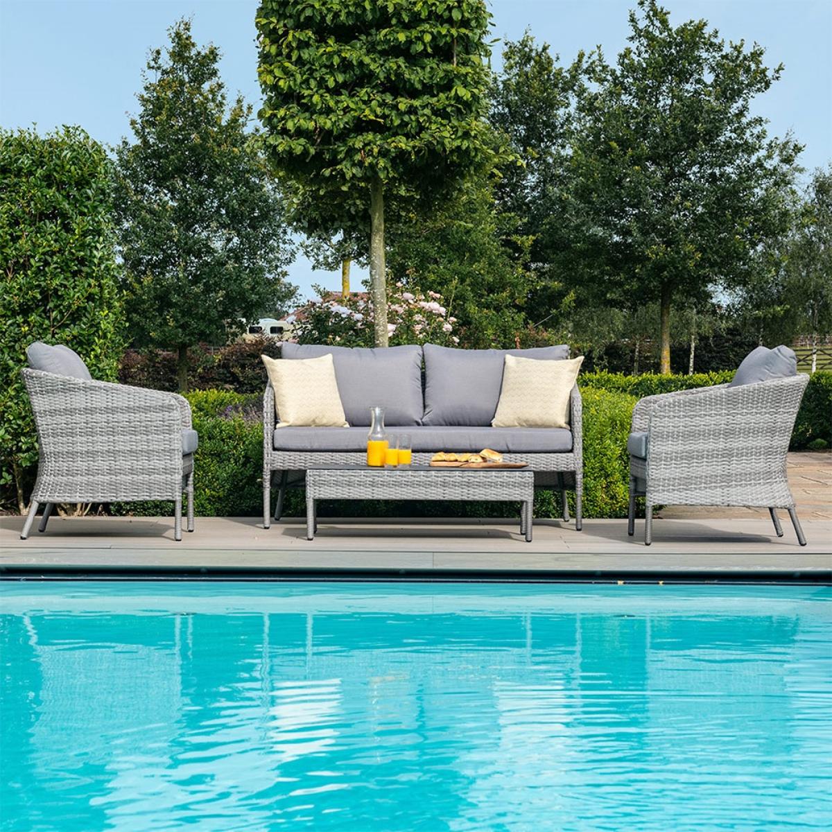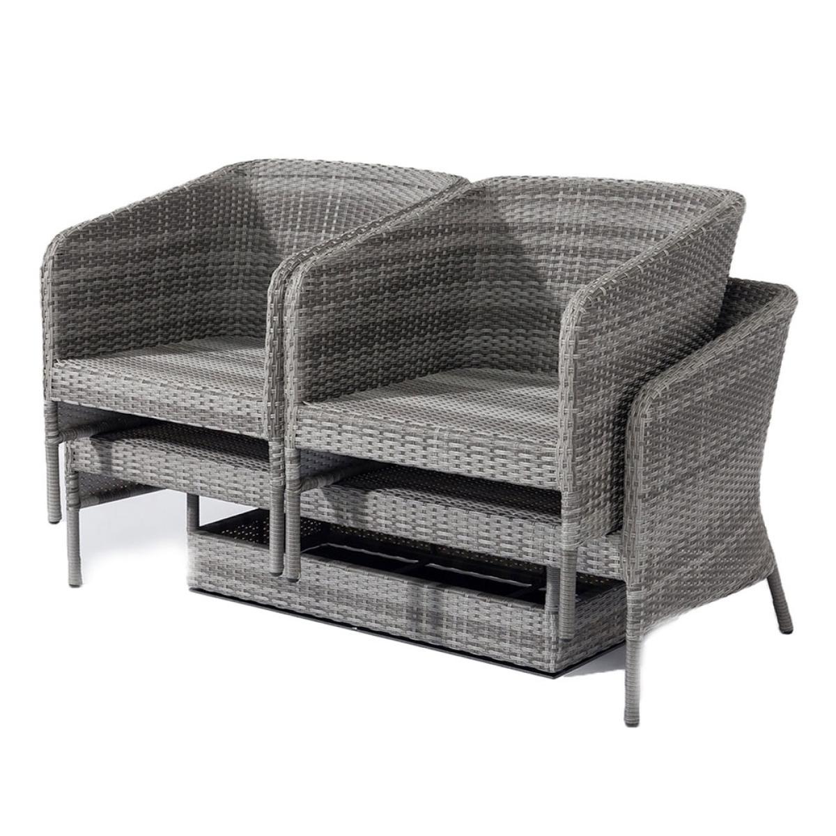 Stylish and space saving - your patio will score tens across the board with the. Maze Rattan Santorini 2 Seat Sofa Set! Stackable to save space; if you're planning a sit down out in the garden, arrange the two seater sofa, armchairs and coffee table in your suntrap. Four can sit comfortably and settle into the deep filled stain and showerproof cushions - great if there's a downpour or the kids decide a water-fightis needed! The low, tempered glass coffee table slots neatly under the sofa when not being used. All pieces have been made with durable and lightweight aluminium frames and a poly-rattan weave in grey - completely UV and frost resistant, leave them outside all year round without worry. Easy to care for and pleasure to look at and sit down on, the Maze Living Santorini Garden Lounge Set is worth every penny!.