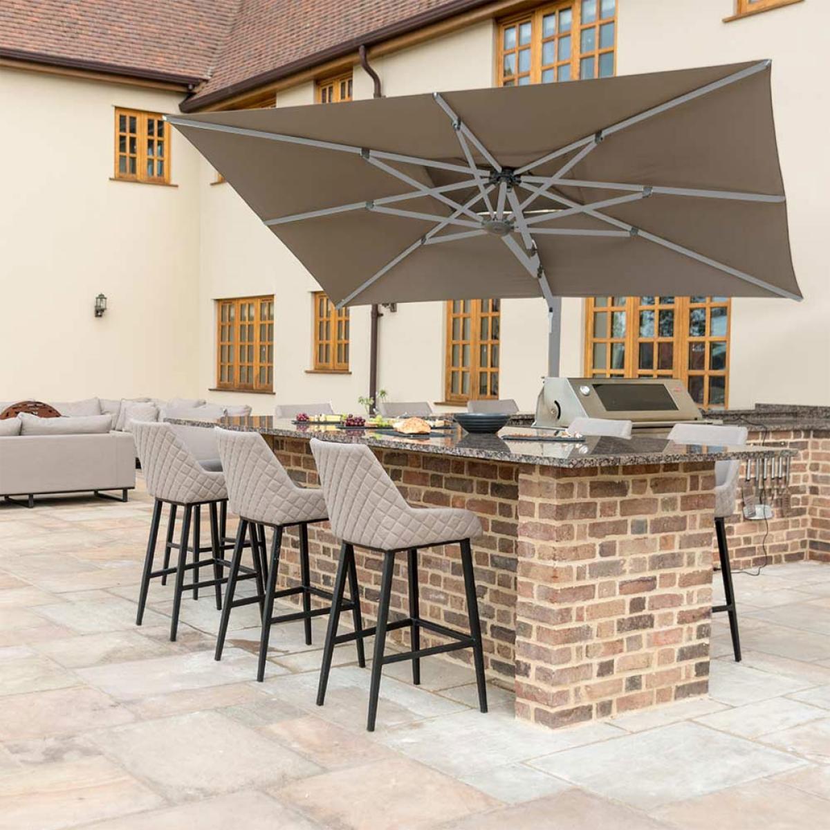 I love this parasol for its blend of practicality and style, making it a versatile addition to both contemporary and traditional outdoor spaces. The Maze Rattan Titan's rotating feature offers effortless sun coverage management, while the LED lights add a welcoming glow for evening gatherings. Its neutral tone complements various colour schemes and materials, from rustic brick kitchens to sleek modern patios. To style it effectively, consider pairing with weatherproof textiles in muted shades to enhance its understated elegance, and incorporate outdoor furniture with natural textures or rattan elements for a cohesive look. Whether in a garden, courtyard, or large balcony, this parasol effortlessly elevates the outdoor aesthetic while providing much-needed shade and ambiance.