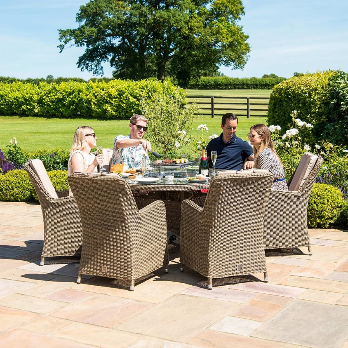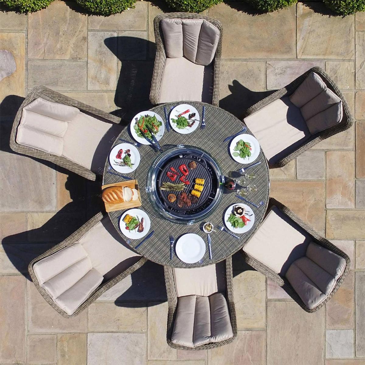 Revamp your outdoor space with the Winchester 6 Seat Round Fire Pit Dining Set with Venice Chairs and Lazy Susanfrom Maze Rattan. Enjoy in all weather conditions, relax during the summer with the BBQ cooking whilst catching a few rays and during the colder months cosy up with the fire pit keeping you warm and content with a hot cuppa in hand. Paired with a lazy Susan, that lazy Sunday feeling will certainly become a weekly encounter, spin it around for your guests to enjoy a variety of condiments with their summer grub! The deep filled cushions and robust structured chairs will provide comfort and support for everyone to appreciate. Constructed from high-quality materials, whilst being completely weatherproof and lightweight, moving this contemporary set around will be a complete breeze. So invite your friends and family over and get that BBQ sizzling for some summer sunshine satisfaction!!.