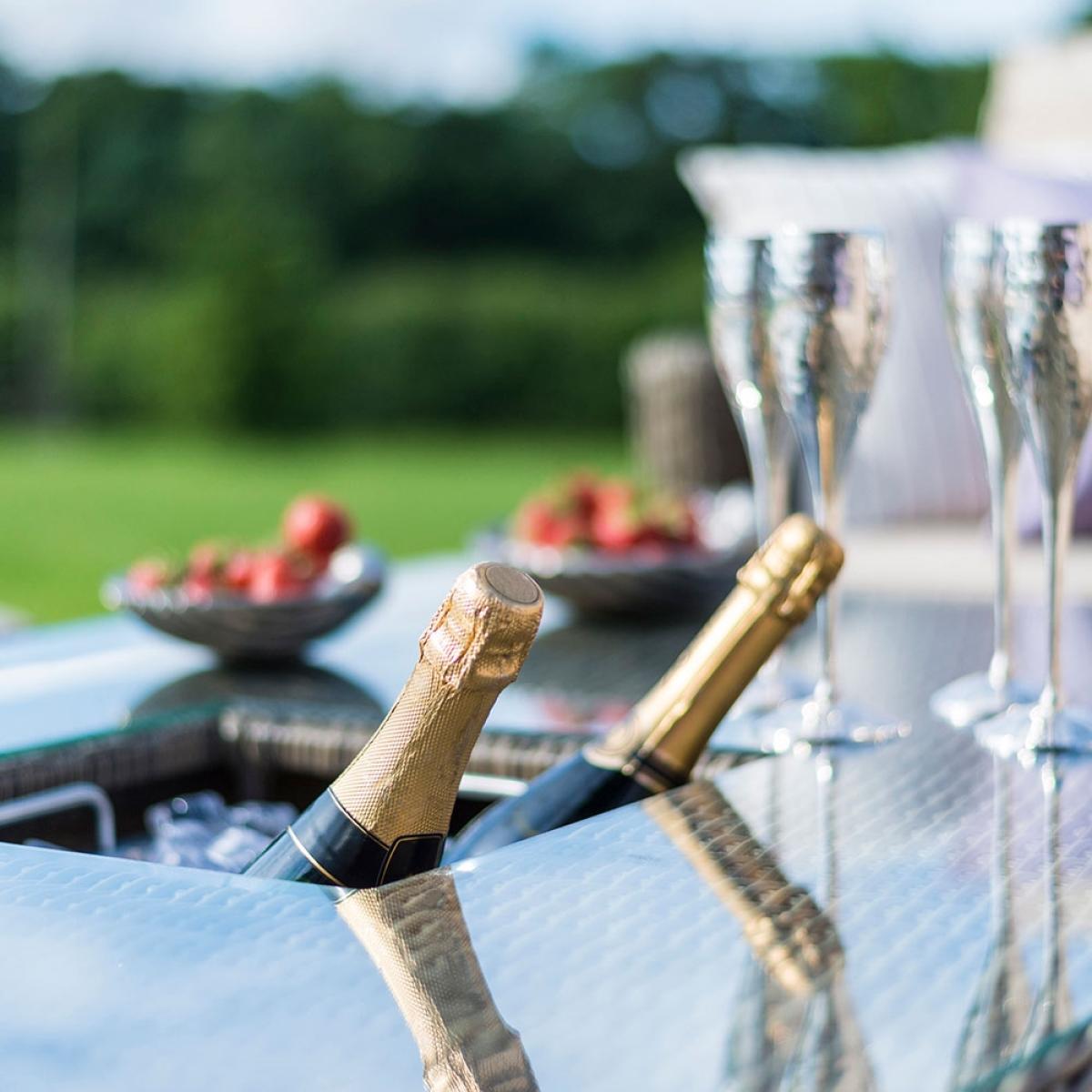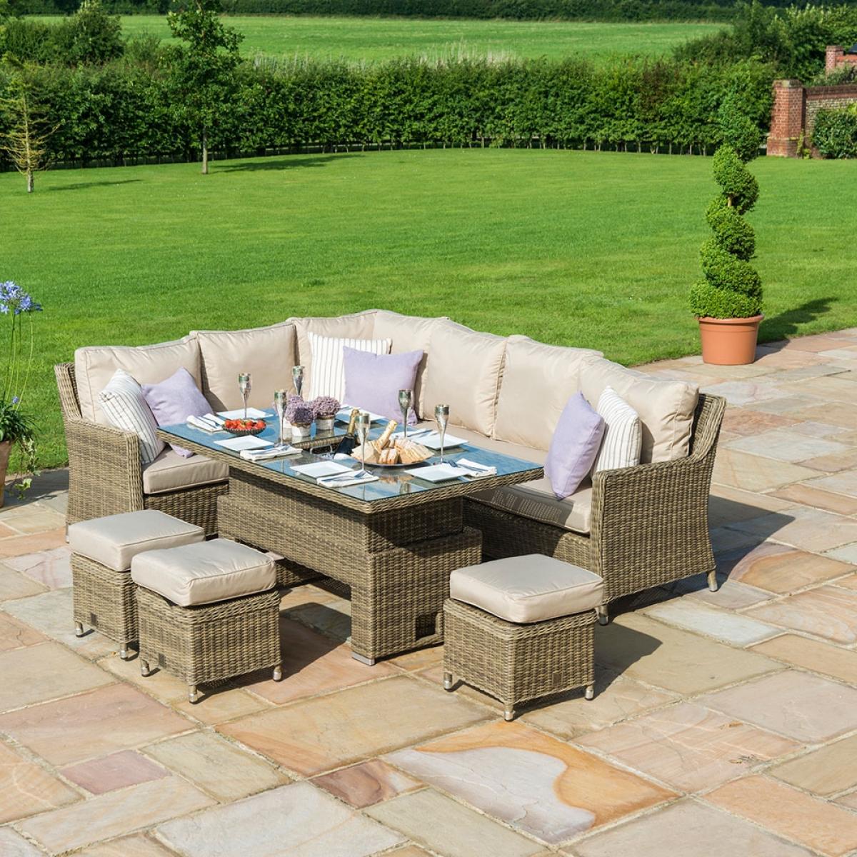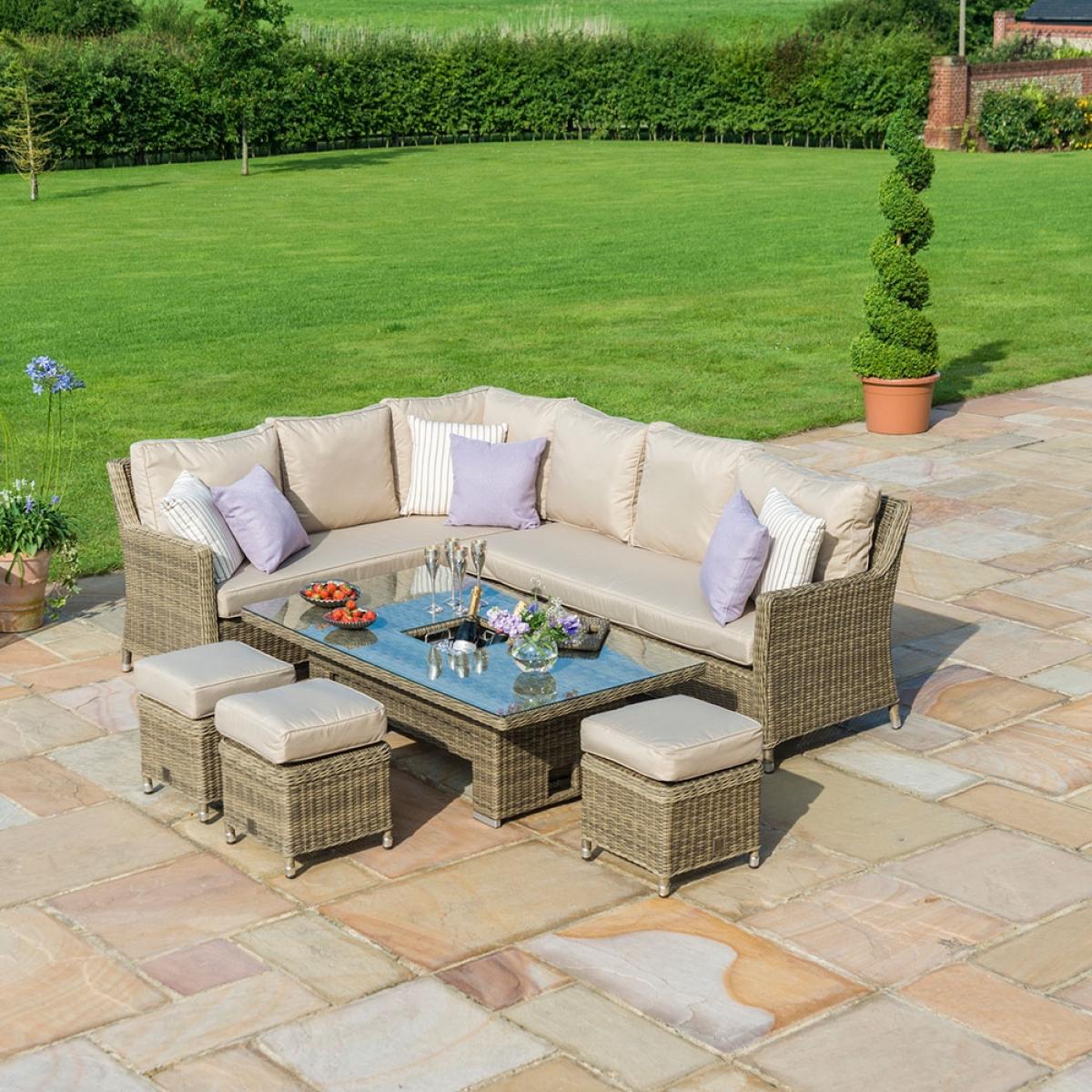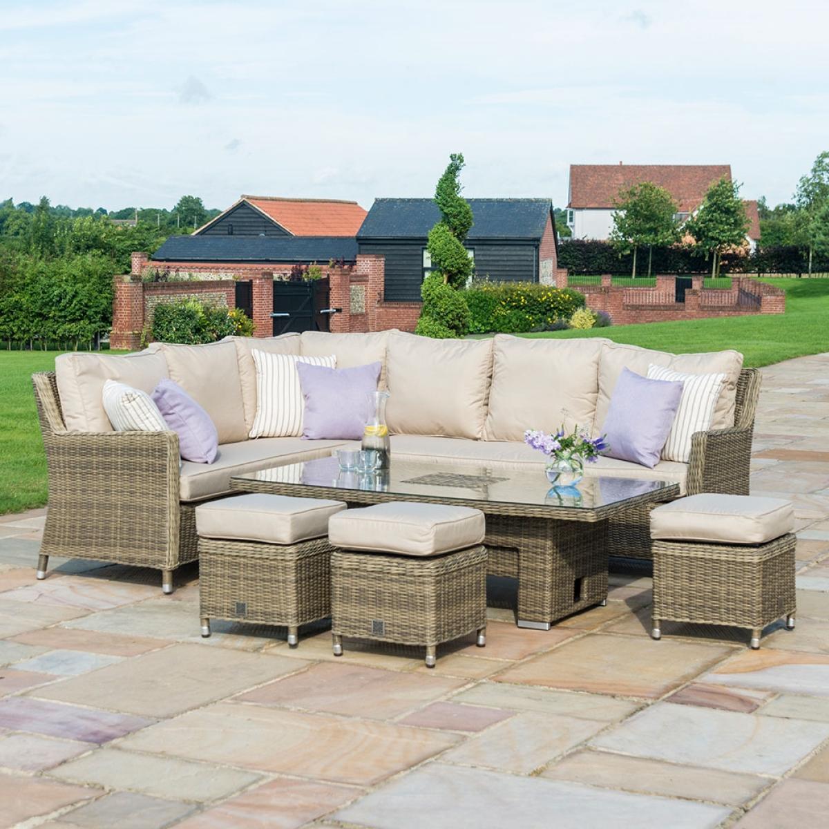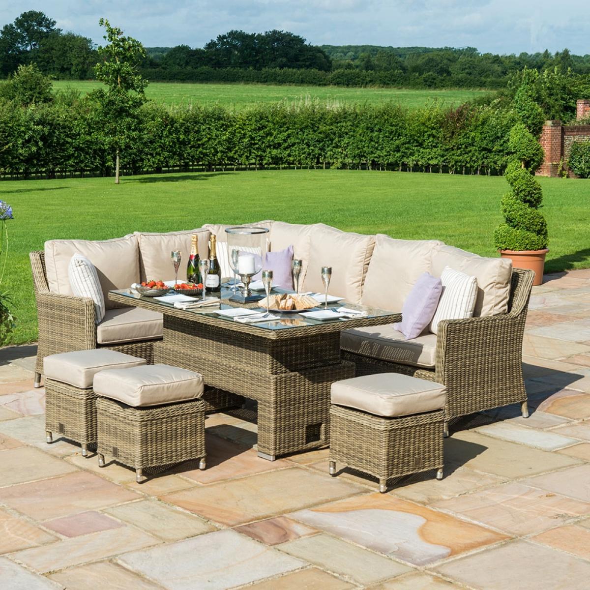 TheMaze Rattan Winchester Corner Dining Set with Ice Bucket and Rising Table would be a great addition to your outside space. Perfect for family BBQs or outdoor entertaining, there's plenty of room for everyone to relax on the corner sofa and 3 stools. Sink into the luxurious showerproof cushions and enjoy dining out in the garden. Featuring an integrated ice bucket at the centre, the height adjustable table can easily be converted from a dining table into a coffee table and adapts to suit your needs. Manufactured from the highest quality PU rattan woven onto a powder coated aluminium frame, this garden set can be left out all year round and withstand even the harshest of weather. Finished in natural and beige tones and part of the Winchester collection, when your outdoor furniture looks this good you'll want to spend every waking moment outside!.