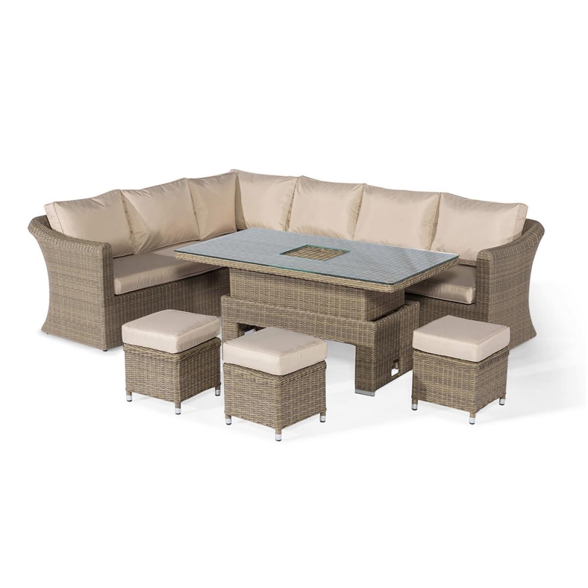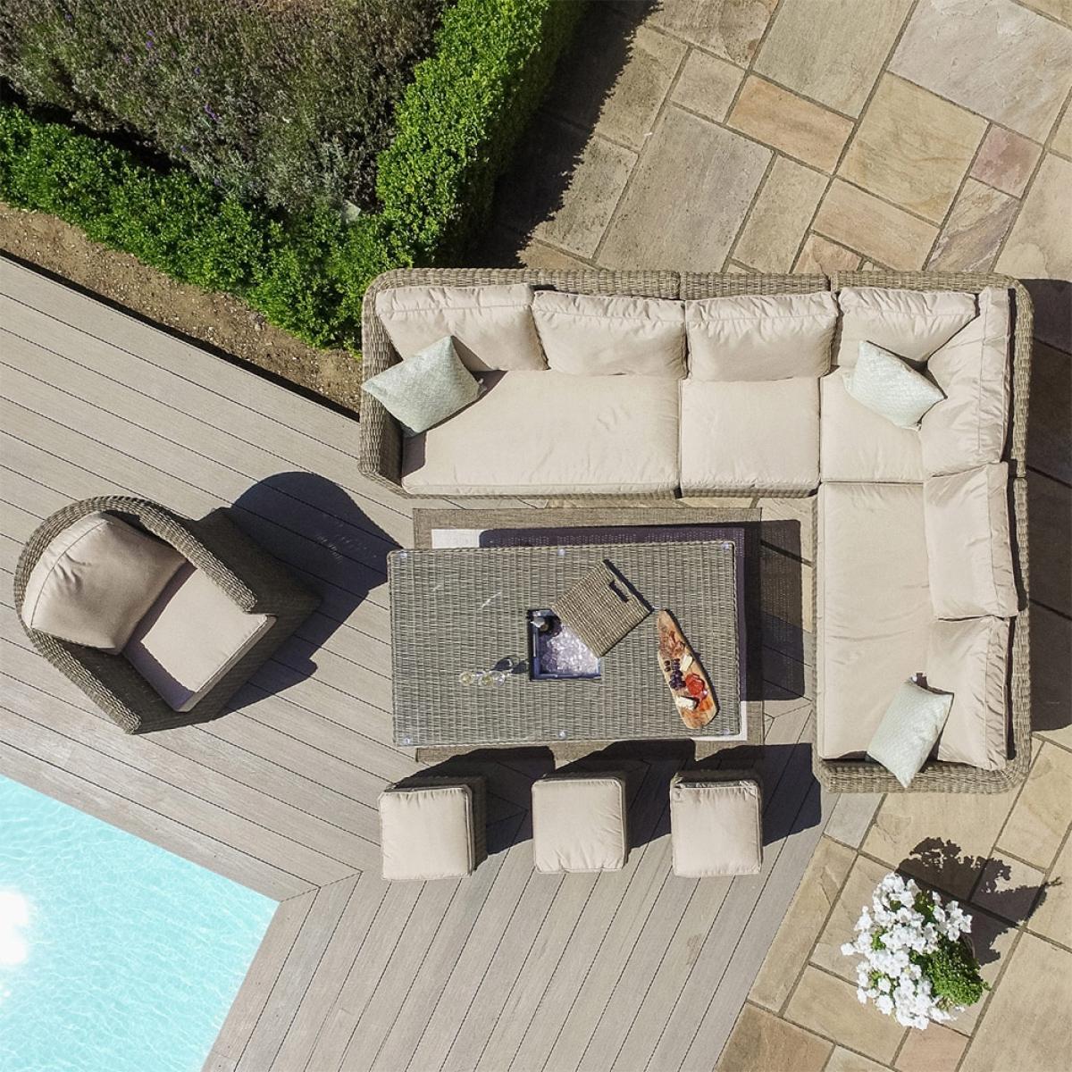 The Maze Rattan Winchester Deluxe Corner Dining Set With Rising Table And Armchair will ensure that no matter how big your family, there will be space for everyone! This stunning piece of furniture will completely transform your outdoor space and thanks to its clever middle section you can have your sofa to the left or right. This set really is perfect for all occasions, when you're lounging in the day the table can be lowered to use as a coffee table. Perfect for having that cooling beverage within reaching distance! As the sun starts to set the table can be lifted to offer an elegant dining space for you and your guests to spend the evening catching up over a delicious meal with wine in hand! what would be better?.