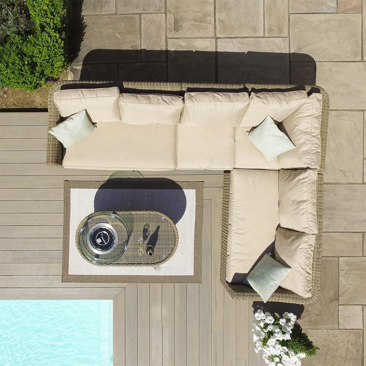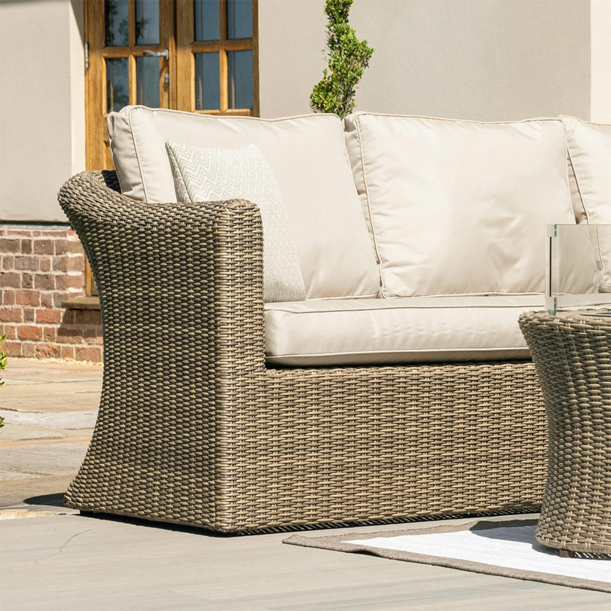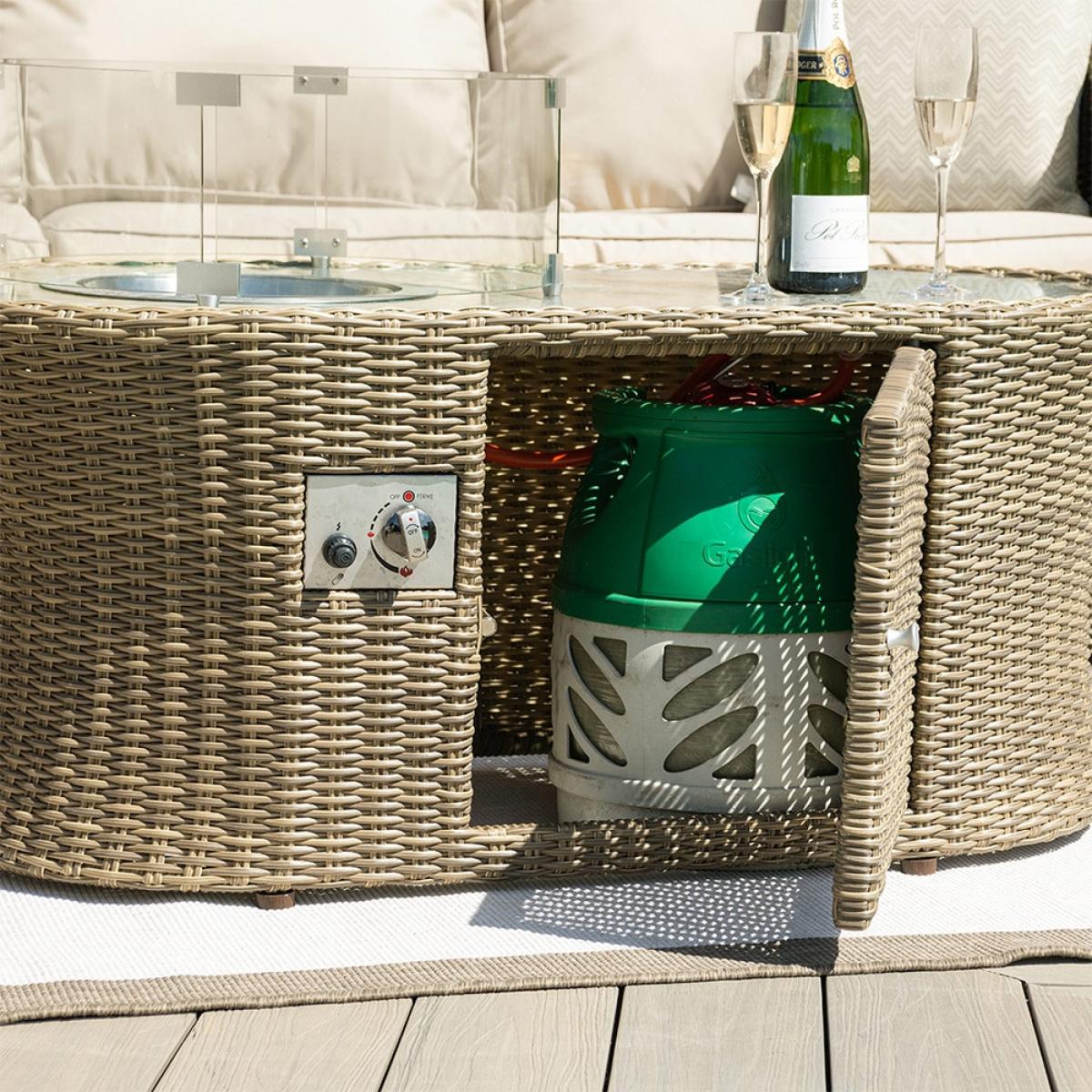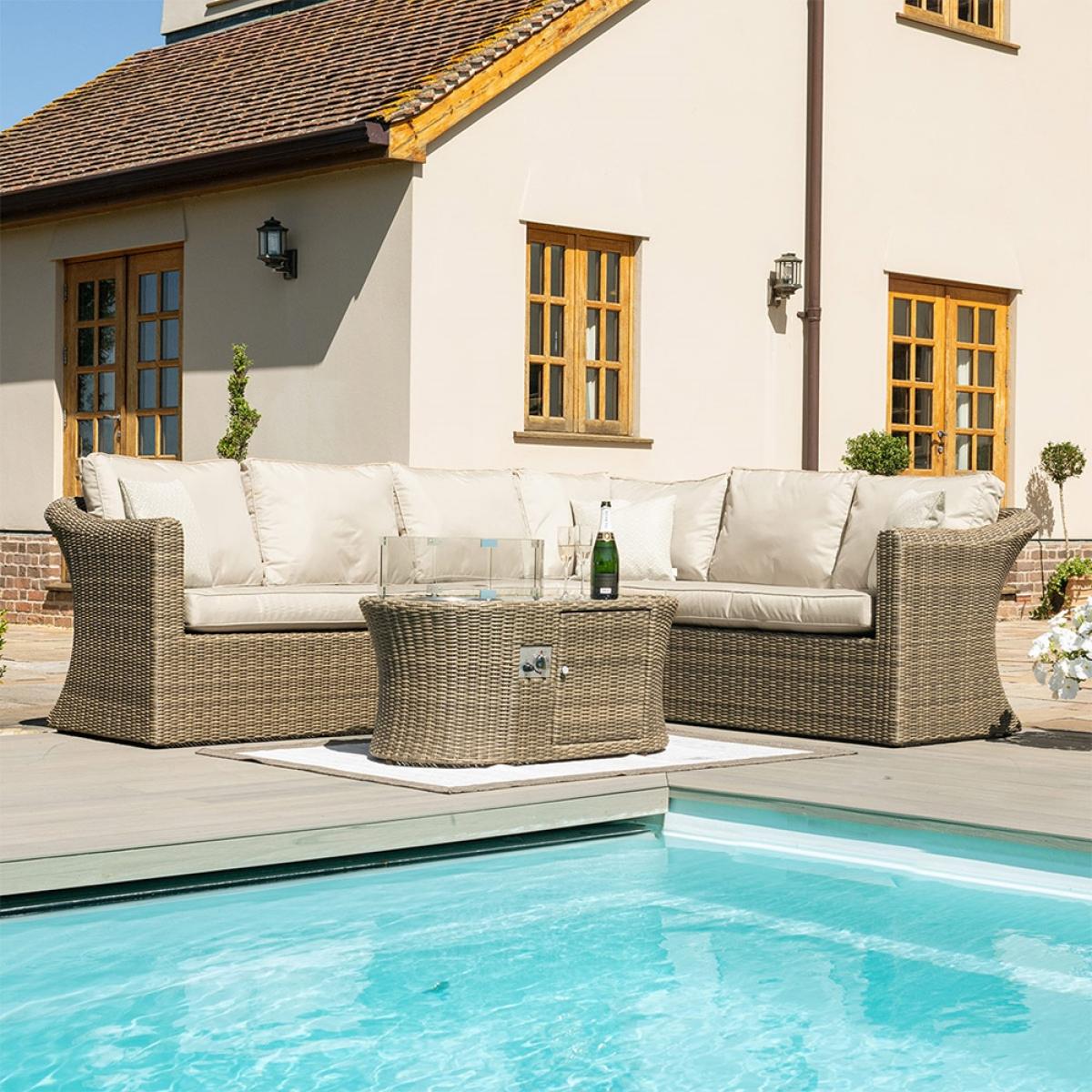 The Maze Rattan Winchester Large Corner Set With Fire Pit is a classic! The beige cushions sit perfectly against the weave, creating a contemporary, sophisticated style. Its curved arms and back make this set unbelievably comfortable and the perfect setting for a mid-day nap! Not only will it make your seating area look smart, but it will also be a truly inviting area for guests to perch whilst taking a breather. Sit back and relax into the warm summer days leading into the light evenings with the fire pit keeping you snug and warm during the enjoyable hours of sunset.