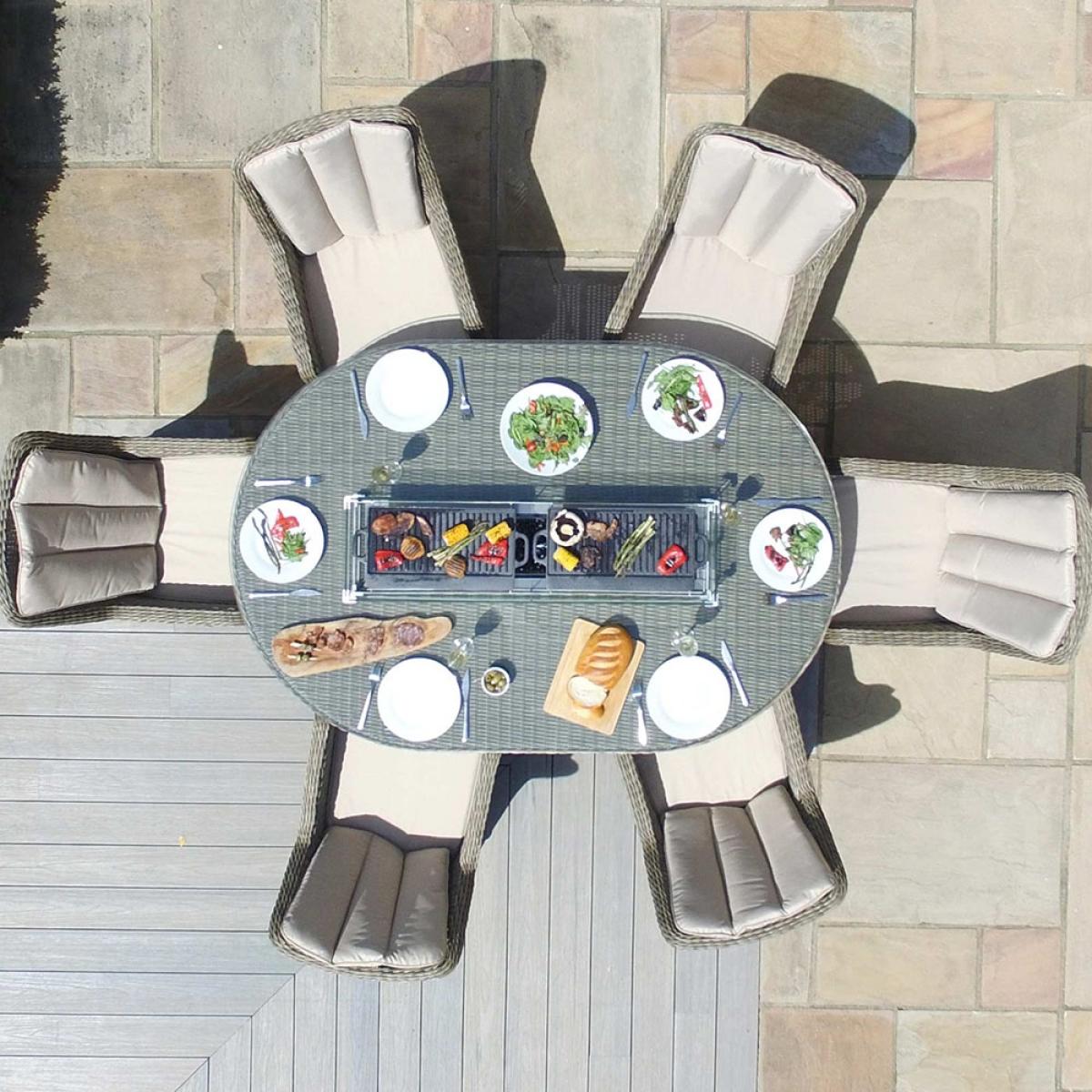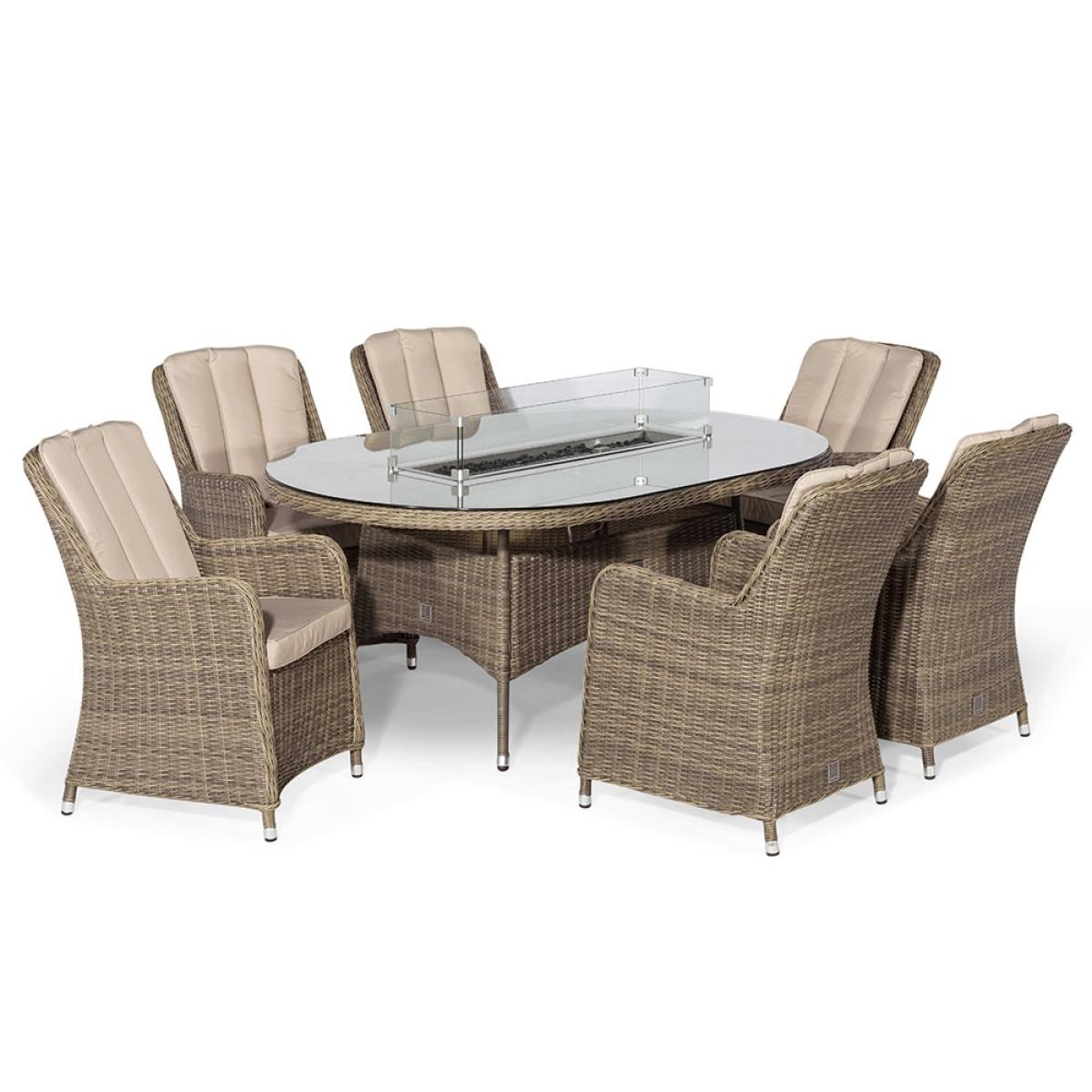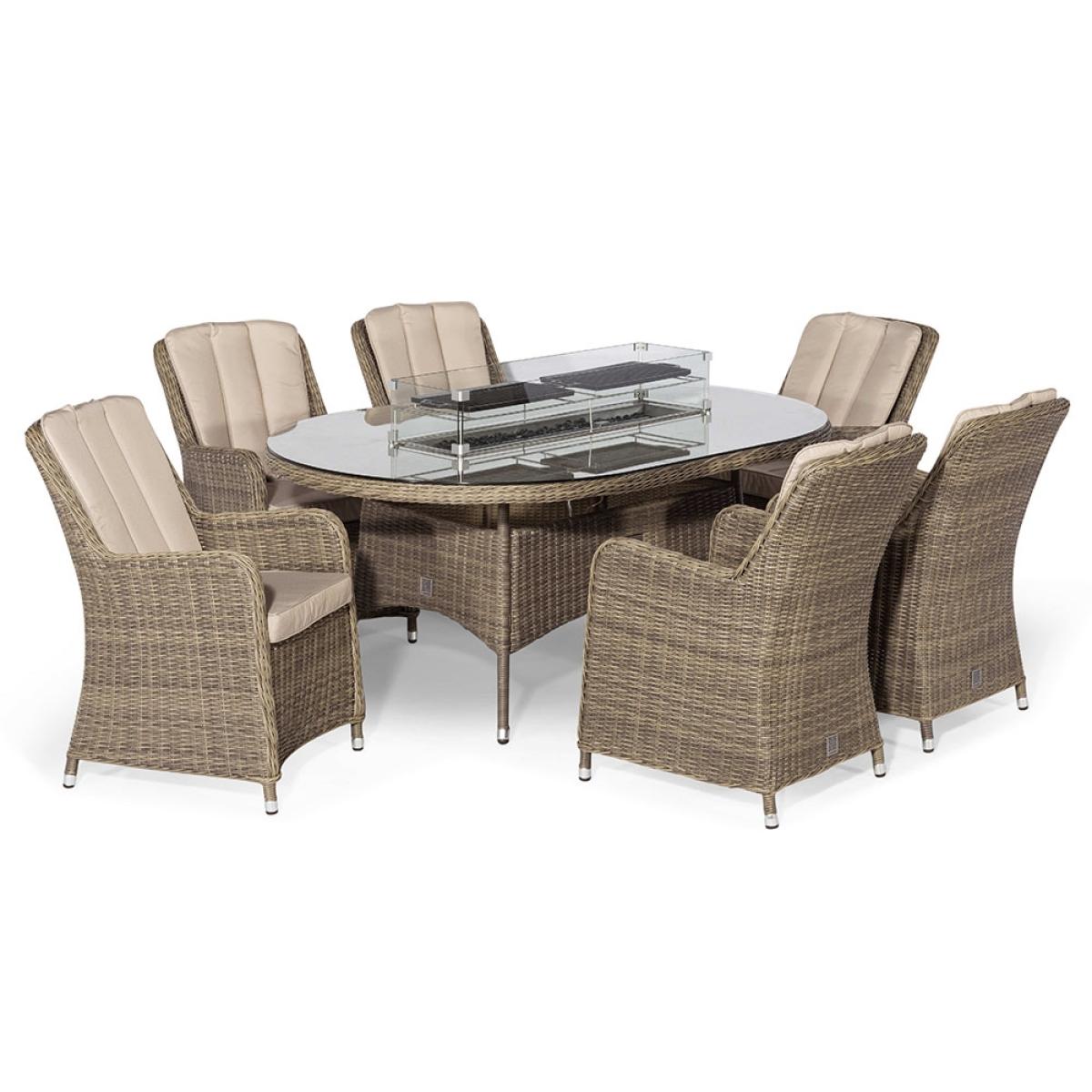 Enjoy those long summer evenings sat around the Winchester Oval Fire Pit Dining Set from Maze Rattan. With two table sizes available and either 6 or 8 seats, the stunning natural coloured weave pairs beautifully with the beige showerproof cushions, leaving you with an elegant set that will look stunning wherever it is placed. Manufactured from the highest quality PU rattan woven onto a powder coated aluminium frame, the integrated fire pit makes it ideal for BBQ's or just to create an intimate atmosphere in the evening. The high back Venice chairs offer plenty of comfort for you and your guests to sit back and relax well into the night!.