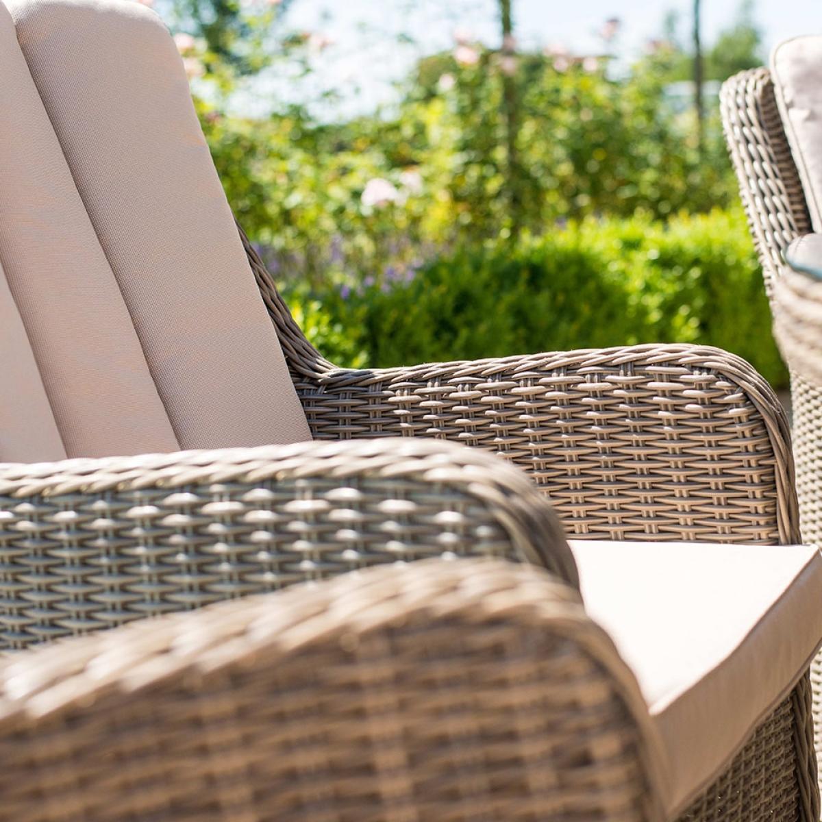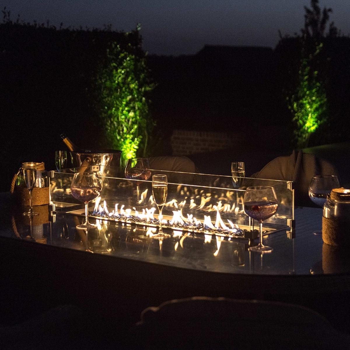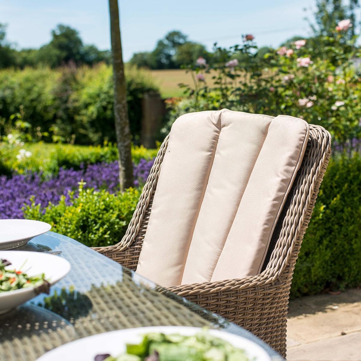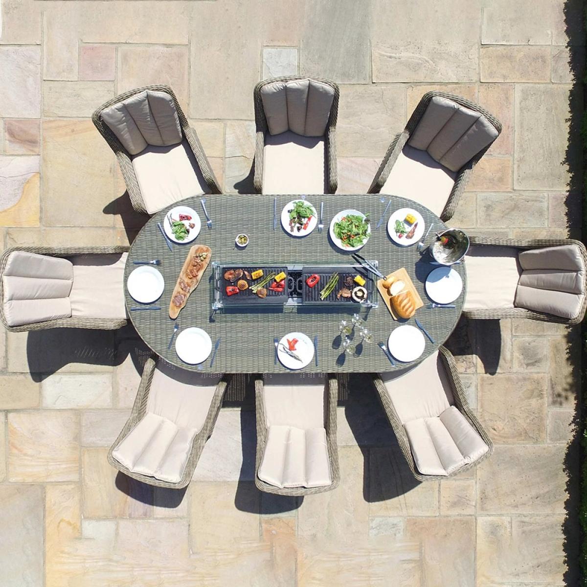 Enjoy those long summer evenings sat around the Winchester Oval Fire Pit Dining Set from Maze Rattan. With two table sizes available and either 6 or 8 seats, the stunning natural coloured weave pairs beautifully with the beige showerproof cushions, leaving you with an elegant set that will look stunning wherever it is placed. Manufactured from the highest quality PU rattan woven onto a powder coated aluminium frame, the integrated fire pit makes it ideal for BBQ's or just to create an intimate atmosphere in the evening. The high back Venice chairs offer plenty of comfort for you and your guests to sit back and relax well into the night!.