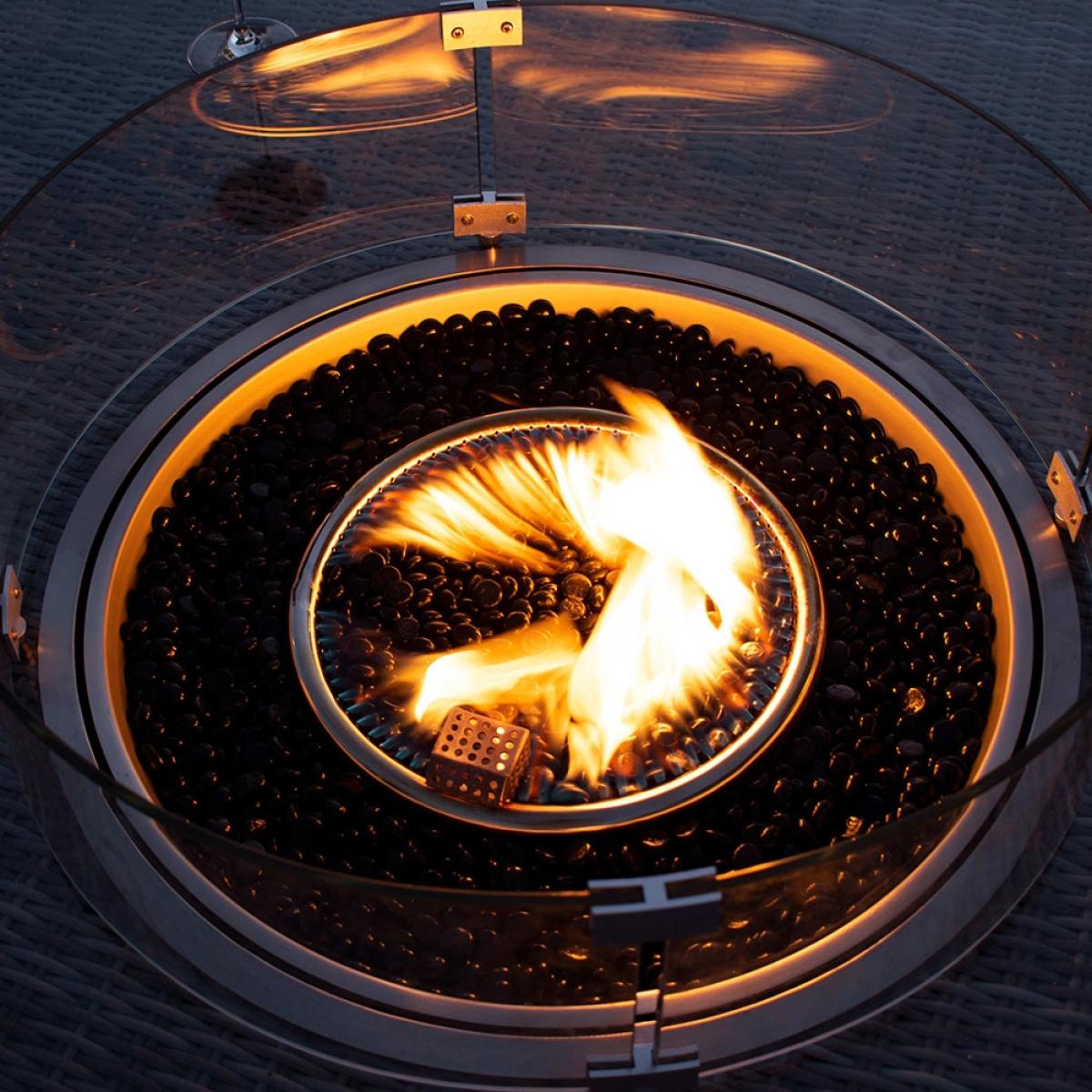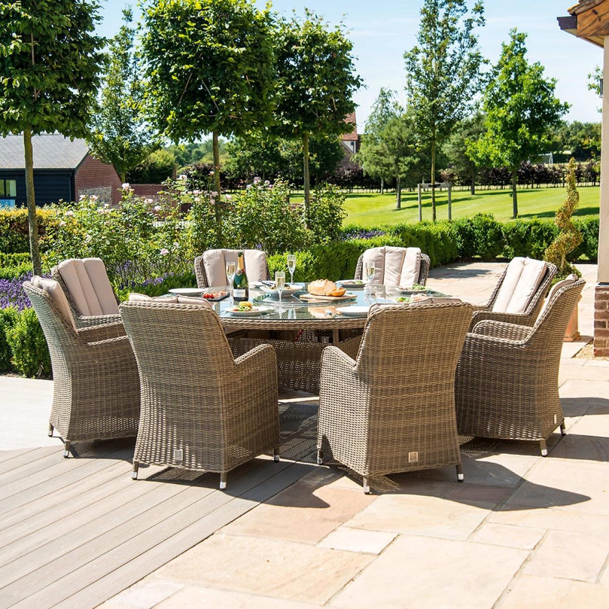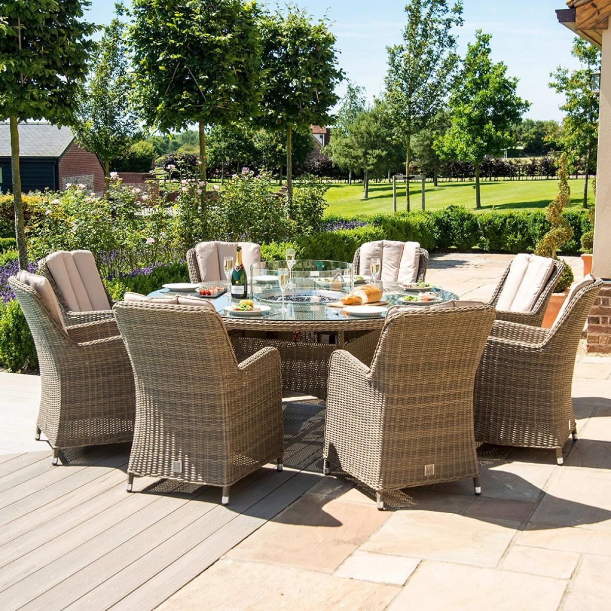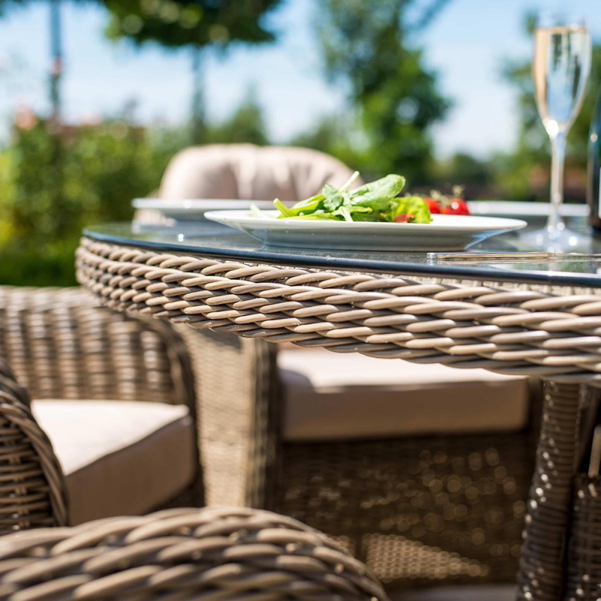 The Winchester Round Fire Pit Dining Set from Maze Rattan is the perfect way to enjoy those long summer evenings with friends and family. With an integrated fire pit this garden furniture set will have no trouble keeping you warm. Manufactured from the highest quality PU rattan woven onto a powder coated aluminium frame, the gorgeous natural coloured weave pairs beautifully with the beige showerproof cushions, leaving you with an elegant set that will look stunning wherever it is placed. Whilst the high back Venice chairs offer plenty of comfort for you and your guests to sit back and relax. Ideal for BBQ's or just to create a lovely atmosphere, you'll be able to enjoy yourselves will into the night!.