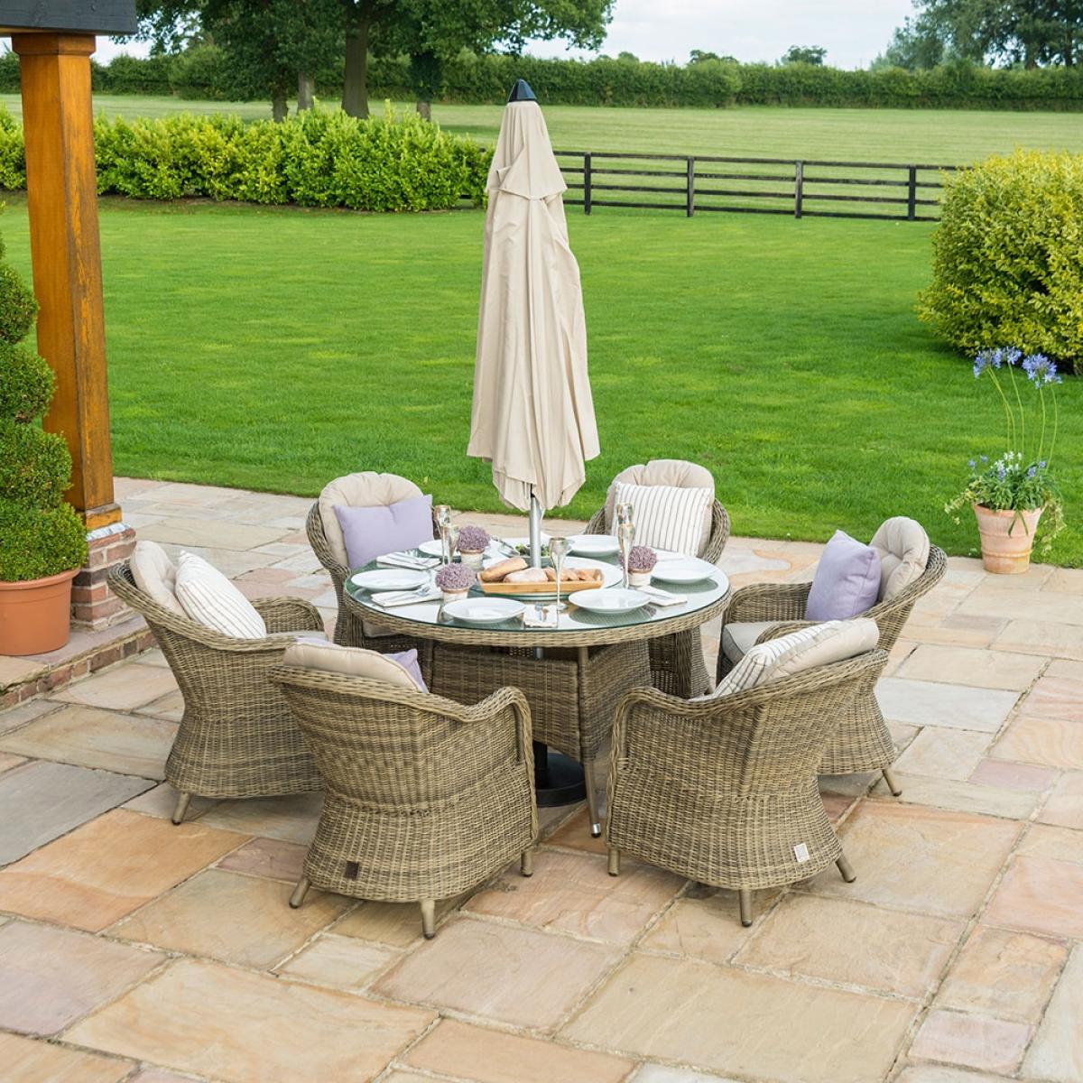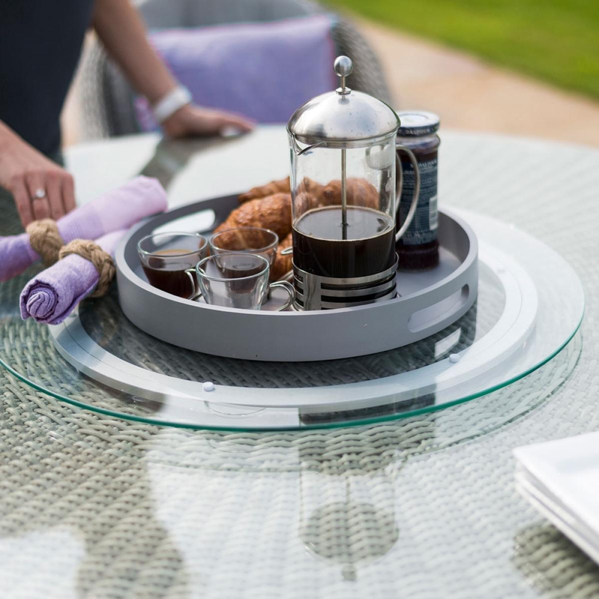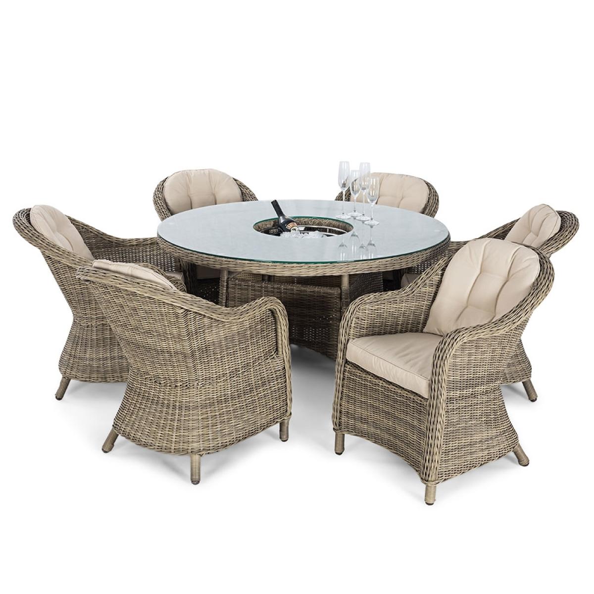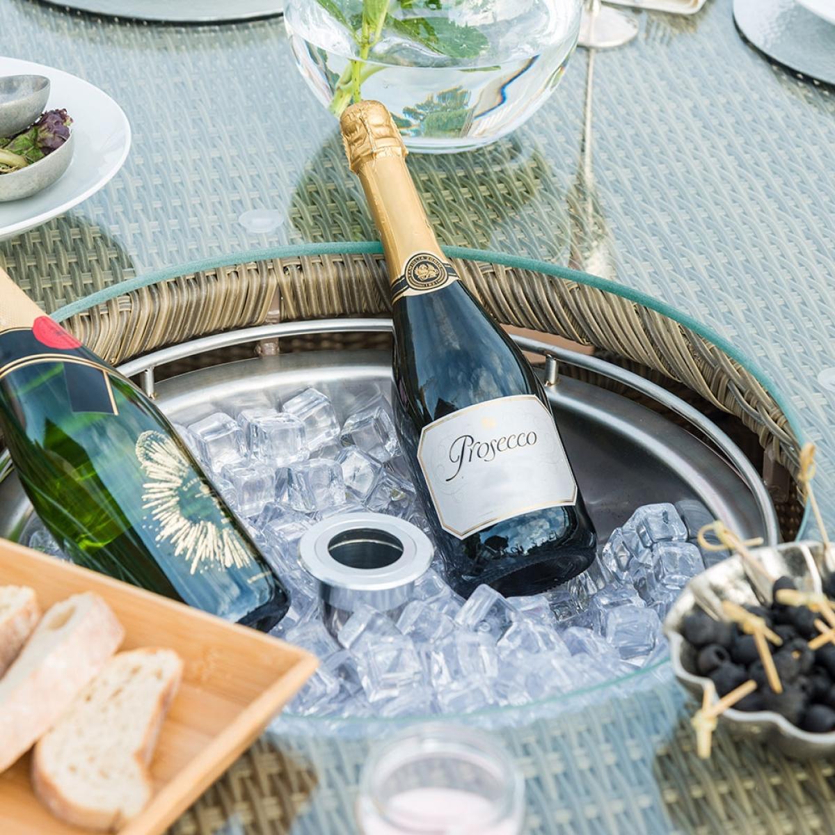 The Maze Rattan Winchester Round Ice Bucket Dining Set is the perfect way to keep your beverages cold on hot summer days. Manufactured from the highest quality PU rattan woven onto a powder coated aluminium frame, it comes with an integrated ice bucket and lazy susan, catering to all your needs. So if you're hosting a party and need the prosecco chilling on ice - no problem, or a cheeky lunch with friends where you want to share the olives; this table can do both. With space for a parasol, dine sheltered from the scorching sun! The subtle natural coloured weave and beige cushions pair beautifully together, giving a timeless finish. Use all year round, this fabulous garden furniture set can withstand even the harshest of weather.