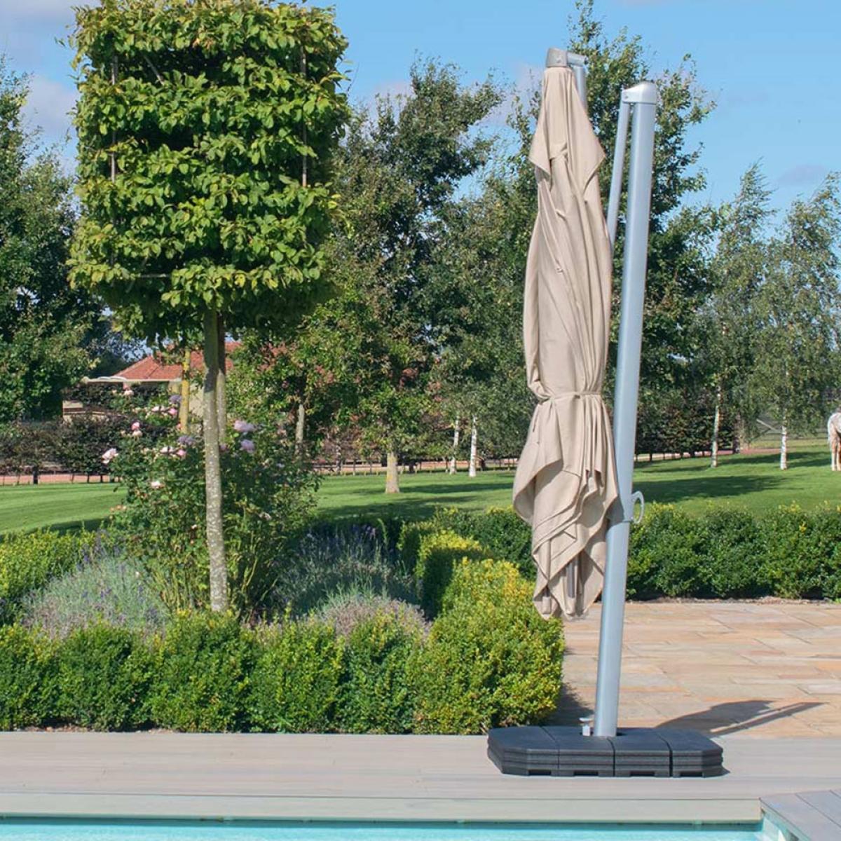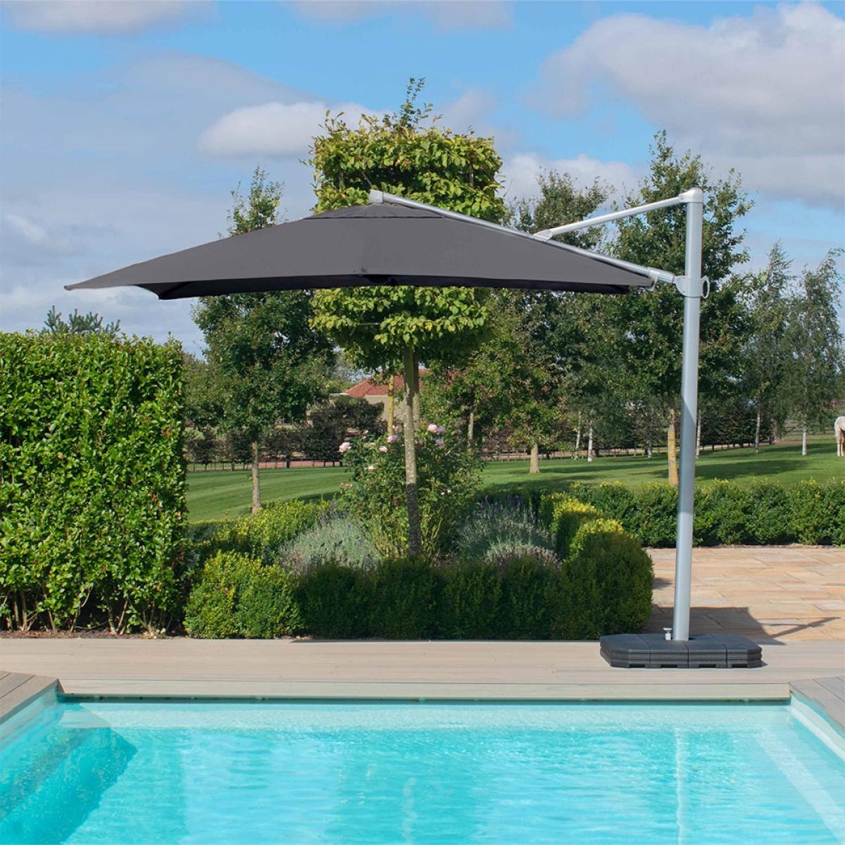 With the Maze Rattan Zeus 3m Square Rotating Cantilever Parasol With LED Lights, enjoy your outside space even on the hottest days! Offering protection from the sun; position over garden lounge sets, dining sets, hot tubs and sun loungers. Opening with a crank handle and rotating 360 degrees, easily change direction with the foot pedal mechanism and tilt the parasol in any direction to control your level of shade. And when the sun starts to set, the solar powered LED lighting allows you to continue enjoying your garden late into the evening. Available in a choice of colours, with a cantilever parasol base and protective PU cover included, select the sun shade to suit your patio!.